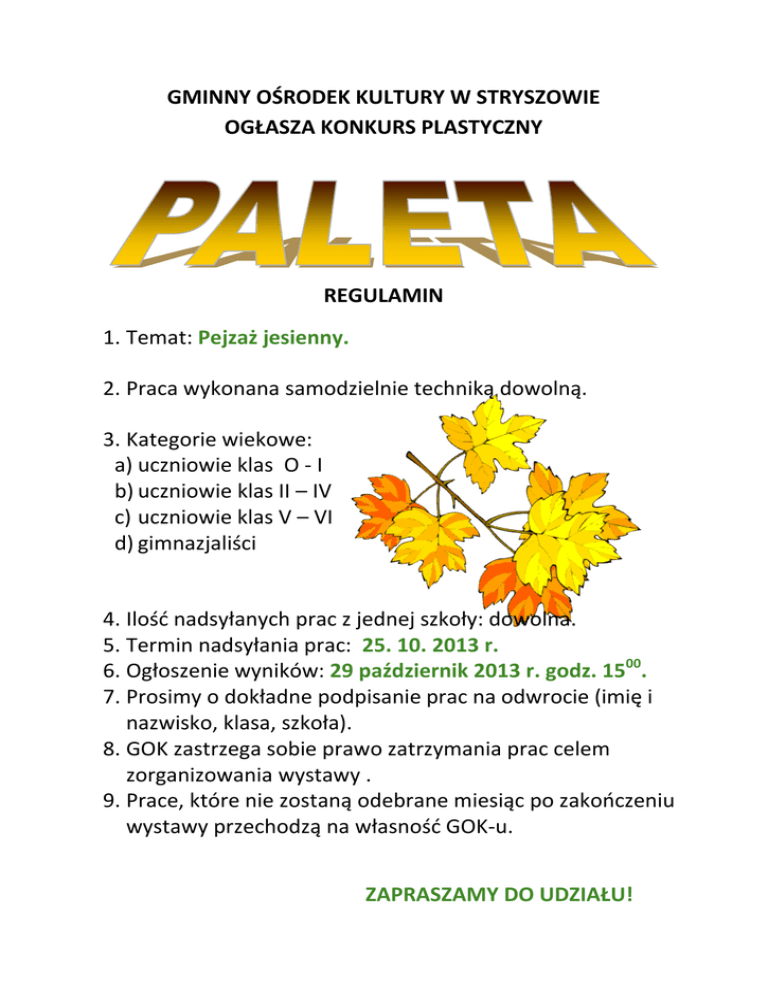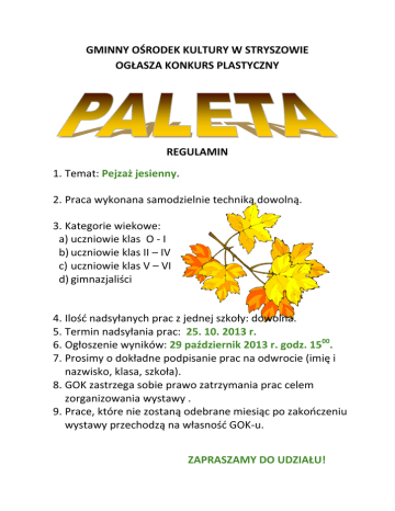 GMINNY OŚRODEK KULTURY W STRYSZOWIE OGŁASZA KONKURS PLASTYCZNY REGULAMIN 1. Temat: Pejzaż jesienny. 2. Praca wykonana samodzielnie techniką dowolną. 3. Kategorie wiekowe: a) uczniowie klas O - I b) uczniowie klas II – IV c) uczniowie klas V – VI d) gimnazjaliści 4. Ilość nadsyłanych prac z jednej szkoły: dowolna. 5. Termin nadsyłania prac: 25. 10. 2013 r. 6. Ogłoszenie wyników: 29 październik 2013 r. godz. 1500. 7. Prosimy o dokładne podpisanie prac na odwrocie (imię i nazwisko, klasa, szkoła). 8. GOK zastrzega sobie prawo zatrzymania prac celem zorganizowania wystawy . 9. Prace, które nie zostaną odebrane miesiąc po zakończeniu wystawy przechodzą na własność GOK-u. ZAPRASZAMY DO UDZIAŁU!