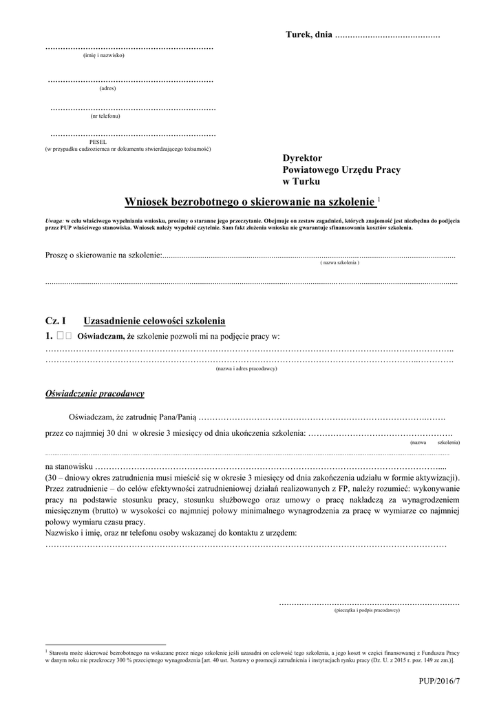 Turek, dnia .......................................... ................................................................... (imię i nazwisko) .................................................................. (adres) .................................................................. (nr telefonu) .................................................................. PESEL (w przypadku cudzoziemca nr dokumentu stwierdzającego tożsamość) Dyrektor Powiatowego Urzędu Pracy w Turku Wniosek bezrobotnego o skierowanie na szkolenie 1 Uwaga: w celu właściwego wypełniania wniosku, prosimy o staranne jego przeczytanie. Obejmuje on zestaw zagadnień, których znajomość jest niezbędna do podjęcia przez PUP właściwego stanowiska. Wniosek należy wypełnić czytelnie. Sam fakt złożenia wniosku nie gwarantuje sfinansowania kosztów szkolenia. Proszę o skierowanie na szkolenie:............................................................................................................................................ ( nazwa szkolenia ) ............................................................................................................................................ ......................................................... Cz. I Uzasadnienie celowości szkolenia 1. Oświadczam, że szkolenie pozwoli mi na podjęcie pracy w: …………………………………………………………………………………………………………….………………….. ……………………………………………………………………………………………………………………..…………. (nazwa i adres pracodawcy) Oświadczenie pracodawcy Oświadczam, że zatrudnię Pana/Panią ……………………………………………………………………….……. przez co najmniej 30 dni w okresie 3 miesięcy od dnia ukończenia szkolenia: ……………………………………………. (nazwa szkolenia) ……………………………………………………………………………………………………………………………………………………………………………………………………. na stanowisku …………………………………………………………………………………………………………….... (30 – dniowy okres zatrudnienia musi mieścić się w okresie 3 miesięcy od dnia zakończenia udziału w formie aktywizacji). Przez zatrudnienie – do celów efektywności zatrudnieniowej działań realizowanych z FP, należy rozumieć: wykonywanie pracy na podstawie stosunku pracy, stosunku służbowego oraz umowy o pracę nakładczą za wynagrodzeniem miesięcznym (brutto) w wysokości co najmniej połowy minimalnego wynagrodzenia za pracę w wymiarze co najmniej połowy wymiaru czasu pracy. Nazwisko i imię, oraz nr telefonu osoby wskazanej do kontaktu z urzędem: ……………………………………………………………………………………………………………………………… ........................................................................ (pieczątka i podpis pracodawcy) 1 Starosta może skierować bezrobotnego na wskazane przez niego szkolenie jeśli uzasadni on celowość tego szkolenia, a jego koszt w części finansowanej z Funduszu Pracy w danym roku nie przekroczy 300 % przeciętnego wynagrodzenia [art. 40 ust. 3ustawy o promocji zatrudnienia i instytucjach rynku pracy (Dz. U. z 2015 r. poz. 149 ze zm.)]. PUP/2016/7 Oświadczam, że odbycie szkolenia umożliwi mi podjęcie działalności gospodarczej: 2. ……………………………………………………………………………………………………………….………………… (rodzaj działalności) Podjęte działania w celu rozpoczęcia działalności gospodarczej (np. lokal, zezwolenia, umowy wstępne itp.) 1. …………………………………………………………………………………………………………………………… …………………………………………………………………………………………………………………………… ……………………………………………………………………………………………………………..……………… ………………………………….…………………………………………………………………………………………. Planowany termin rozpoczęcia działalności i miejsce prowadzenia działalności: 2. ……………………………………………………………………………………………………………………………… Inne uzasadnienie celowości szkolenia -opisać podjęte działania, z których wynika, iż ukończenie wskazanego szkolenia daje szanse na uzyskanie zatrudnienia (sposoby kontaktowania się z pracodawcami, ilość wykonanych kontaktów, ustalenia, wnioski z odbytych rozmów): 3. ………………………………………………………………………………………………………………………………… ………………………………………………………………………………………………………………………………… ………………………………………………………………………………………………………………………………… ………………………………………………………………………………………………………………………………… ………………………………………………………………………………………………………………………………… ………………………………………………………………………………………………………………………………… ………………………………………………………………………………………….……………
