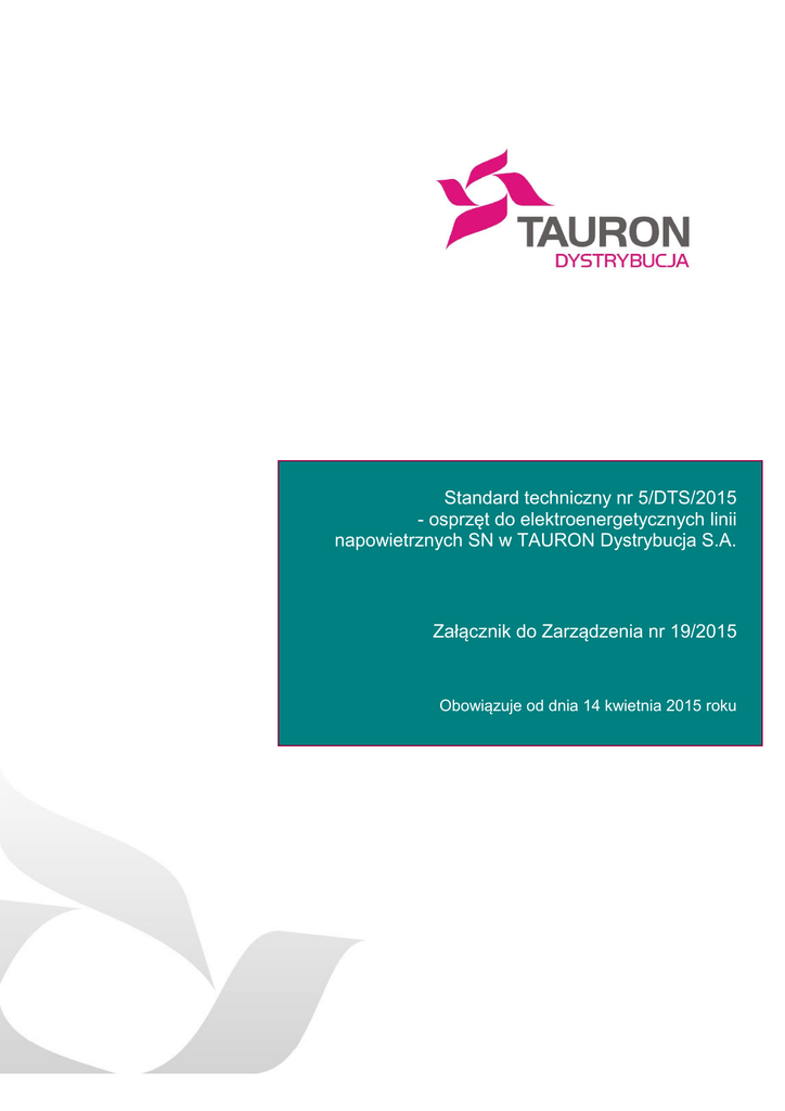 Standard techniczny nr 5/DTS/2015 - osprzęt do elektroenergetycznych linii napowietrznych SN w TAURON Dystrybucja S.A. Załącznik do Zarządzenia nr 19/2015 Obowiązuje od dnia 14 kwietnia 2015 roku Standard techniczny nr 5/DTS/2015 - osprzęt do elektroenergetycznych linii napowietrznych SN w TAURON Dystrybucja S.A. Strona 2 z 11 Spis treści 1 Podstawa opracowania ............................................................................................................... 4 2 Zakres stosowania ...................................................................................................................... 4 3 Opis zmian .................................................................................................................................. 4 4 Definicje ...................................................................................................................................... 4 5 Cel opracowania ......................................................................................................................... 4 6 Standard osprzętu do niepełnoizolowanych linii napowietrznych SN – wymagania techniczne ... 4 6.1 Warunki klimatyczne ................................................................................................................... 4 6.2 Wymagania ogólne. .................................................................................................................... 5 6.3 Wymagania dotyczące konstrukcji. ............................................................................................. 5 6.4 Wymagania dotyczące oznakowania. ......................................................................................... 6 6.5 Wymagania szczegółowe dla osprzętu do napowietrznych linii elektroenergetycznych niepełnoizolowanych SN. ............................................................................................................ 6 6.6 Wymagania dla osprzętu do linii napowietrznych z przewodami izolowanymi (kable uniwersalne). ................................................................................................................................................... 7 6.7 Wymagania dla osprzętu do linii napowietrznych z przewodami izolowanymi (kable z linką nośną)......................................................................................................................................... 8 6.8 Wykaz załączników ..................................................................................................................... 8 7 Standard osprzętu do nieizolowanych (gołych) linii napowietrznych SN – wymagania techniczne ................................................................................................................................................... 9 7.1 Warunki klimatyczne. .................................................................................................................. 9 7.2 Wymagania ogólne. .................................................................................................................... 9 7.3 Wymagania dotyczące konstrukcji. ............................................................................................. 9 7.4 Wymagania dotyczące oznakowania. ........................................................................................10 7.5 Wymagania szczegółowe dla osprzętu do nieizolowanych linii napowietrznych SN. ..................10 7.6 Wykaz załączników ....................................................................................................................10 8 Wymagane dokumenty/Karty katalogowe ..................................................................................11 8.1 Wymagane dokumenty ..............................................................................................................11 8.2 Karty katalogowe .......................................................................................................................11 8.3 Instrukcja montażu .....................................................................................................................11 8.4 Dokumenty potwierdzające zgodność z normami i niniejszymi wymaganiami. ...........................11 8.5 Język dokumentacji....................................................................................................................11 Standard techniczny nr 5/DTS/2015 - osprzęt do elektroenergetycznych linii napowietrznych SN w TAURON Dystrybucja S.A. Strona 3 z 11 1 Podstawa opracowania Podstawą niniejszego Standardu są: - normy wg Załącznika nr 1 do niniejszego Standardu, - powszechnie uznane zasady wiedzy technicznej. 2 Zakres stosowania 2.1 Standard techniczny nr 5/DTS/2014 - osprzęt do elektroenergetycznych linii napowietrznych SN w TAURON Dystrybucja S.A. (dalej: Standard) zawiera podstawowe wymagania techniczne, które powinien spełniać osprzęt do linii napowietrznych SN. 2.2 Standard obowiązuje od dnia jego wprowadzenia stosownym Zarządzeniem Prezesa Zarządu TAURON Dystrybucja S.A. i należy go stosować w przypadku: modernizacji i przebudowy linii napowietrznych i przyłączy SN, inwestycji związanych z budową nowych linii i przyłączy SN, eksploatacji istniejących napowietrznych linii SN. 2.3 Rozwiązania odbiegające od wymagań zawartych w Standardzie powinny uzyskać akceptację Biura Standaryzacji TAURON Dystrybucja S.A. zgodnie z obowiązującymi w tym zakresie procedurami. 2.4 Zmiana treści Załączników do niniejsze Standardu jest dokonywana samodzielną decyzją Dyrektora Departamentu, w kompetencjach którego leży obszar standaryzacji w TAURON Dystrybucja S.A., o ile zmiany te nie stoją w sprzeczności z postanowieniami obowiązujących regulacji wewnętrznych i wewnątrzkorporacyjnych. Wskazane zmiany nie są traktowane, jako zmiana samego Standardu. Projekty zmian Załączników opracowuje i przedstawia Dyrektorowi Departamentu Biuro Standaryzacji. 2.5 W