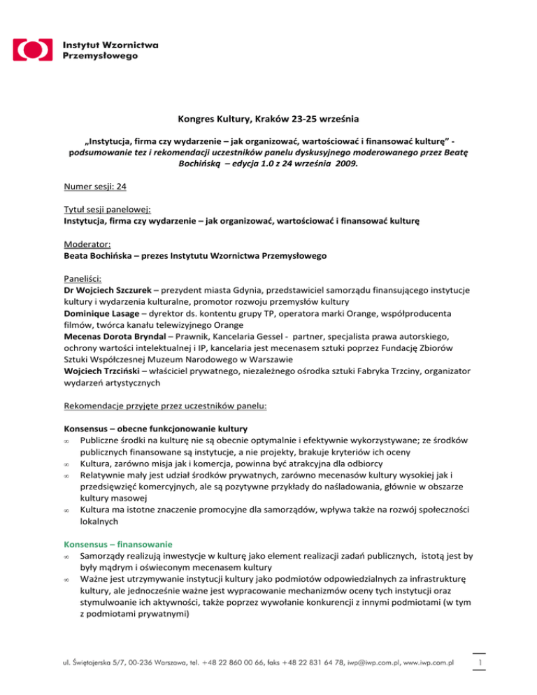 Kongres Kultury, Kraków 23-25 września „Instytucja, firma czy wydarzenie – jak organizować, wartościować i finansować kulturę” podsumowanie tez i rekomendacji uczestników panelu dyskusyjnego moderowanego przez Beatę Bochińską – edycja 1.0 z 24 września 2009. Numer sesji: 24 Tytuł sesji panelowej: Instytucja, firma czy wydarzenie – jak organizować, wartościować i finansować kulturę Moderator: Beata Bochińska – prezes Instytutu Wzornictwa Przemysłowego Paneliści: Dr Wojciech Szczurek – prezydent miasta Gdynia, przedstawiciel samorządu finansującego instytucje kultury i wydarzenia kulturalne, promotor rozwoju przemysłów kultury Dominique Lasage – dyrektor ds. kontentu grupy TP, operatora marki Orange, współproducenta filmów, twórca kanału telewizyjnego Orange Mecenas Dorota Bryndal – Prawnik, Kancelaria Gessel - partner, specjalista prawa autorskiego, ochrony wartości intelektualnej i IP, kancelaria jest mecenasem sztuki poprzez Fundację Zbiorów Sztuki Współczesnej Muzeum Narodowego w Warszawie Wojciech Trzciński – właściciel prywatnego, niezależnego ośrodka sztuki Fabryka Trzciny, organizator wydarzeń artystycznych Rekomendacje przyjęte przez uczestników panelu: Konsensus – obecne funkcjonowanie kultury • Publiczne środki na kulturę nie są obecnie optymalnie i efektywnie wykorzystywane; ze środków publicznych finansowane są instytucje, a nie projekty, brakuje kryteriów ich oceny • Kultura, zarówno misja jak i komercja, powinna być atrakcyjna dla odbiorcy • Relatywnie mały jest udział środków prywatnych, zarówno mecenasów kultury wysokiej jak i przedsięwzięć komercyjnych, ale są pozytywne przykłady do naśladowania, głównie w obszarze kultury masowej • Kultura ma istotne znaczenie promocyjne dla samorządów, wpływa także na rozwój społeczności lokalnych Konsensus – finansowanie • Samorządy realizują inwestycje w kulturę jako element realizacji zadań publicznych, istotą jest by były mądrym i oświeconym mecenasem kultury • Ważne jest utrzymywanie instytucji kultury jako podmiotów odpowiedzialnych za infrastrukturę kultury, ale jednocześnie ważne jest wypracowanie mechanizmów oceny tych instytucji oraz stymulwoanie ich aktywności, także poprzez wywołanie konkurencji z innymi podmiotami (w tym z podmiotami prywatnymi) 1 • • • • Prywatna inwestycja w kulturę musi opierać się na rachunku ekonomicznym, na dwa sposoby: poprzez osiągnięcie pozytywnych wskaźników ekonomicznych z realizowanych projektów lub poprzez budowę wizerunku Istnieją prywatne podmioty (takie jak firmy z rozpoznawalnymi markami np. Orange) które przeznaczają istotne środki na kulturę jako: mecenasi, sponsorzy, wreszcie traktując kulturę jako składnik własnych produktów (treść) Istotne jest funkcjonowanie ograniczonej liczby instytucji kultury finansowanych publicznie, szczególnie w obszarze ochrony dziedzictwa narodowego i kultury wysokiej Zmiany w odbiorze kultury, w tym Internet, pozwalają na nowe modele finansowania kultury jako udostępnionych treści, z reklamy, z opłaty za dostęp, obok tradycyjnej opłaty za prawa autorskie Konsensus – rekomendacje zmian • • • • Równość dostępu do środków publicznych: o Podmioty ze wszystkich sfer (publicznej, prywatnej i obywatelskiej) powinny mieć prawo do ubiegania się na zasadach konkursowych o publiczne finansowanie celowe. Mechanizmy publicznego finansowania kultury powinny przewidzieć fakt, że prywatni przedsiębiorcy działają w celu osiągania zysku. o Zmniejszenie liczby publicznie finansowanych instytucji kultury w Polsce, teatrów z własną sceną, placówek muzycznych z budowaną własną salą koncertową, mało znaczących muzeów i symbolicznych jednorazowych dotacji dla rozlicznych organizacji pozarządowych; Pobudzenie prywatnych nakładów na kulturę o Wprowadzenie efektywnych narządzi motywujących przedstawicieli sektora prywatnego do inwestycji w kulturę, zwiększyłoby ich aktywność; mecenat i finansowanie prywatne powinny być traktowane jako równorzędne formy finansowania kultury, nie zaś jako uzupełnienie. o Korzystne rozwiązania natury fiskalnej (analogicznie do 1% odpisu celowego z CIT jak to ma miejsce w przypadku PIT, czy też innych preferencji podatkowych, jak dofinansowanie w obszarze składek np. na ZUS dla przedsiębiorców zatrudniających osoby z obszaru kultury i twórczości) o Promocja mecenatu prywatnego jako dziedziny społecznej odpowiedzialności firm o Partnerstwo publiczno-prywatne w obszarze kultury wraz z pojawianiem się silnych podmiotów prywatnych mających kompetencje i zasoby dle realizacji dużych, wielotelnich projektów Obiektywne kryteria oceny i wartościowania kultury, zarządzanie kulturą o Wprowadzenie systemu oceny jakości funkcjonowania instytucji kulturalnych i projektów oraz powiązanie zasad przyznawania środków finansowych z systemem oceny jakości propozycji tych instytucji o Studia zarządzania kulturą na kierunkach zarządzania, zamawiane studia podyplomowe dla menadżerów kultury E-kultura: o Pilne jest wypracowanie modelu pozwalającego na pogodzenie swobody dostępu z prawem do własności intelektualnej, we współpracy w ramach UE. Dotyczy to szczególnie kultury masowej. o Promowanie nowoczesnego współuczestnictwa w e-kulturze, swobodnego udostępniania treści Tematy kluczowe w dyskusji: 2 • • • • • Forma prawna i organizacyjna instytucji zajmujących się działaniami związanymi z obszarem kultury (w świetle raportu o stanie kultury - wynika, że kultura co innego znaczy i gdzie indziej się dzieje) i odniesienie się do ustawy o finansowaniu instytucji kultury Państwowe - prywatne, samorządowe – pozarządowe, instytucja – wydarzenie; za i przeciw (finanse, skala działania, niezależność, partnerstwo, zasoby…) - doświadczenia panelistów Przemysły kultury i ich postrzeganie w kontekście wzros