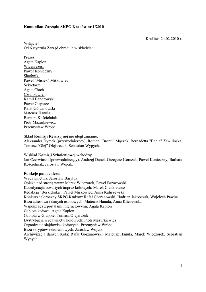 Komunikat Zarządu SKPG Kraków nr 1.2010