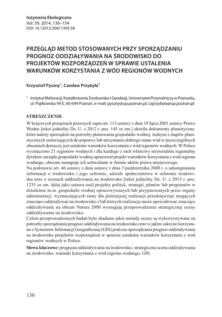 Inżynieria Ekologiczna Vol. 39, 2014, 136–154 DOI: 10.12912/2081139X.58 PRZEGLĄD METOD STOSOWANYCH PRZY SPORZĄDZANIU PROGNOZ ODDZIAŁYWANIA NA ŚRODOWISKO DO PROJEKTÓW ROZPORZĄDZEŃ W SPRAWIE USTALENIA WARUNKÓW KORZYSTANIA Z WÓD REGIONÓW WODNYCH Krzysztof Pyszny1, Czesław Przybyła1 1 Instytut Melioracji, Kształtowania Środowiska i Geodezji, Uniwersytet Przyrodniczy w Poznaniu, ul. Piątkowska 94 E, 60-649 Poznań, e-mail: [email protected]; [email protected] STRESZCZENIE W krajowych przepisach prawnych zapis art. 113 ustawy z dnia 18 lipca 2001 ustawy Prawo Wodne [tekst jednolity Dz. U. z 2012 r. poz. 145 ze zm.] określa dokumenty planistyczne, które należy sporządzić na potrzeby planowania gospodarki wodnej. Jednym z etapów planistycznych zmierzających do poprawy lub utrzymania dobrego stanu wód w poszczególnych obszarach dorzeczy jest ustalenie warunków korzystania z wód regionów wodnych. W Polsce wyznaczono 21 regionów wodnych i dla każdego z nich właściwy terytorialnie regionalny dyrektor zarządu gospodarki wodnej opracował projekt warunków korzystania z wód regionu wodnego, obecnie następuje ich uchwalanie w formie aktów prawa miejscowego. Na podstawie art. 46 ustawy z dnia ustawy z dnia 3 października 2008 r. o udostępnianiu informacji o środowisku i jego ochronie, udziale społeczeństwa w ochronie środowiska oraz o ocenach oddziaływania na środowisko [tekst jednolity Dz. U. z 2013 r. poz. 1235 ze zm. dalej jako ustawa ooś] projekty polityk, strategii, planów lub programów w dziedzinie m.in. gospodarki wodnej opracowywanych lub przyjmowanych przez organy administracji, wyznaczających ramy dla późniejszej realizacji przedsięwzięć mogących znacząco oddziaływać na środowisko i/lub których realizacja może spowodować znaczące oddziaływanie na obszar Natura 2000 wymagają przeprowadzenia strategicznej oceny oddziaływania na środowisko. Celem przeprowadzonych badań było zbadanie jakie metody oceny są wykorzystywane na potrzeby sporządzania prognoz oddziaływania na środowisko oraz w jakim zakresie korzystano z Systemów Informacji Geograficznej (GIS) podczas sporządzania prognoz oddziaływania na środowisko projektów rozporządzeń w sprawie ustalenia warunków korzystania z wód regionów wodnych w Polsce. Słowa kluczowe: prognoza oddziaływania na środowisko, strategiczna ocena oddziaływania na środowisko, warunki korzystania z wód regionu wodnego, GIS. 136 Inżynieria Ekologiczna 39, 2014 REVIEW OF THE METHODS USED IN STRATEGIC ENVIRONMENTAL ASSESSMENT OF PROJECTS OF REGULATIONS ON DETERMINING THE USE OF WATER CONDITIONS IN WATER REGIONS ABSTRACT In Polish legislation, Article 113 of the Water Law Act of 18 July 2001 (Journal of Laws of 2012 item 145, as amended) specifies certain planning documents, which must be made for the purposes of water management planning. One of the planning stages leading to improvement or preservation of good environmental status of water in the individual river basins, is to determinate water use conditions in water regions. There are 21 water regions in Poland, for each one of them, territorially competent Director of the Regional Water Management Authority compiled the project of water use conditions in water regions. Currently, the conditions are being adopted in the form of local law. Pursuant to Article 46 of the Act of 3 October 2008 On the Provision of Information on the Environment and its Protection, Public Participation in Environmental Protection and Environmental Impact Assessment (Journal of Laws of 2013 item 1235, as amended), projects of policies, strategies, plans or programs relating to, inter alia water management, developed or adopted by the authorities, defining the framework for the subsequent implementation of projects that may significantly affect the environment and/or cause a significant impact on a Natura 2000 area, requires strategic environmental assessment. The aim of this study was to determine what methods of assessment are used for the strategic environmental assessment, and what is the range of usage of Geographic Information Systems (GIS) in strategic environmental assessment of projects of regulations on determining the conditions for use of water in water regions in Poland. Based on the analysis it can be concluded that in most of the analyzed documents, the assessment criteria are not explicitly defined and not applying quantitative methods of forecasting the impact on the environment makes it impossible to compare the nature and primarily the scale of the impact on the individual components of the environment.Wider use of Geographic Information Systems in strategic environmental assessment is recommended, not only for data visualization but mainly for the use of tools helping to conduct spatial analysis and decision making. The results confirm that methods currently used in strategic environmental assessment are not sufficiently rewarding and provide technical and methodological challenge for experts working on their development. Solving the problem requires the development of more innovative and effective methods of evaluation. Keywords: strategic environmental assessment, water use conditions in water regions, GIS. WSTĘP Planowanie w gospodarowaniu wodami wymaga odpowiednich dokumentów planistycznych, które są oceną istniejącego stanu faktycznego w stosunku do stanu pożądanego [Kałużny 2012]. W krajowych przepisach prawnych zapis art. 113 ustawy z dnia 18 lipca 2001 ustawy Prawo Wodne [tekst jednolity Dz. U. z 2012 r. poz. 145 ze zm.] określa dokumenty planistyczne, które należy sporządzić na potrzeby planowania 137 Inżynieria Ekologiczna 39, 2014 gospodarki wodnej. Literalnie zostały w nim wymienione następujące dokumenty: program wodno-środowiskowy kraju, plan gospodarowania wodami na obszarze dorzecza, plan zarządzania ryzykiem powodziowym, plan przeciwdziałania skutkom suszy na obszarze dorzecza, warunki korzystania