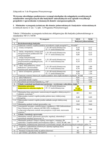Załącznik nr 3 do Programu Priorytetowego Wytyczne określające podstawowe wymogi niezbędne do osiągnięcia oczekiwanych standardów energetycznych dla budynków mieszkalnych oraz sposób weryfikacji projektów i sprawdzenia wykonanych domów energooszczędnych. I. Minimalne wymagania techniczne dla domów jednorodzinnych i budynków wielorodzinnych (o których mowa w ust. 7.2 pkt. 1) Programu Priorytetowego) Tabela 1.Minimalne wymagania techniczne obligatoryjne dla budynku jednorodzinnego w standardzie NF15 i NF40 Lp. 1. 1.1 a) b) c) d) e) 1.2. a) b) 1.3 2. 2.1. 2.2 2.3 2.4 2.5 2.6 3. 3.1 3.2 3.3 a) b) c) Wymaganie NF15 NF40 Budynek jednorodzinny Bryła/konstrukcja budynku Graniczne wartości współczynników przenikania ciepła przegród U max, W/m2K1) - ściany zewnętrzne I, II i III strefa klimatyczna 0,10 0,15 IV i V strefa klimatyczna 0,08 0,12 - dachy, stropodachy i stropy pod I, II i III strefa klimatyczna 0,10 0,12 nieogrzewanymi poddaszami lub IV i V strefa klimatyczna 0,08 0,10 nad przejazdami - stropy nad piwnicami nieogrzewanymi i zamkniętymi I, II i III strefa klimatyczna 0,12 0,20 przestrzeniami podpodłogowymi, IV i V strefa klimatyczna 0,10 0,15 podłogi na gruncie - okna, okna połaciowe, drzwi I, II i III strefa klimatyczna 0,80 1,00 balkonowe i powierzchnie IV i V strefa klimatyczna 0,70 0,80 przezroczyste nieotwieralne - drzwi zewnętrzne, garażowe I, II i III strefa klimatyczna 0,80 1,30 IV i V strefa klimatyczna 0,70 1,30 Graniczne wartości liniowych współczynników strat ciepła mostków cieplnych , W/mK - płyty balkonowe 0,01 0,20 - pozostałe mostki cieplne 0,01 0,10 Szczelność powietrzna budynku n50, 1/h2) 0,6 1,00 Układy wentylacji mechanicznej nawiewno - wywiewnej z odzyskiem ciepła 3) Minimalna sprawność I, II i III strefa klimatyczna 90 85 temperaturowa odzysku ciepła, % IV i V strefa klimatyczna 93 lub 85 90+GWC4) Minimalna klasa sprawności zastosowanych napędów elektrycznych w IE3 IE2 układzie wentylacji 5) Maksymalna wartość współczynnika poboru mocy elektrycznej, 0,40 0,40 W/(m3/h) Maksymalna wartość współczynnika nakładu energii elektrycznej, 0,40 0,40 Wh/m3 Minimalna grubość izolacji przewodów, cm 10,0 10,0 Automatyka sterująca, umożliwiająca współpracę z ISD (Infrastruktura Sieci Domowych) w zakresie 60/100/150% wydajności, TAK TAK wyłączenia/włączenia centrali oraz przejścia w tryb letni, sterowanie 6) czasowe. Układy i instalacje ogrzewania Minimalna wartość sprawności przesyłu, regulacji, akumulacji i 92 90 dystrybucji instalacji grzewczej, % Minimalne grubości izolacji cieplnej rurociągów i armatury dla 25 20 materiału o współczynniku przewodzenia ciepła λ = 0,035 W/mK, mm Minimalna, średnioroczna sprawność wytwarzania energii, dla poszczególnych rodzajów paliw, % - węglowe z paleniskiem retortowym i płynną regulacją mocy 85 85 grzewczej (od 30 do 100%) - biomasa (wyłącznie kotły na paliwa drzewne) 82 82 - gaz ziemny, gaz płynny, olej opałowy 102 102 1 d) e) f) 3.4 3.5 3.6 4. 4.1 4.2 a) b) c) d) e) f) 4.3 4.4 4.5 - pompy ciepła 350 350 (COP) (3,5) (3,5) - system ciepłowniczy 98 98 - energia elektryczna 99 99 Wyposażenie instalacji w automatykę pogodową i urządzenia TAK TAK umożliwiające regulację temperatury w pomieszczeniach Minimalna klasa sprawności zastosowanych napędów elektrycznych w IE3 IE2 układzie ogrzewania 5) Minimalna klasa efektywności energetycznej pomp cyrkulacyjnych, A B obiegowych i ładujących w układzie ogrzewania. Układy i instalacje do przygotowania ciepłej wody użytkowej Minimalne grubości izolacji cieplnej rurociągów i armatury dla 40 30 materiału o współczynniku przewodzenia ciepła λ = 0,035 W/mK, mm Minimalna średnioroczna sprawność wytwarzania energii, dla poszczególnych rodzajów paliw, % - węglowe z paleniskiem retortowym i płynną regulacją mocy 85 85 grzewczej (od 30 do 100%) - biomasa (wyłącznie kotły na paliwa drzewne) 82 82 - gaz ziemny, gaz płynny, olej opałowy 102 102 - pompy ciepła 350 350 (COP) (3,5) (3,5) - system ciepłowniczy 98 98 - energia elektryczna 99 99 Wyposażenie instalacji w armaturę regulacyjną i systemy TAK TAK elektronicznego sterowania pracą obiegów cyrkulacyjnych. Minimalna klasa sprawności zastosowanych napędów elektrycznych w IE3 IE2 układzie przygotowania cwu 5) Minimalna klasa efektywności energetycznej pomp cyrkulacyjnych, A B obiegowych i ładujących w układzie przygotowania cwu. Tabela 2. Minimalne wymagania techniczne obligatoryjne dla budynku wielorodzinnego w standardzie NF15 i NF40 Lp. 1. 1.1 a) b) c) d) e) 1.2. a) b) 1.3 2. 2.1. 2.2 2.3 Wymaganie NF15 NF40 Budynek wielorodzinny Bryła/konstrukcja budynku Graniczne wartości współczynników przenikania ciepła przegród Umax, W/m2K1) - ściany zewnętrzne I, II i III strefa klimatyczna 0,15 IV i V strefa klimatyczna 0,12 - dachy, stropodachy i stropy pod I, II i III strefa klimatyczna 0,12 nieogrzewanymi poddaszami lub IV i V strefa klimatyczna 0,12 nad przejazdami - stropy nad piwnicami nieogrzewanymi i zamkniętymi I, II i III strefa klimatyczna 0,15 przestrzeniami podpodłogowymi, IV i V strefa klimatyczna 0,15 podłogi na gruncie - okna, okna połaciowe, drzwi I, II i III strefa klimatyczna 0,80 balkonowe i powierzchnie IV i V strefa klimatyczna 0,80 przezroczyste nieotwieralne - drzwi zewnętrzne, garażowe I, II i III strefa klimatyczna 1,00 IV i V strefa klimatyczna 1,00 Graniczne wartości liniowych współczynników strat ciepła mostków cieplnych , W/mK - płyty balkonowe 0,01 - pozostałe mostki cieplne 0,01 Szczelność powietrzna budynku n50, 1/h2) 0,6 Układy wentylacji mechanicznej nawiewno - wywiewnej z odzyskiem ciepła 3) Minimalna sprawność I, II i III strefa klimatyczna 80 temperaturowa odzysku ciepła, % IV i V strefa klimatyczna 90 Minimalna klasa sprawności zastosowanych napędów elektrycznych w IE3 układzie wentylacji 5) Maksymalna wartość współczynnika poboru mocy elektry