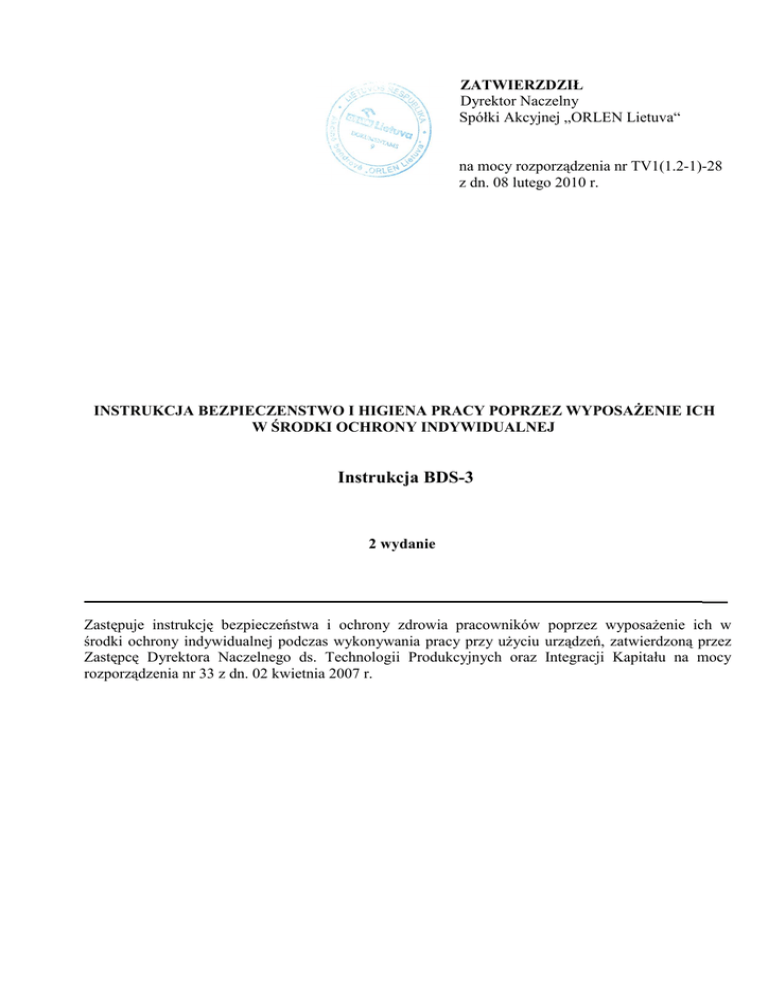 ZATWIERZDZIŁ Dyrektor Naczelny Spółki Akcyjnej „ORLEN Lietuva“ na mocy rozporządzenia nr TV1(1.2-1)-28 z dn. 08 lutego 2010 r. INSTRUKCJA BEZPIECZENSTWO I HIGIENA PRACY POPRZEZ WYPOSAŻENIE ICH W ŚRODKI OCHRONY INDYWIDUALNEJ Instrukcja BDS-3 2 wydanie Zastępuje instrukcję bezpieczeństwa i ochrony zdrowia pracowników poprzez wyposażenie ich w środki ochrony indywidualnej podczas wykonywania pracy przy użyciu urządzeń, zatwierdzoną przez Zastępcę Dyrektora Naczelnego ds. Technologii Produkcyjnych oraz Integracji Kapitału na mocy rozporządzenia nr 33 z dn. 02 kwietnia 2007 r. Spółka Akcyjna „ORLEN Lietuva“ BDS-3 Instrukcja bezpieczeństwa i ochrony zdrowia pracowników poprzez wyposażenie ich w środki ochrony indywidualnej 2 wydanie 1. PRZEZNACZENIE 1.1. Celem niniejszej instrukcji jest ustalenie wymogów stosowania środków ochrony indywidualnej (zwanych dalej – ,,AAP”) oraz wyposażenia w AAP pracowników. 2. STOSOWANIE 2.1. Wymagania przewidziane w instrukcji obowiązują wszystkich pracowników Spółki Akcyjnej „ORLEN Lietuva“ (zwanej dalej – ,,Spółką”) podczas wchodzenia do stref zagrożonych na terenie zakładu pracy, podczas wykonywania pracy i przebywania w tych miejscach, a także w miejscach, które nie są zaliczane do stref zagrożonych, jednakże jeżeli w tych miejscach są wykonywane prace, podczas których może powstać zagrożenie dla bezpieczeństwa i zdrowia pracowników. 2.2. Wymagania przewidziane w instrukcji nie są stosowane oraz nie ma obowiązku używania AAP w pomieszczeniach administracyjnych i gospodarczych, operatorniach, dyspozytorniach, na drogach komunikacyjnych, ścieżkach dla pieszych oraz w innych miejscach, które nie są zaliczane do stref zagrożonych, jednakże jeżeli w tych miejscach są wykonywane prace, podczas których może powstać zagrożenie dla bezpieczeństwa i zdrowia pracowników. 3. ODSYŁACZE 3.1. Przepisy wyposażenia pracowników w środki ochrony indywidualnej zatwierdzone na mocy rozporządzenia nr A1-331 Ministra Pracy i Opieki Społecznej Republiki Litewskiej w dn. 26 listopada 2007 r. (Dz. U., 2007, Nr 123-5055). 3.2. Przepisy techniczne „Środki ochrony indywidualnej“ zatwierdzone na mocy rozporządzenia nr 69 Ministerstwa Zdrowia i Ochrony Społecznej Republiki Litewskiej w dn. 03 lipca 2000 r. (Dz. U., 2000, Nr 65-1967, uzupełnienie rozporządzenia – Dz.U., 2001, Nr 37-1266, Dz.U., 2005, Nr 137-4939). 3.3. Przepisy bezpieczeństwa pracowników wykonujących pracę w strefie potencjalnie zagrożonej zatwierdzone na mocy rozporządzenia nr A1-262 Ministra Zdrowia i Ochrony Społecznej Republiki Litewskiej w dn. 30 września 2005 r. 4. STOSOWANE DEFINICJE 4.1. Środki ochrony indywidualnej (AAP) – dowolny środek przeznaczony do noszenia lub trzymania przez pracownika w celu jego ochrony przed czynnikami ryzyka, które mogą mieć wpływ na bezpieczeństwo i zdrowie pracownika. 4.2. Ryzyko zawodowe (ryzyko) – prawdopodobieństwo wystąpienia zagrożenia dla zdrowia i życia (doznanie urazu lub innego uszczerbku na zdrowiu pracownika) pod wpływem działania szkodliwego oraz (lub) niebezpiecznego czynnika lub czynników w środowisku pracy. 4.3. Czynnik szkodliwy – czynnik ryzyka w środowisku pracy, którego działanie na zdrowie pracownika może prowadzić do powstania choroby lub choroby zawodowej oraz którego długotrwałe działanie może zagrażać życiu. 4.4. Czynnik niebezpieczny – czynnik ryzyka w środowisku pracy, którego oddziaływanie może prowadzić do powstania przewlekłej choroby lub zgonu pracownika. 4.5. Choroba zawodowa – przewlekłe lub chroniczne uszkodzenie zdrowia pracownika spowodowane jednym lub więcej czynników szkodliwych oraz (lub) niebezpiecznych w środowisku pracy, w trybie ustawowym uznane za chorobę zawodową. 4.6. Strefy zagrożone – rozumie się przez to zagrożone miejsca oznakowane stosownymi obowiązującymi znakami bezpieczeństwa i ochrony zdrowia wskazujące na to, jakie AAP należy nosić w podczas wchodzenia w niniejsze miejsca, a także miejsca, w których są wykonywane prace oraz istnieje możliwość doznania urazu. Do stref zagrożonych zalicza się obszary wyposażone w urządzenia, Niniejsza kopia JEST NIEMONITOROWANYM dokumentem. Przed jego użyciem należy sprawdzić ważność niniejszego wydania. Spółka Akcyjna „ORLEN Lietuva“ BDS-3 Instrukcja bezpieczeństwa i ochrony zdrowia pracowników poprzez wyposażenie ich w środki ochrony indywidualnej 2 wydanie komunikację międzyoddziałową, estakady, miejsca wykonywania robót ziemnych, pomieszczenia, w których wykonuje się prace remontowe, itp. 4.7. Kierownik oddziału – urzędnik administracji uprawniony do zarządzania oddziałem Spółki oraz realizacji wymogów przewidzianych w aktach prawnych o bezpieczeństwie i ochronie zdrowia pracowników. 4.8. Przedstawiciel pracowników ds. bezpieczeństwa i ochrony zdrowia – pracownik wybrany w trybie ustalonym na zebraniu pracowników Spółki uprawniony do reprezentowania interesów pracowników oddziału, zmiany w zakresie bezpieczeństwa i ochrony zdrowia. 4.9. Goście Spółki – osoby, które na zaproszenie Spółki lub za jej wiedzą odwiedzają Spółkę. 5. ODPOWIEDZIALNOŚĆ 5.1. Kierownik oddziału odpowiada za: 5.1.1. przygotowanie wykazu AAP nieodpłatnie wydawanych dla pracowników oddziału (patrz załącznik 1); 5.1.2. szkolenie pracowników w zakresie stosowania AAP; 5.1.3. monitoring stosowania przez pracowników podczas wykonywania pracy AAP chroniących przed szkodliwymi, niebezpiecznymi czynnikami, które istnieją lub mogą się pojawić w środowisku pracy; 5.1.4. monitoring stosowania w miejscach oznakowanych znakami bezpieczeństwa i ochrony zdrowia przez pracowników AAP wskazanych w niniejszych znakach; 5.1.5. informowania Działu Bezpieczeństwa Pracy o problemach związanych ze stosowaniem AAP (np., o problemach dotyczących zdrowia i higieny powodowanych przez AAP, 