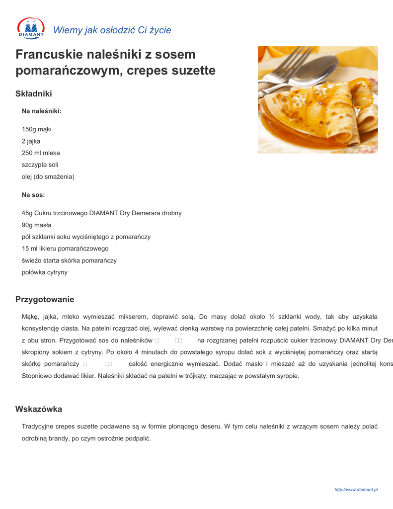 Wiemy jak osłodzić Ci życie Francuskie naleśniki z sosem pomarańczowym, crepes suzette Składniki Na naleśniki: 150g mąki 2 jajka 250 ml mleka szczypta soli olej (do smażenia) Na sos: 45g Cukru trzcinowego DIAMANT Dry Demerara drobny 90g masła pół szklanki soku wyciśniętego z pomarańczy 15 ml likieru pomarańczowego świeżo starta skórka pomarańczy połówka cytryny Przygotowanie Mąkę, jajka, mleko wymieszać mikserem, doprawić solą. Do masy dolać około ½ szklanki wody, tak aby uzyskała konsystencję ciasta. Na patelni rozgrzać olej, wylewać cienką warstwę na powierzchnię całej patelni. Smażyć po kilka minut z obu stron. Przygotować sos do naleśników ጀ na rozgrzanej patelni rozpuścić cukier trzcinowy DIAMANT Dry Dem skropiony sokiem z cytryny. Po około 4 minutach do powstałego syropu dolać sok z wyciśniętej pomarańczy oraz startą skórkę pomarańczy ጀ całość energicznie wymieszać. Dodać masło i mieszać aż do uzyskania jednolitej kons Stopniowo dodawać likier. Naleśniki składać na patelni w trójkąty, maczając w powstałym syropie. Wskazówka Tradycyjne crepes suzette podawane są w formie płonącego deseru. W tym celu naleśniki z wrzącym sosem należy polać odrobiną brandy, po czym ostrożnie podpalić. http://www.diamant.pl