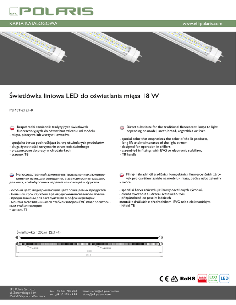 KARTA KATALOGOWA www.efl-polaris.com Świetlówka liniowa LED do oświetlania mięsa 18 W PSMET-2121-R Bezpośredni zamiennik tradycyjnych świetlówek fluorescencyjnych do oświetlania zależnie od modelu - mięsa, pieczywa lub warzyw i owoców. Direct substitute for the traditional fluorescent lamps to light, depending on model, meat, bread, vegetables or fruit. - specjalna barwa podkreślająca barwę oświetlanych produktów, - długa żywotność i utrzymanie strumienia świetlnego - przeznaczone do pracy w chłodziarkach - trzonek T8 - special color that emphasizes the color of the lit products, - long life and maintenance of the light stream - designed for operation in chillers - assembled in fittings with EVG or electronic stabilizer, - T8 handle Непосредственный заменитель традиционных люминесцентных ламп, для освещения, в зависимости от модели, для мяса, хлебобулочных изделий или овощей и фруктов Přímý náhradní díl tradičních kompaktních fluorescenčních žárovek pro osvětleni závisle na modelu - masa, pečiva nebo zeleniny a ovoce. - особый цвет, подчёркивающий цвет освещаемых продуктов - большой срок службыи время удержания светового потока - предназначены для эксплуатации в рефрижераторах Świetlówka 60cm (1x144) - монтаж в светильниках со стабилизатором EVG или с электронным стабилизатором - цоколь Т8 - speciální barva zdůrazňující barvy osvětlených výrobků, - dlouhá životnost a udrženi světelného toku - přizpůsobené do prací v lednicích montáž v drážkách z předřadníkem EVG nebo elektronickým - hřídel T8 588 604 Świetlówka 120cm (2x144) lewa 1198 1198 1214 1214 prawa Świetlówka 150cm (3x60) Made in Poland LEWA EFL Polaris Sp. z o.o. ul. Żeromskiego 12A 05-250 Słupno k. Warszawy ŚRODEK tel. +48 663 788 203 tel. _48 22 574 43 99 PRAWA 1498 1514 ECO friendly [email protected] [email protected] nazwa arkusza rysunek Świetlówki 60, 120, 150cm numer data zlecenie strona 2012-03-23 LED KARTA KATALOGOWA www.efl-polaris.com dane techniczne: / technical data: / технические условия: / specifikace: Specyfikacja Świetlówka liniowa LED do oświetlania mięsa 18 W PSMET-2121-R G13 T8/26mm 176-264 V/AC 68mA-102mA AC 50/60 Hz >0,96 < 0,5 s 1300 lm 18 W 72,22 lm/W A 120° > 50 000 h -20°C do 40°C -30°C do 70°C 20 Wnętrze Tak 1200/26 Materiały SMD 2835 96 Aluminum/PC Biała Masa 0,17 kg 0,50 kg Produkt Kod Trzonek Oznaczenie i średnica rury Zasilanie Natężenie prądu Częstotliwość Współczynnik mocy Czas zapłonu Strumień świetlny Moc Efektywność Klasa energetyczna Kąt świecenia Żywotność Temperatura pracy Temperatura przechowywania Wskaźnik IP Zalecane miejsce zastosowania RoHS Wymiary LED Ilość LED Materiał Kolor obudowy Masa bez opakowania Masa z opakowaniem Obiekt Instalacja Numer projektu Data : : : : 06.12.2013 1 Dane oprawy 1.4 EFL-POLARIS, PS-1151-Z () 1.4.1 Krzywa światł. LDC rozkład światła / light distribution / распределение света / distribuce světla 150° 180° 150° 120° 120° 90° 90° 100 200 60° 60° 0° 5° 10° 15° 20° 25° 30° 35° 40° 45° 50° 55° 60° 65° 70° 75° 80° 85° 90° C0 C90 C180 344 344 344 349 331 349 330 328 330 330 318 330 318 312 318 317 310 317 297 300 297 282 282 282 259 258 259 251 232 251 219 202 219 181 172 181 150 139 150 119 110 119 85 81 63 47 24 14 24 10 4 10 7 6 7 85 63 cd / 1000 lm 300 30° 0° C0 / C180 30° C90 / C270 cd / 1000 lm Producent Kod zamów. Nazwa oprawy Wyposażenie Wymiary Nazwa pliku : EFL-POLARIS Sprawność : Skuteczność świetlna : PS-1151-Z Rozsył oświetlenia : 1 x LED / 2448 lm Kąt wiązki św. : L 1500 mm x B 16 mm x H 16 mm : Swietlowka_PS-1151-Z_EFL-Polaris.ldt EFL Polaris Sp. z o.o. ul. Żeromskiego 12A 05-250 Słupno k. Warszawy Relux1 tel. +48 663 788 203 tel. _48 22 574 43 99 -please put your own address here- : 98.42% : 107.56 lm/W (A40) : sym. do C0-C180 / C90-C270 : 112.3° C0-C180 108.5° C90-C270 [email protected] [email protected] Strona 5/5 Made in Poland ECO friendly LED