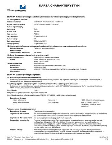 KARTA CHARAKTERYSTYKI SEKCJA 1: Identyfikacja substancji/mieszaniny i identyfikacja przedsiębiorstwa 1.1. Identyfikator produktu Nazwa substancji MAP-Pro™ Premium Hand Torch Fuel Numer identyfikacyjny 601-011-00-9 (Numer indeksowy) Numer rejestracyjny - Synonimy Brak. Numer SDS WC001 Kod wyrobu Różne Data wydania 07-grudzień-2012 Numer wersji 02 Data aktualizacji 28-kwiecień-2014 Zastępuje datę 07-grudzień-2012 1.2. Istotne zidentyfikowane zastosowania substancji lub mieszaniny oraz zastosowania odradzane Paliwo do ręcznego palnika Zidentyfikowane zastosowania Zastosowania odradzane Nie znane. 1.3. Dane dotyczące dostawcy karty charakterystyki Producent/Dostawca Adres Osoba kontaktowa Adres e-mail Nr telefonu 1.4. Numer telefonu alarmowego Worthington Cylinder Corporation 300 E. Breed St., Chilton, WI 5301 Stany Zjednoczone Ann Stiefvater [email protected] 1-920-849-1740 1-703-527-3887 International / CHEMTREC 1-800-424-9300 Domestic SEKCJA 2: Identyfikacja zagrożeń 2.1. Klasyfikacja substancji lub mieszaniny Substancję oceniono i/lub zbadano pod kątem stwarzanych przez nią zagrożeń fizycznych, zdrowotnych i ekologicznych, i zastosowanie ma następująca klasyfikacja. Klasyfikacja zgodnie z Dyrektywą 67/548/EWG lub 1999/45/WE, z późniejszymi zmianami Substancję tą zaklasyfikowano zgodnie z Rozporządzeniem (WE) 1272/2008 (Rozporządzenie CLP) i zgodnie z Dyrektywą 167/548/EEC, oraz ze zmianami do nich. Klasyfikacja F+;R12 Pełny tekst wszystkich zwrotów R podano w sekcji 16. Klasyfikacja zgodnie z Rozporządzeniem (WE) Nr 1272/2008, z późniejszymi zmianami. Zagrożenia fizyczne Gazy łatwopalne Gazy pod ciśnieniem Kategoria 1 H220 - Skrajnie łatwopalny gaz. Gaz sprężony H280 - Zawiera gaz pod ciśnieniem; ogrzanie grozi wybuchem. Podsumowanie dotyczące zagrożeń Zagrożenia fizyczne Produkt skrajnie łatwopalny. Zagrożenia dla zdrowia Nie stwierdzono istnienia zagrożeń dla zdrowia. Jednak związany z pracą kontakt z tą mieszaniną lub substancją/substancjami może mieć niekorzystny wpływ na stan zdrowia. Zagrożenia dla środowiska Nie stwierdzono istnienia zagrożeń ekologicznych. Szczególne zagrożenia Preparat skrajnie łatwopalny. Pary są cięższe od powietrza i mogą rozprzestrzeniać się nad podłogą i po dnie pojemników. Kontakt ze skroplonym gazem może spowodować urazy (odmrożenie) ze względu na szybkie chłodzenie w wyniku parowania. Niebezpieczeństwo uduszenia (środek duszący) - jeżeli pozwoli się dojść do stężeń, które redukują ilość tlenu poniżej bezpiecznego poziomu oddychania. Główne objawy Kontakt z gwałtownie rozprężającym się gazem lub parującym płynem może powodować odmrożenia ("zimne poparzenie"). Wysoki poziom narażenie może spowodować uduszenie z powodu braku tlenu. Może wywoływać uczucie senności lub zawroty głowy. MAP-Pro™ Premium Hand Torch Fuel 909050 Wersja nr: 02 Data aktualizacji: 28-kwiecień-2014 Data wydania: 07-grudzień-2012 SDS Poland 1/9 2.2. Elementy oznakowania Etykieta zgodnie z Rozporządzeniem (WE) Nr 1272/2008, z późniejszymi zmianami 601-011-00-9 Numer identyfikacyjny Piktogramy określające zag Hasło ostrzegawcze Niebezpieczeństwo Zwroty wskazujące rodzaj zagrożenia H220 - Skrajnie łatwopalny gaz. H280 - Zawiera gaz pod ciśnieniem; ogrzanie grozi wybuchem. Zwroty wskazujące środki ostrożności P210 - Przechowywać z dala od źródeł ciepła/iskrzenia/otwartego ognia/gorących powierzchni. Zapobieganie Palenie wzbronione. Reagowanie P377 - W przypadku pożaru w wyniku wycieku gazu: Nie gasić, o ile nie można bezpiecznie zahamować wycieku. P381 - Wyeliminować wszystkie źródła zapłonu, jeżeli jest to bezpieczne. Przechowywanie P410 + P403 - Chronić przed światłem słonecznym. Przechowywać w dobrze wentylowanym miejscu. Usuwanie Odpady i pozostałości utylizować zgodnie z lokalnie obowiązującymi przepisami. Informacje uzupełniające na etykiecie Brak. 2.3. Inne zagrożenia Substancja lub mieszanina nie będąca ani PBT ani vPvB. SEKCJA 3: Skład/informacja o składnikach 3.1. Substancje Ogólne informacje % Nr CAS /Nr WE Nr rejestracyjny REACH Numer indeksowy 99,5 - 100 115-07-1 204-062-1 - 601-011-00-9 Nazwa chemiczna Propylen Klasyfikacja: Uwagi DSD: F+;R12 CLP: Flam. Gas 1;H220, Press. Gas;H280 U Zanieczyszczenia Nazwa chemiczna Propan % Nr CAS /Nr WE Nr rejestracyjny REACH Numer indeksowy 0 - 0,5 74-98-6 200-827-9 - 601-003-00-5 Uwagi DSD (Dyrektywa odnosząca się do substancji niebezpiecznych): Dyrektywa 67/548/EWG. CLP (Klasyfikacja, Oznakowanie i Opakowanie): Rozporządzenie nr 1272/2008. Uwaga U (Tabela 3.1): Przy wprowadzaniu na rynek, gazy muszą zostać zaklasyfikowane jako „gazy pod ciśnieniem”, w jednej z grup gazów sprężonych, gazów skroplonych, schłodzonych gazów skroplonych lub gazów rozpuszczonych. Grupa zależy od stanu fizycznego, w jakim gaz występuje, a w związku z tym musi być określana z osobna dla każdego z przypadków. Wszystkie stężenia są wyrażone w procentach wagowych, jeśli składnik nie jest gazem. Stężenia Komentarze o składzie gazowe są wyrażone w procentach objętościowych. Pełny tekst wszystkich zwrotów R oraz H podano w sekcji 16. SEKCJA 4: Środki pierwszej pomocy Ogólne informacje Powiadomić personel medyczny o materiale (materiałach) którego dotyczy zgłoszenie, aby umożliwić im podjęcie odpowiednich środków ostrożności dla zapewnienia ich własnego bezpieczenstwa. 4.1. Opis środków pierwszej pomocy Wyprowadzić lub wynieść na świeże powietrze. W razie wystąpienia trudności z oddychaniem, Przez drogi oddechowe podać tlen. W razie stwierdzenia bezdechu, zastosować sztuczne oddychanie. Natychmiast wezwać lekarza lub powiadomić centrum zatruć. Niezwłocznie zdjąć zanieczyszczoną odzież i umyć skórę wodą z mydłem. W przypadku powstania Przez kontakt ze skórą lub utrzymywania się podrażnienia, należy skontaktować się z lekarzem.
