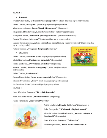 KLASA I I semestr Wanda Chotomska,, Gdy zamierzasz przejść ulicę” ( tekst znajduje się w podręczniku) Julian Tuwim,, Warzywa’’ (tekst znajduje się w podręczniku) Mira Jaworczakowa,, Jacek, Wacek i Pankracek’’ (fragmenty) Małgorzata Strzałkowska,, Leśny krasnoludek’’ (tekst w scenariuszu) Władysław Bełza,, Katechizm polskiego dziecka’’ (tekst w scenariuszu) Danuta Wawiłow,, Marzenie’’ ( tekst znajduje się w podręczniku) Lucyna Krzemieniecka,, Jak się krasnalek z borsukiem na spacer wybierali’’( tekst znajduje się w podręczniku) Natalia Usenko ,, Telegram do śpiącej królewny’’ II semestr Julian Tuwim,, Abecadło’’( teks znajduje się w podręczniku) Maria Kownacka,, Plastusiowy pamiętnik’’(fragmenty) Hanna Łochocka,, O wróbelku Elemelku’’(fragmenty) Natalia Usenko,, Potwór ekologiczny’’( tekst znajduje się w podręczniku) Julian Tuwim,, Ptasie radio’’ Joanna Papuzińska,, Nasza mama czarodziejka’’(fragmenty) Marcin Brykczyński ,,Tata’’( tekst znajduje się w podręczniku) Jan Brzechwa,, Żaba’’( tekst znajduje się w podręczniku) KLASA II Hans Christian Andersen " Brzydkie kaczątko" Alan Alexander Milne „Kubuś Puchatek”(fragmenty) Janina Porazińska „Szewczyk Dratewka” Astrid Lindgred „Dzieci z Bullerbyn”( fragmenty ) Julia Duszyńska " Cudaczek - Wyśmiewaczek" Alina i Czesław Centkiewiczowie „Anaruk, chłopiec z Grenlandii” (fragmenty) Hans Christian Andersen "Calineczka" Joanna Papuzińska,, Nasza mama czarodziejka’’ KLASA III Marta Berowska „Legenda o śpiących rycerzach w Tatrach” Maria Kownacka ”Kajtkowe przygody” Maria Krüger „Karolcia” Maria Konopnicka „Jak to ze lnem było” Janina Porazińska „O dwunastu miesiącach” Marian Orłoń „Przerwany hejnał” Hans Christian Andersen „ Królowa Śniegu” (fragment) Hugh Lofting „Doktor Dolittle i jego zwierzęta”(fragment) Franciszek Jankowski „ Bajka o królu ryb” Artur Oppman „Syrena” Roman Pisarski „O psie, który jeździł koleją” Astrid Lindgred „Dzieci z Bullerbyn” Alina i Czesław Centkiewiczowie „Anaruk, chłopiec z Grenlandii” KLASA IV Lektury obowiązkowe: Carlo Collodi „Pinokio” Jan Brzechwa „Akademia pana Kleksa” Clive Staples Lewis „Opowieści z Narnii „ cz.I Astrid Lindgren „Bracia Lwie Serce” Lektury uzupełniające: Rene Goscinny,Jean-Jacques Sempe „Mikołajek” Roald Dahl „Charlie i fabryka czekolady” Joanna Olech „Dynastia Miziołków” Moon Witcher „Dziewczyna z Szóstego Księżyca” KLASA V Lektury obowiązkowe: Ferenc Molnar „Chłopcy z Placu Broni” Henryk Sienkiewicz „W pustyni i w puszczy” Frances Hodgson Burnett „Tajemniczy ogród” John Ronald Reuel Tolkien „Hobbit, czyli tam i z powrotem” Lektury uzupełniające: Antonina Domańska „Historia żółtej ciżemki” Aleksander Minkowski „Dolina światła” Dorota Terakowska „Władca Lewawu” Mark Twain „Przygody Tomka Sawyera” KLASA VI Lektury obowiązkowe: Irena Jurgielewiczowa „Ten obcy” Kornel Makuszyński „Szatan z siódmej klasy” Lucy Maud Montgomery „Ania z Zielonego Wzgórza” Stanisław Lem „Bajki robotów” Lektury uzupełniające: Edmund Niziurski „Sposób na Alcybiadesa” Joaana Onichimowska „Duch starej kamienicy” Alfred Szklarski „Tomek w krainie kangurów” Juliusz Verne „W 80 dni dookoła świata”
