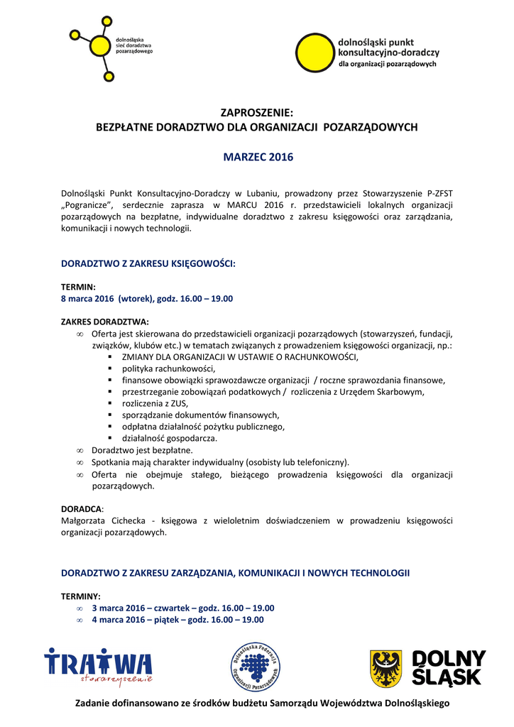 ZAPROSZENIE: BEZPŁATNE DORADZTWO DLA ORGANIZACJI POZARZĄDOWYCH MARZEC 2016 Dolnośląski Punkt Konsultacyjno-Doradczy w Lubaniu, prowadzony przez Stowarzyszenie P-ZFST „Pogranicze”, serdecznie zaprasza w MARCU 2016 r. przedstawicieli lokalnych organizacji pozarządowych na bezpłatne, indywidualne doradztwo z zakresu księgowości oraz zarządzania, komunikacji i nowych technologii. DORADZTWO Z ZAKRESU KSIĘGOWOŚCI: TERMIN: 8 marca 2016 (wtorek), godz. 16.00 – 19.00 ZAKRES DORADZTWA: • Oferta jest skierowana do przedstawicieli organizacji pozarządowych (stowarzyszeń, fundacji, związków, klubów etc.) w tematach związanych z prowadzeniem księgowości organizacji, np.: ZMIANY DLA ORGANIZACJI W USTAWIE O RACHUNKOWOŚCI, polityka rachunkowości, finansowe obowiązki sprawozdawcze organizacji / roczne sprawozdania finansowe, przestrzeganie zobowiązań podatkowych / rozliczenia z Urzędem Skarbowym, rozliczenia z ZUS, sporządzanie dokumentów finansowych, odpłatna działalność pożytku publicznego, działalność gospodarcza. • Doradztwo jest bezpłatne. • Spotkania mają charakter indywidualny (osobisty lub telefoniczny). • Oferta nie obejmuje stałego, bieżącego prowadzenia księgowości dla organizacji pozarządowych. DORADCA: Małgorzata Cichecka - księgowa z wieloletnim doświadczeniem w prowadzeniu księgowości organizacji pozarządowych. DORADZTWO Z ZAKRESU ZARZĄDZANIA, KOMUNIKACJI I NOWYCH TECHNOLOGII TERMINY: • 3 marca 2016 – czwartek – godz. 16.00 – 19.00 • 4 marca 2016 – piątek – godz. 16.00 – 19.00 Zadanie dofinansowano ze środków budżetu Samorządu Województwa Dolnośląskiego ZAKRES TEMATYCZNY DORADZTWA: Zarządzanie: • Planowanie strategiczne. • Model organizacyjny, podział zadań i kompetencji w organizacji. • Samofinansowanie działań organizacji. • Łączenie wolontariatu z pracą odpłatną. • Planowanie pracy, zarządzanie projektami. • Zarządzanie własnymi zadaniami, delegowanie zadań. • Zarządzanie zespołem. • Motywacja i rozwój kompetencji miękkich. Komunikacja społeczna: • Marketing i public relations dla organizacji, jak „sprzedać” idee? • Definiowanie grup docelowych, komunikacja z wybranymi grupami. • Kanały komunikacji – skuteczne docieranie do wybranych grup odbiorców. • Nowe media w komunikacji, korzystanie z mediów społecznościowych. • Komunikacja wewnętrzna, współpraca zarządu z członkami i odbiorcami działań organizacji. Wykorzystanie technologii: • Narzędzia informatyczne pomagające w pracy organizacji. • Praca zdalna w organizacji. • Darmowe technologie dla organizacji. • Wyposażanie biura – jak nie przepłacać za sprzęt? • Zarządzanie informacją w organizacji. DORADCA: Szymon Surmacz - animator przedsiębiorczości społecznej, szkoleniowiec, specjalista w zakresie wykorzystywania do celów społecznych: marketingu oraz technik multimedialnych i informatycznych, współzałożyciel kwartalnika „Nowy Obywatel” oraz współtwórca koncepcji i redaktor czasopisma „JAK robić biznes społeczny”, przez 6 lat prezes Stowarzyszenia "Obywatele Obywatelom", twórca i dyrektor studia graficznego Kooperatywa.org, aktualnie prezes Stowarzyszenia Wolimierz i koordynator Laboratorium Aktywności Społecznej w Wolimierzu. INFORMACJE ORGANIZACYJNE / ZGŁOSZENIA: • • • • Oferta jest skierowana do przedstawicieli organizacji pozarządowych (stowarzyszeń, fundacji, związków, klubów etc.). Doradztwo jest bezpłatne. Spotkania mają charakter indywidualny (osobisty lub telefoniczny). Ze względu na ograniczona liczbę miejsc niezbędna jest wcześniejsza rezerwacja terminu i godziny spotkania z doradcą: telefonicznie: 696 256 420 (numer czynny w godzinach pracy) e-mail: [email protected] lub osobiście w siedzibie DPKD / Lokalnego Inkubatora NGO w Lubaniu. Zadanie dofinansowano ze środków budżetu Samorządu Województwa Dolnośląskiego • • Przy rezerwacji terminu prosimy o podanie tematu spotkania z doradcą. Obowiązuje kolejność zgłoszeń. KONTAKT: Dolnośląski Punkt Konsultacyjno-Doradczy (DPKD) / Lokalny Inkubator Organizacji Pozarządowych przy Stowarzyszeniu Południowo-Zachodnie Forum Samorządu Terytorialnego "Pogranicze" ul. Armii Krajowej 30, 59-800 Lubań (parter, wejście od podwórza, obok szkoły językowej) Tel. 696 256 420 (numer czynny w godzinach pracy) Email: [email protected] www.pogranicze-csb.home.pl Działalność Dolnośląskiego Punktu Konsultacyjno-Doradczego w Lubaniu jest dofinansowana ze środków budżetu Samorządu Województwa Dolnośląskiego. Działalność Lokalnego Inkubatora Organizacji Pozarządowych w Lubaniu jest dofinansowana ze środków Gminy Miejskiej Lubań. ODWIEDŹ NAS NA FACEBOOKU: www.facebook.com/Lokalny-Inkubator-NGO-w-Lubaniu-1640507489564088/?ref=aymt_homepage_panel Zadanie dofinansowano ze środków budżetu Samorządu Województwa Dolnośląskiego