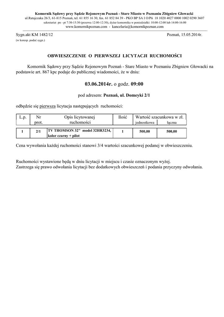Komornik Sądowy przy Sądzie Rejonowym Poznań - Stare Miasto w Poznaniu Zbigniew Głowacki ul.Ratajczaka 26/3, 61-815 Poznań, tel. 61 855 16 30, fax. 61 852 84 39 - PKO BP SA I O/Pń 18 1020 4027 0000 1002 0290 3607 sekretariat pn - pt 7:30-15:30 (przerwa 12:00-12:30), dyżur komornika w poniedziałki: 10:00-12:00 lub 14:00-16:00 www.komornikpoznan.com - [email protected] Sygn.akt KM 1482/12 Poznań, 15.05.2014r. (w koresp. podać sygn.) OBWIESZCZENIE O PIERWSZEJ LICYTACJI RUCHOMOŚCI Komornik Sądowy przy Sądzie Rejonowym Poznań - Stare Miasto w Poznaniu Zbigniew Głowacki na podstawie art. 867 kpc podaje do publicznej wiadomości, że w dniu: 03.06.2014r. o godz. 09:00 pod adresem: Poznań, ul. Domeyki 2/1 odbędzie się pierwsza licytacja następujących ruchomości: L.p. 1 Nr prot. Opis licytowanej ruchomości Ilość 2/1 TV THOMSON 32" model 32HR3234, kolor czarny + pilot 1 Wartość szacunkowa w zł. jednostkowa łączna 500,00 500,00 Cena wywołania każdej ruchomości stanowi 3/4 wartości szacunkowej podanej w obwieszczeniu. Ruchomości wystawione będą w dniu licytacji w miejscu i czasie oznaczonym wyżej. Zastrzega się prawo odwołania licytacji bez dodatkowych obwieszczeń i podania przyczyny odwołania.