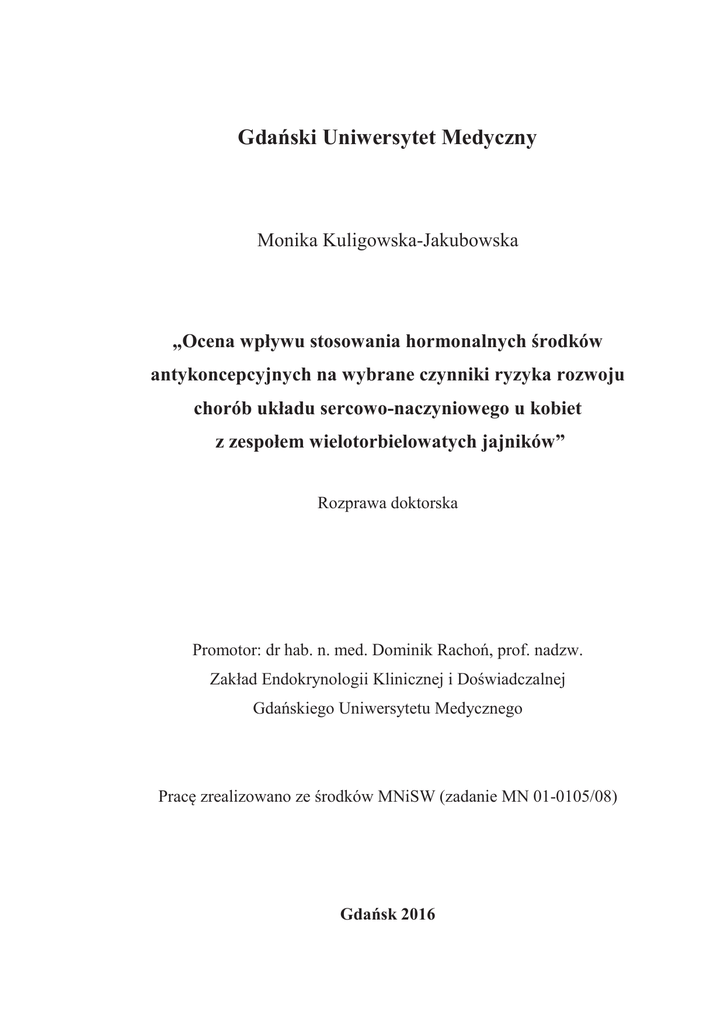 Gda ski Uniwersytet Medyczny Monika Kuligowska-Jakubowska „Ocena wpływu stosowania hormonalnych rodków antykoncepcyjnych na wybrane czynniki ryzyka rozwoju chorób układu sercowo-naczyniowego u kobiet z zespołem wielotorbielowatych jajników” Rozprawa doktorska Promotor: dr hab. n. med. Dominik Racho , prof. nadzw. Zakład Endokrynologii Klinicznej i Do wiadczalnej Gda skiego Uniwersytetu Medycznego Prac zrealizowano ze rodków MNiSW (zadanie MN 01-0105/08) Gda sk 2016 Pragn serdecznie podzi kowa : Promotorowi rozprawy doktorskiej Panu Profesorowi Dominikowi Rachoniowi za inspiracj , cenne wskazówki, po wi cony czas i yczliw pomoc okazan mi na wszystkich etapach powstawania niniejszej pracy Pani Profesor Katarzynie Zorenie, Panu Profesorowi Krzysztofowi Narkiewiczowi, Pani Doktor Agnieszce Kowalewskiej - Włas, Doktor Ewie Wronie, Doktorowi Robertowi Nowakowi za wszechstronne wsparcie i pomoc na ró nych etapach realizacji bada Szczególnie dzi kuj mojej Mamie, m owi Sławkowi i dzieciom Marcie, Emilce i Adamowi za ich cierpliwo 2 i miło LISTA SKRÓTÓW ZASTOSOWANYCH W PRACY ADMA – (z ang. asymmetric dimethyl-arginine) asymetryczna dimetyloarginina AE & PCOS – (z ang. Androgen Excess and PCOS Society) Towarzystwo Nadmiaru Androgenów i PCOS ANDROST - androstendion ASRM – (z ang. American Society for Reproductive Medicine) Ameryka skie Towarzystwo Medycyny Rozrodu BMI – (z ang. body mass index) wska nik masy ciała BP – (z ang. blood pressure) ci nienie t tnicze CCRL2 – (z ang. chemokine C-C motif receptor like 2) receptor chemokinowy ChNS – choroba niedokrwienna serca CI – (z ang. confidence interval) przedział ufno ci CLIA – (z ang. chemiluminescence immunoenzymatic assay) metoda immunoenzymatycznej chemiluminescencji CMKLR-1 - (z ang. chemokine-like receptor 1) receptor chemokinowy CPA – (z ang. cyproterone acetate) octan cyproteronu CRP – (z ang. C-reactive protein) białko C-reaktywne CS – (z ang. calcium score) wska nik uwapnienia t tnic wie cowych ChUSN – choroby układu sercowo-naczyniowego DBP – (z ang. diastolic blood pressure) rozkurczowe ci nienie t tnicze DHEA-S – siarczan dehydroepiandrosteronu DRSP – drospirenon D A – doustne rodki antykoncepcyjne DTTG – doustny test tolerancji glukozy ECLIA – (z ang. electrochemiluminescence immunoenzymatic assay) metoda immunoenzymatycznej elektrochemiluminescencji EE – (z ang. ethinylestradiol) etynyloestradiol EE+CPA - (z ang. ethinylestradiol + cyproterone acetate) doustny preparat antykoncepcyjny zawieraj cy etynyloestradiol i octan cyproteronu EE+DRSP – (z ang. ethinylestradiol + drospirenone) antykoncepcyjny zawieraj cy etynyloestradiol i drospirenon EKG – elektrokardiogram 3 doustny preparat ESHRE – (z ang. European Society for Human Reproduction and Ebryology) Europejskie Towarzystwo Rozrodczo ci Człowieka i Embriologii FAI – (z ang. free androgen index) wska nik wolnych androgenów FFA – (z ang. free fatty acids) wolne kwasy tłuszczowe FGIR – (z ang. fasting glucose to insulin ratio) stosunek st enia glukozy do st enia insuliny w surowicy na czczo FMD – (z ang. flow-mediate dilation) dylatacja t tnicy ramiennej indukowana niedokrwieniem FSH – (z ang. follicle-stimulating hormone) hormon folikulotropowy GDM – (z ang. gestational diabetes mellitus) cukrzyca ci owa GnRH – (z ang. gonadotropin-releasing hormone) gonadoliberyna GPR 1 – (z ang. G protein-coupled receptor) receptor zwi zany z białkiem G HDL-Ch – (z ang. high density lipoprotein cholesterol) cholesterol frakcji lipoprotein o wysokiej g sto ci HOMA-IR – (z ang. homeostasis model assessment of insulin resistance) wyliczony wska nik oporno ci tkanek na insulin HR – (z ang. heart rate) akcja serca IDF – (z ang. International Diabetes Federation) Mi dzynarodowa Federacja Diabetologiczna IFG – (z ang. impaired fasting glucose) nieprawidłowa glikemia na czczo IGF-1 – (z ang. insulin-like growth factor 1) insulinopodobny czynnik wzrostu 1 IGT – (z ang. impaired glucose tolerance) upo ledzona tolerancja glukozy IL-1 – interleukina 1 IL-6 – interleukina 6 IL-10 – interleukina 10 IMT – (z ang. intima-media thickness) wska nik grubo ci kompleksu ródbłonek -błona rodkowa IR – (z ang. insulin resistance) insulinooporno LDL-Ch – (z ang. low density lipoprotein cholesterol) cholesterol frakcji lipoprotein o niskiej g sto ci LH – (z ang. luteinizing hormone) hormon luteinizuj cy MCP-1 – (z ang. monocyte chemoattractant protein-1) białko chemotaktyczne dla monocytów 1 MPV - (z ang. mean platelet volume) rednia obj to 4 płytek krwi NCEP-ATP III – (z ang. National Cholesterol Education Program Adult Treatment Panel III) III Raport Zespołu Specjalistów Narodowego Programu Edukacji Cholesterolowej NIH – (z ang. National Institude of Health) Narodowy Instytut Zdrowia NT – nadci nienie t tnicze PAI-1 – (z ang. plazminogen activator inhibitor-1) inhibitor aktywatora plazminogenu typu 1 PCOM – (z ang. polycystic ovary morphology) obraz ultrasonograficzny jajników torbielowatych PCOS – (z ang. polycytic ovary syndrome) zespół wielotorbielowatych jajników PRL – prolaktyna PWV – (z ang. pulse wave velocity) pr dko ci propagacji fali t tna cfPWV - pr dko propagacji fali t tna w odcinku szyjno-udowym crPWV - pr dko propagacji fali t tna w odcinku szyjno-promieniowym QUICKI – (z ang. Quantitative Insulin Sensitivity Check Index) ilo ciowy wska nik wra liwo ci na insulin RR – ci nienie t tnicze SBP – (z ang. systolic blood pressure) skurczowe ci nienie t tnicze SHBG – (z ang. sex hormone binding globulin) białko wi ce hormony płciowe sE-selectin - (z ang. soluble endothelial selectin) rozpuszczalna forma E-selektyny sICAM-1 – (z ang. soluble intercellular adhesion molekule-1) rozpuszczalna forma mi dzykomórkowej cz steczki adhezyjnej-1 sVCAM-1 – (z ang. soluble vascular cell adhesion molecule 1) rozpuszczalna forma naczyniowej cz steczki przylegania komór