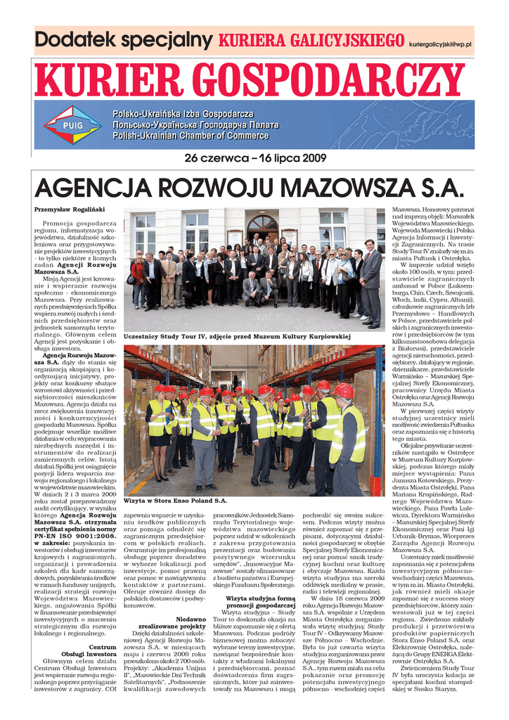Dodatek specjalny KURIERA GALICYJSKIEGO [email protected] KURIER GOSPODARCZY 26 czerwca – 16 lipca 2009 AGENCJA ROZWOJU MAZOWSZA S.A. Przemys³aw Rogaliñski Promocja gospodarcza regionu, informatyzacja województwa, dzia³alnoœæ szkoleniowa oraz przygotowywanie projektów inwestycyjnych - to tylko niektóre z licznych zadañ Agencji Rozwoju Mazowsza S.A. Misj¹ Agencji jest kreowanie i wspieranie rozwoju spo³eczno - ekonomicznego Mazowsza. Przy realizowanych przedsiêwziêciach Spó³ka wspiera rozwój ma³ych i œrednich przedsiêbiorstw oraz jednostek samorz¹du terytorialnego. G³ównym celem Agencji jest pozyskanie i obs³uga inwestora. Agencja Rozwoju Mazowsza S.A. d¹¿y do stania siê organizacj¹ skupiaj¹c¹ i koordynuj¹c¹ inicjatywy, projekty oraz konkursy s³u¿¹ce wzrostowi aktywnoœci i przedsiêbiorczoœci mieszkañców Mazowsza. Agencja dzia³a na rzecz zwiêkszenia innowacyjnoœci i konkurencyjnoœci gospodarki Mazowsza. Spó³ka podejmuje wszelkie mo¿liwe dzia³ania w celu wypracowania niezbêdnych narzêdzi i instrumentów do realizacji zamierzonych celów. Istot¹ dzia³añ Spó³ki jest osi¹gniêcie pozycji lidera wsparcia rozwoju regionalnego i lokalnego w województwie mazowieckim. W dniach 2 i 3 marca 2009 roku zosta³ przeprowadzony audit certyfikuj¹cy, w wyniku którego Agencja Rozwoju Mazowsza S.A. otrzyma³a certyfikat spe³nienia normy PN-EN ISO 9001:2008. w zakresie: pozyskania inwestorów i obs³ugi inwestorów krajowych i zagranicznych, organizacji i prowadzenia szkoleñ dla kadr samorz¹dowych, pozyskiwania œrodków w ramach funduszy unijnych, realizacji strategii rozwoju Województwa Mazowieckiego, anga¿owania Spó³ki w finansowanie przedsiêwziêæ inwestycyjnych o znaczeniu strategicznym dla rozwoju lokalnego i regionalnego. Centrum Obs³ugi Inwestora G³ównym celem dzia³u Centrum Obs³ugi Inwestora jest wspieranie rozwoju regionalnego poprzez przyci¹ganie inwestorów z zagranicy. COI Uczestnicy Study Tour IV, zdjêcie przed Muzeum Kultury Kurpiowskiej Wizyta w Stora Enso Poland S.A. zapewnia wsparcie w uzyskaniu œrodków publicznych oraz pomaga odnaleŸæ siê zagranicznym przedsiêbiorcom w polskich realiach. Gwarantuje im profesjonaln¹ obs³ugê poprzez doradztwo w wyborze lokalizacji pod inwestycje, pomoc prawn¹ oraz pomoc w nawi¹zywaniu kontaktów z partnerami. Oferuje równie¿ dostêp do polskich dostawców i podwykonawców. Niedawno zrealizowane projekty Dziêki dzia³alnoœci szkoleniowej Agencji Rozwoju Mazowsza S.A. w miesi¹cach maju i czerwcu 2009 roku przeszkolono oko³o 2 700 osób. Projekty: „Akademia Unijna II”, „Mazowieckie Dni Technik Satelitarnych”, „Podnoszenie kwalifikacji zawodowych pracowników Jednostek Samorz¹du Terytorialnego województwa mazowieckiego poprzez udzia³ w szkoleniach z zakresu przygotowania prezentacji oraz budowania pozytywnego wizerunku urzêdów”, „Innowacyjne Mazowsze” zosta³y sfinansowane z bud¿etu pañstwa i Europejskiego Funduszu Spo³ecznego. Wizyta studyjna form¹ promocji gospodarczej Wizyta studyjna – Study Tour to doskona³a okazja na bli¿sze zapoznanie siê z ofert¹ Mazowsza. Podczas podró¿y biznesowej mo¿na zobaczyæ wybrane tereny inwestycyjne, nawi¹zaæ bezpoœrednie kontakty z w³adzami lokalnymi i przedsiêbiorcami, poznaæ doœwiadczenia firm zagranicznych, które ju¿ zainwestowa³y na Mazowszu i mog¹ pochwaliæ siê swoim sukcesem. Podczas wizyty mo¿na równie¿ zapoznaæ siê z przepisami, dotycz¹cymi dzia³alnoœci gospodarczej w obrêbie Specjalnej Strefy Ekonomicznej oraz poznaæ smak tradycyjnej kuchni oraz kulturê i obyczaje Mazowsza. Ka¿da wizyta studyjna ma szeroki oddŸwiêk medialny w prasie, radio i telewizji regionalnej. W dniu 18 czerwca 2009 roku Agencja Rozwoju Mazowsza S.A. wspólnie z Urzêdem Miasta Ostro³êka zorganizowa³a wizytê studyjn¹: Study Tour IV – Odkrywamy Mazowsze Pó³nocno - Wschodnie. By³a to ju¿ czwarta wizyta studyjna zorganizowana przez Agencjê Rozwoju Mazowsza S.A., tym razem mia³a na celu pokazanie oraz promocjê potencja³u inwestycyjnego pó³nocno - wschodniej czêœci Mazowsza. Honorowy patronat nad imprez¹ objêli: Marsza³ek Województwa Mazowieckiego, Wojewoda Mazowiecki i Polska Agencja Informacji i Inwestycji Zagranicznych. Na trasie Study Tour IV znalaz³y siê m.in. miasta Pu³tusk i Ostro³êka. W imprezie udzia³ wziê³o oko³o 100 osób, w tym: przedstawiciele zagranicznych ambasad w Polsce (Luksemburga, Chin, Czech, Szwajcarii, W³och, Indii, Cypru, Albanii), cz³onkowie zagranicznych Izb Przemys³owo – Handlowych w Polsce, przedstawiciele polskich i zagranicznych inwestorów i przedsiêbiorców (w tym kilkunastoosobowa delegacja z Bia³orusi), przedstawiciele agencji nieruchomoœci, przedsiêbiorcy, dzia³aj¹cy w regionie, dziennikarze, przedstawiciele Warmiñsko – Mazurskiej Specjalnej Strefy Ekonomicznej, pracownicy Urzêdu Miasta Ostro³êka oraz Agencji Rozwoju Mazowsza S.A. W pierwszej czêœci wizyty studyjnej uczestnicy mieli mo¿liwoœæ zwiedzenia Pu³tuska oraz zapoznania siê z histori¹ tego miasta. Oficjalne przywitanie uczestników nast¹pi³o w Ostro³êce w Muzeum Kultury Kurpiowskiej, podczas którego mia³y miejsce wyst¹pienia: Pana Janusza Kotowskiego, Prezydenta Miasta Ostro³êki, Pana Mariana Krupiñskiego, Radnego Województwa Mazowieckiego, Pana Paw³a Lulewicza, Dyrektora Warmiñsko – Mazurskiej Specjalnej Strefy Ekonomicznej oraz Pani Igi Urbanik-Brymas, Wiceprezes Zarz¹du Agencji Rozwoju Mazowsza S.A. Uczestnicy mieli mo¿liwoœæ zapoznania siê z potencja³em inwestycyjnym pó³nocnowschodniej czêœci Mazowsza, w tym m.in. Miasta Ostro³êki, jak równie¿ mieli okazje zapoznaæ siê z success story przedsiêbiorców, którzy zainwestowali ju¿ w tej czêœci regionu. Zwiedzono zak³ady produkcji i przetwórstwa produktów papierniczych Stora Enso Poland S.A. oraz Elektrowniê Ostro³êka, nale¿¹c¹ do Grupy ENERGA Elektrownie Ostro³