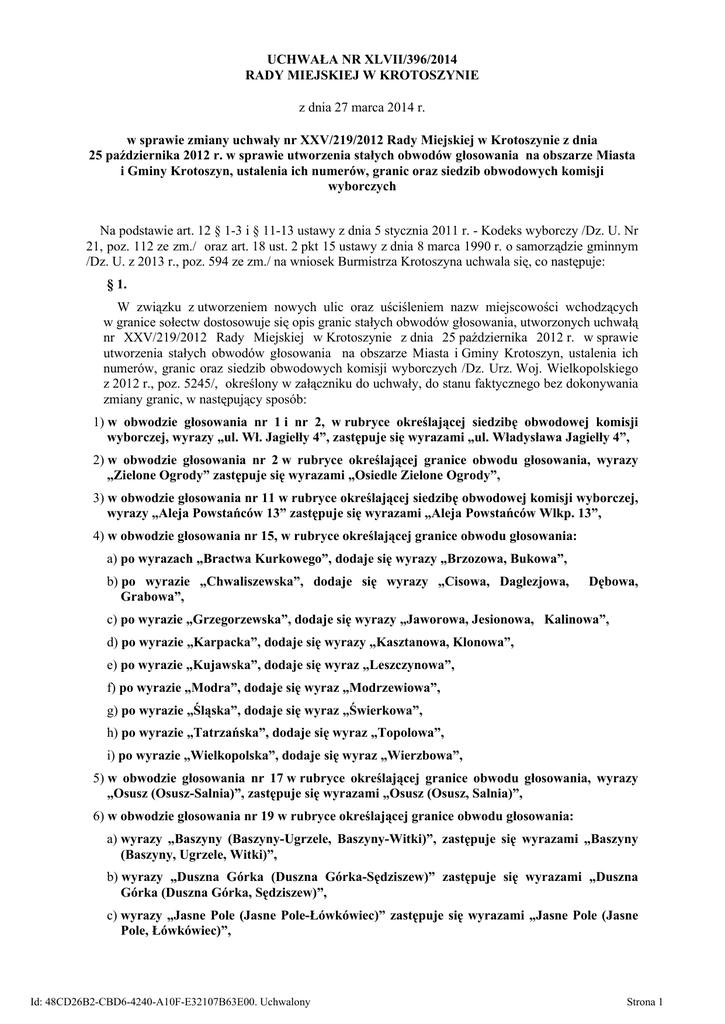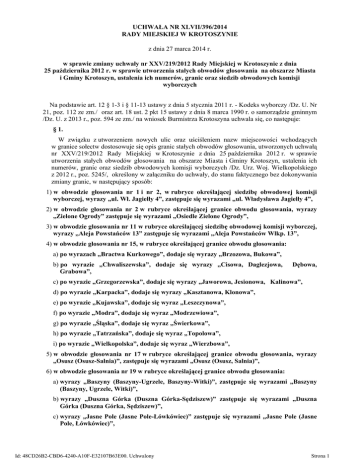 UCHWAŁA NR XLVII/396/2014 RADY MIEJSKIEJ W KROTOSZYNIE z dnia 27 marca 2014 r. w sprawie zmiany uchwały nr XXV/219/2012 Rady Miejskiej w Krotoszynie z dnia 25 października 2012 r. w sprawie utworzenia stałych obwodów głosowania na obszarze Miasta i Gminy Krotoszyn, ustalenia ich numerów, granic oraz siedzib obwodowych komisji wyborczych Na podstawie art. 12 § 1-3 i § 11-13 ustawy z dnia 5 stycznia 2011 r. - Kodeks wyborczy /Dz. U. Nr 21, poz. 112 ze zm./ oraz art. 18 ust. 2 pkt 15 ustawy z dnia 8 marca 1990 r. o samorządzie gminnym /Dz. U. z 2013 r., poz. 594 ze zm./ na wniosek Burmistrza Krotoszyna uchwala się, co następuje: § 1. W związku z utworzeniem nowych ulic oraz uściśleniem nazw miejscowości wchodzących w granice sołectw dostosowuje się opis granic stałych obwodów głosowania, utworzonych uchwałą nr XXV/219/2012 Rady Miejskiej w Krotoszynie z dnia 25 października 2012 r. w sprawie utworzenia stałych obwodów głosowania na obszarze Miasta i Gminy Krotoszyn, ustalenia ich numerów, granic oraz siedzib obwodowych komisji wyborczych /Dz. Urz. Woj. Wielkopolskiego z 2012 r., poz. 5245/, określony w załączniku do uchwały, do stanu faktycznego bez dokonywania zmiany granic, w następujący sposób: 1) w obwodzie głosowania nr 1 i nr 2, w rubryce określającej siedzibę obwodowej komisji wyborczej, wyrazy „ul. Wł. Jagiełły 4”, zastępuje się wyrazami „ul. Władysława Jagiełły 4”, 2) w obwodzie głosowania nr 2 w rubryce określającej granice obwodu głosowania, wyrazy „Zielone Ogrody” zastępuje się wyrazami „Osiedle Zielone Ogrody”, 3) w obwodzie głosowania nr 11 w rubryce określającej siedzibę obwodowej komisji wyborczej, wyrazy „Aleja Powstańców 13” zastępuje się wyrazami „Aleja Powstańców Wlkp. 13”, 4) w obwodzie głosowania nr 15, w rubryce określającej granice obwodu głosowania: a) po wyrazach „Bractwa Kurkowego”, dodaje się wyrazy „Brzozowa, Bukowa”, b) po wyrazie „Chwaliszewska”, dodaje się wyrazy „Cisowa, Daglezjowa, Grabowa”, Dębowa, c) po wyrazie „Grzegorzewska”, dodaje się wyrazy „Jaworowa, Jesionowa, Kalinowa”, d) po wyrazie „Karpacka”, dodaje się wyrazy „Kasztanowa, Klonowa”, e) po wyrazie „Kujawska”, dodaje się wyraz „Leszczynowa”, f) po wyrazie „Modra”, dodaje się wyraz „Modrzewiowa”, g) po wyrazie „Śląska”, dodaje się wyraz „Świerkowa”, h) po wyrazie „Tatrzańska”, dodaje się wyraz „Topolowa”, i) po wyrazie „Wielkopolska”, dodaje się wyraz „Wierzbowa”, 5) w obwodzie głosowania nr 17 w rubryce określającej granice obwodu głosowania, wyrazy „Osusz (Osusz-Salnia)”, zastępuje się wyrazami „Osusz (Osusz, Salnia)”, 6) w obwodzie głosowania nr 19 w rubryce określającej granice obwodu głosowania: a) wyrazy „Baszyny (Baszyny-Ugrzele, Baszyny-Witki)”, zastępuje się wyrazami „Baszyny (Baszyny, Ugrzele, Witki)”, b) wyrazy „Duszna Górka (Duszna Górka-Sędziszew)” zastępuje się wyrazami „Duszna Górka (Duszna Górka, Sędziszew)”, c) wyrazy „Jasne Pole (Jasne Pole-Łówkówiec)” zastępuje się wyrazami „Jasne Pole (Jasne Pole, Łówkówiec)”, Id: 48CD26B2-CBD6-4240-A10F-E32107B63E00. Uchwalony Strona 1 7) w obwodzie głosowania nr 20 w rubryce określającej granice obwodu głosowania wyrazy „Świnków (Świnków-Pustkowie Jędrzejewskie, Świnków-Rudy)”, zastępuje się wyrazami „Świnków (Świnków, Pustkowie Jędrzejewskie, Rudy)”. § 2. Jednolity wykaz obwodów głosowania, ich numerów, granic oraz siedzib obwodowych komisji wyborczych z uwzględnieniem zmiany, o której mowa w § 1, określa załącznik do niniejszej uchwały, stanowiący jej integralną część. § 3. Wykonanie uchwały powierza się Burmistrzowi Krotoszyna. § 4. Uchwałę przekazuje się niezwłocznie Wojewodzie Wielkopolskiemu oraz Wyborczemu w Kaliszu. Komisarzowi § 5. Uchwała wchodzi w życie z dniem podjęcia i podlega ogłoszeniu w Dzienniku Urzędowym Województwa Wielkopolskiego oraz podaniu do publicznej wiadomości w sposób zwyczajowo przyjęty. § 6. Wyborcom, w liczbie co najmniej 15, przysługuje prawo wniesienia skargi do Komisarza Wyborczego w Kaliszu w terminie 5 dni od daty podania uchwały do publicznej wiadomości. Przewodnicząca Rady Zofia Jamka Id: 48CD26B2-CBD6-4240-A10F-E32107B63E00. Uchwalony Strona 2 Załącznik Nr 1 do Uchwały Nr XLVII/396/2014 Rady Miejskiej w Krotoszynie z dnia 27 marca 2014 r. Podział Miasta i Gminy Krotoszyn na stałe obwody głosowania Nr obwodu Granice obwodu głosowania głosowania 1 2 3 KROTOSZYN: AGRESTOWA, AKACJOWA, CHABROWA, CHŁAPOWSKIEGO, CZEREŚNIOWA, GAŁECKIEGO, GRONOWA, GRUDZIELSKIEGO od 27 do końca, JABŁONIOWA, JARZĘBINOWA, JODŁOWA, MADALIŃSKIEGO, MALINOWA, MIĘTOWA, MIODOWA, MORELOWA, NABZDYKA, OGRODOWA, OSADNICZA od 35 do końca, OWOCOWA, PORZECZKOWA, POZIOMKOWA, PÓŁWIEJSKA, PTASIA, RUMIANKOWA, RYBIA, SAMULSKIEGO, SŁOWICZA, SZOSA BENICKA, ŚCIEGIENNEGO, TACZAKA, UMIŃSKIEGO, URBANOWICZÓWNY, WIERZBIĘTY, WOJCIECHOWSKIEGO 27-39A nieparzyste, od 40 do końca, ŻABIA, ŻURAWIA KROTOSZYN: BOYA-ŻELEŃSKIEGO, CHEŁMOŃSKIEGO, CHOPINA, GRUDZIELSKIEGO 1-26, KARŁOWICZA, KAROWA, KOBYLIŃSKA od 10a do końca, KOLBERGA, KOSSAKA, KROTOSKIEGO, KURPIŃSKIEGO, MATEJKI, MONIUSZKI, OSADNICZA 2-34, PADEREWSKIEGO, RATAJA, ROZDRAŻEWSKICH, SADOWA, SŁONECZNA, SPOKOJNA, SZYMANOWSKIEGO, TOWAROWA, WIENIAWSKIEGO, WITA STWOSZA, WŁADYSŁAWA JAGIEŁŁY, WOJCIECHOWSKIEGO 2-26, 28-32 parzyste, WYSPIAŃSKIEGO, OSIEDLE ZIELONE OGRODY KROTOSZYN: 1 STYCZNIA, 23 STYCZNIA, JASTRZĘBIA, KLEMCZAKA, KOPIECZKI, KOZALA, KOŹMIŃSKA 89-101 nieparzyste, od 102 do końca, ŁANOWA, MASŁOWSKIEGO, PAWIA, PÓŁNOCNA, PRZEMYSŁOWA, RYSIA, SOKOLA, SOWIA, WIEJSKA Id: 48CD26B2-CBD6-4240-A10F-E32107B63E00. Uchwalony Siedziba obwodowej komisji wyborczej Zespół Szkół nr 1 z Oddziałami Integracyjnymi (świetlica), ul. Władysława Jagiełły 4, Krotoszyn Zesp