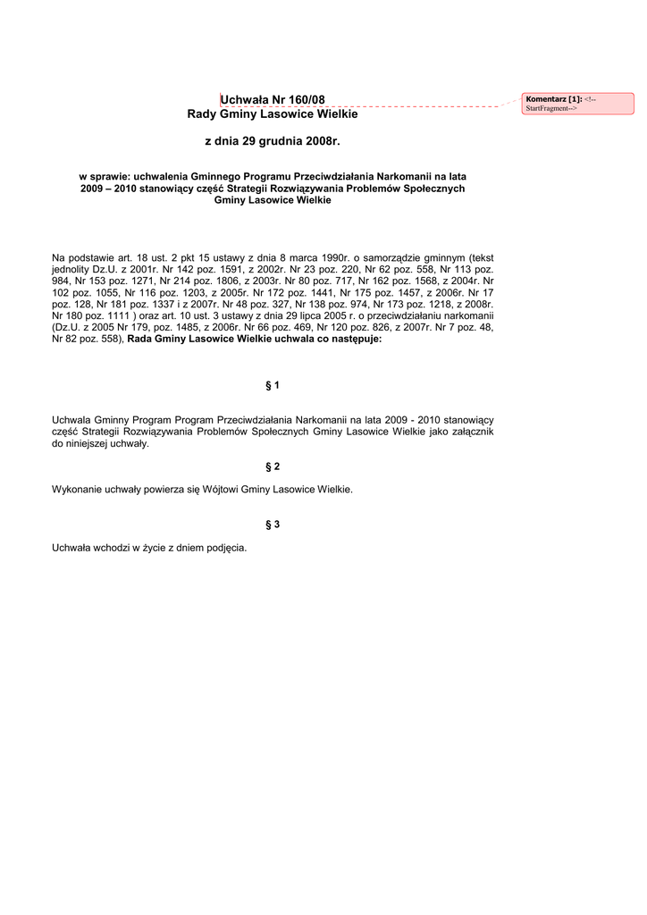 Uchwała Nr 160/08 Rady Gminy Lasowice Wielkie z dnia 29 grudnia 2008r. w sprawie: uchwalenia Gminnego Programu Przeciwdziałania Narkomanii na lata 2009 – 2010 stanowiący część Strategii Rozwiązywania Problemów Społecznych Gminy Lasowice Wielkie Na podstawie art. 18 ust. 2 pkt 15 ustawy z dnia 8 marca 1990r. o samorządzie gminnym (tekst jednolity Dz.U. z 2001r. Nr 142 poz. 1591, z 2002r. Nr 23 poz. 220, Nr 62 poz. 558, Nr 113 poz. 984, Nr 153 poz. 1271, Nr 214 poz. 1806, z 2003r. Nr 80 poz. 717, Nr 162 poz. 1568, z 2004r. Nr 102 poz. 1055, Nr 116 poz. 1203, z 2005r. Nr 172 poz. 1441, Nr 175 poz. 1457, z 2006r. Nr 17 poz. 128, Nr 181 poz. 1337 i z 2007r. Nr 48 poz. 327, Nr 138 poz. 974, Nr 173 poz. 1218, z 2008r. Nr 180 poz. 1111 ) oraz art. 10 ust. 3 ustawy z dnia 29 lipca 2005 r. o przeciwdziałaniu narkomanii (Dz.U. z 2005 Nr 179, poz. 1485, z 2006r. Nr 66 poz. 469, Nr 120 poz. 826, z 2007r. Nr 7 poz. 48, Nr 82 poz. 558), Rada Gminy Lasowice Wielkie uchwala co następuje: §1 Uchwala Gminny Program Program Przeciwdziałania Narkomanii na lata 2009 - 2010 stanowiący część Strategii Rozwiązywania Problemów Społecznych Gminy Lasowice Wielkie jako załącznik do niniejszej uchwały. §2 Wykonanie uchwały powierza się Wójtowi Gminy Lasowice Wielkie. §3 Uchwała wchodzi w Ŝycie z dniem podjęcia. Komentarz [1]: <!-StartFragment--> Załącznik Nr 1 do Uchwały Nr XXIV-160/08 Rady Gminy Lasowice Wielkie z dnia 29 grudnia 2008r. GMINNY PROGRAM PRZECIWDZIAŁANIA NARKOMANII W GMINIE LASOWICE WIELKIE NA LATA 2009-2010 I. WSTĘP Gminny Program Przeciwdziałania Narkomanii na lata 2009-2010 opracowany został zgodnie z treścią Ustawy o przeciwdziałaniu Narkomanii z dnia 29 lipca 2005r. oraz załoŜeniami Krajowego Programu Przeciwdziałania Narkomanii na lata 2006-2010. Opracowanie i uchwalenie w/w programu naleŜy do zadań własnych gminy. Narkomania (z greckiego narke – odurzenie, mania – szaleństwo), to patalogiczne zjawisko społeczne, uzaleŜnienie spowodowane krótszym lub dłuŜszym zaŜywaniem leków (głównie przeciwbólowych środków narkotycznych albo innych środków uzaleŜniających (narkotyki, leki uspokajające lub psychotropowe). Niesie ona ze sobą powaŜne zagroŜenie dla zdrowia publicznego. Skala zjawiska wzrasta, obejmując coraz mniejsze dzieci, sytuację utrudnia fakt, iŜ wykrywalność uzaleŜnienia we wczesnym stadium jest sporadyczna ze względu na wielość dostępnych na rynku środków oraz brak wiedzy opiekunów. Gminny Program Przeciwdziałania Narkomanii opracowany został w oparciu o diagnozę sytuacji w gminie Lasowice Wielkie w 2006r. w okresie badań ESPAD (Europejskie Badania MłodzieŜy Szkolnej). PowyŜsze badania są przeprowadzane co 4 lata we wszystkich krajach Europy. Następne badania będą wykonane w 2010r. Otrzymaliśmy równieŜ dane z Policji – w 2008r. zanotowano 2 przestępsta popełnione w Gminie Lasowice Wielkie pod wpływem narkotyków. II. OPIS ZJAWISKA NA PODSTAWIE DIAGNOZY. Badanie miało na celu przede wszystkim dokonanie pomiaru natęŜenia zjawiska uŜywania przez młodzieŜ substancji psychoaktywnych. Podstawowe pytania dotyczyły liczby młodych ludzi, którzy mają doświadczenia z tego typu substancjami oraz stopnia nasilenia tych doświadczeń. Ponadto pytania zostały ukierunkowane w ten sposób, by zidentyfikować i zmierzyć czynniki wpływające na rozmiary interesującego nas zjawiska stosowania substancji psychoaktywnych. Poruszano, zatem takie kwestie jak dostępność wspomnianych substancji – za równo w wymiarze fizycznym, jak psychologicznym – poprzez gotowość do podjęcia prób tymi środkami, przekonania na temat ich szkodliwości oraz doświadczenia w zakresie problemów związanych z ich uŜywaniem. Wszystkie te kwestie zostały poddane pomiarowi ilościowemu w celu dokonania oszacowań dla całej populacji. Wprawdzie punktem wyjścia do podjęcia badania i głównym przedmiotem zainteresowania pozostają narkotyki, tj. psychoaktywne substancje, to jednak wiele miejsca zajmują w nim równieŜ substancje legalne tj. napoje alkoholowe, tytoń, oraz leki uspakajające przyjmowane bez wskazań lekarskich. ■ ZAKRES BADAŃ I METODY BADAWCZE Badaniu poddano dwie populacje młodzieŜy szkolnej, traktowane odrębnie: pierwsza (chłopcy) składająca się z 46 uczniów urodzonych w 1990 r. uczęszczających do 3 klasy gimnazjum, oraz druga (dziewczęta) złoŜona z 57 uczennic urodzonych w 1990 r. z 3 klasy gimnazjum. Do anonimowej ankiety przystąpiły w sumie 103 osoby. Narzędziem badawczym był kwestionariusz wywiadu obejmujący 56 standaryzowanych pytań zamkniętych, w tym pytania metryczkowe, rejestrujące cechy społeczno – demograficzne respondenta i jego rodziny. PROBLEMATYKA BADAŃ Na szeroką grupę substancji psychoaktywnych składają się takie substancje legalne jak: leki przeciwbólowe i nasenne, sterydy anaboliczne czy substancje wziewne oraz szeroka gama substancji nielegalnych. Pod pojęciem substancji nielegalnych rozumiemy substancje nazywane potocznie narkotykami. Zacznijmy od kwestii na ile młodzieŜ zorientowana jest w rozmaitości róŜnych środków słuŜących do zmiany swojego stanu psychicznego. Zgodnie z oczekiwaniami zdecydowana większość badanych jest zorientowana w nazwach poszczególnych środków. Tylko nieliczni nie znają Ŝadnego ze środków. Nie oznacza to jednak, Ŝe wszystkie środki są jednakowo szeroko znane. NajwyŜszy odsetek badanych uczniów słyszał (w kolejności) o: marihuanie lub haszyszu, heroinie, amfetaminie, ecstasy, grzybach halucynogennych, kokainie, polskiej heroinie, czyli tzw. kompocie, lekarz uspokajających lub nasennych oraz LSD. Oczywiście znajomość nazw tych środków nie jest równoznaczna z ich uŜywaniem jednakŜe wskazuje jak dalece narkotyki weszły do potocznego języka nastolatków i co za tym idzie jak zawładnęły świadomością dorastającej młodzieŜy. Deklarowaną znajomość nazw narkotyków