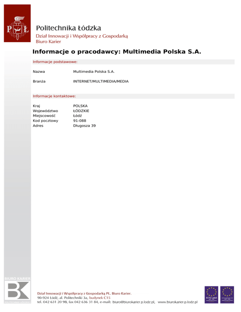Informacje o pracodawcy: Multimedia Polska S.A. Informacje podstawowe: Nazwa Multimedia Polska S.A. Branża INTERNET/MULTIMEDIA/MEDIA Informacje kontaktowe: Kraj Województwo Miejscowość Kod pocztowy Adres POLSKA ŁÓDZKIE Łódź 91-088 Długosza 39