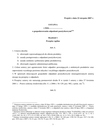 Projekt z dnia 22 sierpnia 2007 r. USTAWA z dnia……………….. o gospodarowaniu odpadami poużytkowymi1)2) Rozdział 1 Przepisy ogólne Art. 1. 1. Ustawa określa: 1) obowiązki wprowadzających do obrotu produkty; 2) zasady postępowania z odpadami poużytkowymi; 3) zasady ustalania i pobierania opłaty produktowej; 4) obowiązki organów administracji publicznej. 2. Celem ustawy jest ograniczenie ilości odpadów powstających z niektórych produktów oraz zapewnienie wysokiego poziomu odzysku i recyklingu odpadów poużytkowych. 3. W sprawach dotyczących gospodarki odpadami poużytkowymi nieuregulowanych ustawą stosuje się przepisy o odpadach. 4. Przepisy ustawy nie naruszają postanowień działu II w tytule I ustawy z dnia 27 kwietnia 2001 r. - Prawo ochrony środowiska (Dz. U. z 2006 r. Nr 129, poz. 902, z późn. zm.3)). Art. 2. 1) Niniejszą ustawą zmienia się ustawę z dnia 26 lipca 1991 r. o podatku dochodowym od osób fizycznych, ustawę z dnia 15 lutego 1992 r. o podatku dochodowym od osób prawnych, ustawę z dnia 27 kwietnia 2001 r. - Prawo ochrony środowiska, ustawę z dnia 27 kwietnia 2001 r. o odpadach oraz ustawę z dnia 20 lipca 2001 r. o Inspekcji Ochrony Środowiska. 2) Niniejsza ustawa dokonuje w zakresie swojej regulacji wdrożenia dyrektywy Rady 75/439/EWG z dnia 16 czerwca 1975 r. w sprawie unieszkodliwiania olejów odpadowych (Dz. Urz. WE L 194 z 25.07.1975, str. 23, L 42 z 12.02.1987, str. 43, L 377 z 31.12.1991, str. 48, L 243 z 24.09.1996, str. 31 i L 332 z 28.12.2000, str. 91). 3) Zmiany wymienionej ustawy zostały ogłoszone w Dz. U. z 2006 r. Nr 169, poz. 1199, Nr 170, poz. 1217 i Nr 249, poz. 1832 oraz z 2007 r. Nr 21, poz. 124, Nr 75, poz. 493 i Nr 88, poz. 587. 1 Przepisy ustawy stosuje się do produktów określonych w załączniku nr 1 do ustawy, zwanych w ustawie „produktami”. Ustawę stosuje się również do produktów, które są częściami składowymi lub przynależnościami produktów nie objętych załącznikiem nr 1 do ustawy. Art. 3. 1. Użyte w ustawie określenia oznaczają: 1) eksport odpadów poużytkowych - przemieszczenie odpadów poużytkowych z terytorium kraju na terytorium państwa trzeciego w celu poddania ich recyklingowi lub innemu niż recykling procesowi odzysku; 2) eksport produktów - przemieszczenie produktów z terytorium kraju na terytorium państwa trzeciego; 3) eksporter odpadów poużytkowych – przedsiębiorcę dokonującego eksportu odpadów poużytkowych w celu poddania ich recyklingowi lub innemu niż recykling procesowi odzysku; 4) eksporter produktów – przedsiębiorcę dokonującego eksportu produktów; 5) import odpadów poużytkowych - przemieszczenie odpadów poużytkowych z terytorium państwa trzeciego na terytorium kraju; 6) import produktów - przemieszczenie produktów z terytorium państwa trzeciego w celu wprowadzenia do obrotu; 7) importer produktów – przedsiębiorcę dokonującego importu produktów; 8) Narodowy Fundusz - Narodowy Fundusz Ochrony Środowiska i Gospodarki Wodnej w rozumieniu przepisów o ochronie środowiska; 9) oleje odpadowe - wszelkie oleje smarowe lub przemysłowe, które nie nadają się już do zastosowania, do którego były pierwotnie przeznaczone, a w szczególności zużyte oleje z silników spalinowych i oleje przekładniowe, a także oleje smarowe, oleje do turbin i oleje hydrauliczne; 10) odpady poużytkowe – odpady powstałe z produktów wymienionych w załączniku nr 1 do ustawy; 11) opłata produktowa - opłatę obliczaną i wpłacaną w przypadku nieosiągnięcia wymaganego poziomu odzysku lub recyklingu; 2 12) organizacja odzysku – organizacja odzysku, o której mowa w ustawie z dnia (...) o gospodarowaniu opakowaniami i odpadami opakowaniowymi (Dz. U. Nr …, poz. …) ; 13) oznaczenie - znak towarowy w rozumieniu ustawy z dnia 30 czerwca 2000 r. - Prawo własności przemysłowej (Dz. U. z 2003 r. Nr 119, poz. 1117, z późn. zm.4)) lub firmę, nazwę przedsiębiorcy, a w przypadku osoby fizycznej - imię i nazwisko przedsiębiorcy lub nazwę, pod którą wykonuje działalność gospodarczą; 14) przedsiębiorca – przedsiębiorcę, w rozumieniu przepisów ustawy z dnia 2 lipca 2004 r. o swobodzie działalności gospodarczej (Dz. U. Nr 173, poz. 1807, z późn. zm.5)); 15) regeneracja olejów odpadowych – każdy proces, w którym oleje bazowe mogą być produkowane przez rafinowanie olejów odpadowych, a w szczególności przez usunięcie zanieczyszczeń, produktów utleniania i dodatków zawartych w tych olejach; 16) terytorium kraju – terytorium Rzeczypospolitej Polskiej; 17) terytorium państwa członkowskiego - terytorium państwa wchodzącego w skład terytorium Wspólnoty Europejskiej; 18) terytorium państwa trzeciego - terytorium państwa niewchodzącego w skład terytorium Wspólnoty Europejskiej; 19) terytorium Wspólnoty Europejskiej - terytoria państw członkowskich Wspólnoty Europejskiej, z tym że następujące terytoria poszczególnych państw członkowskich są wyłączone z terytorium Wspólnoty Europejskiej: a) wyspa Heligoland, terytorium Buesingen - z Republiki Federalnej Niemiec, b) Ceuta, Melilla, wyspy Kanaryjskie - z Królestwa Hiszpanii, c) Livigno, Campione d'Italia, włoska część jeziora Lugano - z Republiki Włoskiej, d) departamenty zamorskie Republiki Francuskiej - z Republiki Francuskiej, e) Góra Athos - z Republiki Greckiej, f) wyspy Alandzkie - z Republiki Finlandii; 4) Zmiany wymienionej ustawy zostały ogłoszone w Dz. U. z 2004 r. Nr 33, poz. 286, z 2005 r. Nr 10, poz. 68, Nr 163, poz. 1362, Nr 167, poz. 1398 oraz z 2006 r. Nr 170, poz. 1217 i 1218 i Nr 208, poz. 1539 oraz z 2007 r. Nr 99, poz. 662. 5) Zmiany wymienionej ustawy zostały ogłoszone w Dz. U. z 2004 r. Nr 281, poz. 2777, z 2005 r. Nr 33, poz. 289, Nr 94, poz. 788, Nr 143, poz. 1199, Nr 175, poz. 1460, Nr 177, poz. 1468, Nr 178, poz. 1480, Nr 179, poz. 1485, Nr 180, poz. 1494 i Nr 183, poz. 1538, z 2006 r. Nr 17, poz. 127, Nr 144, 