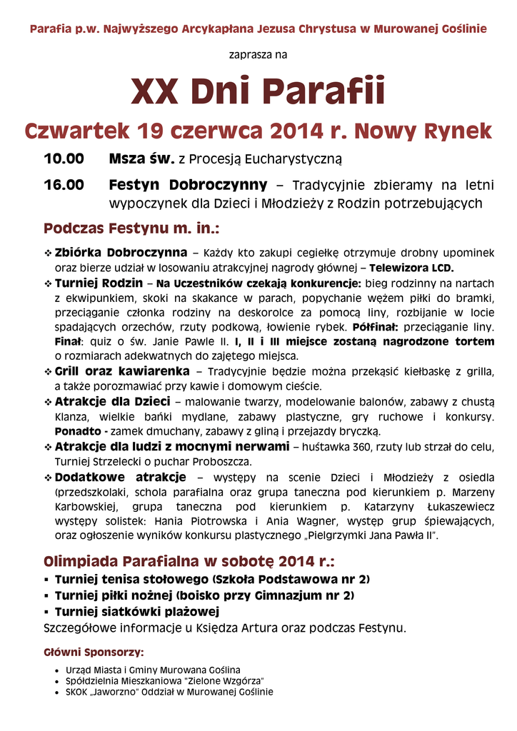Parafia p.w. Najwyższego Arcykapłana Jezusa Chrystusa w Murowanej Goślinie zaprasza na XX Dni Parafii Czwartek 19 czerwca 2014 r. Nowy Rynek 10.00 Msza św. z Procesją Eucharystyczną 16.00 Festyn Dobroczynny – Tradycyjnie zbieramy na letni wypoczynek dla Dzieci i Młodzieży z Rodzin potrzebujących Podczas Festynu m. in.:  Zbiórka Dobroczynna – Każdy kto zakupi cegiełkę otrzymuje drobny upominek oraz bierze udział w losowaniu atrakcyjnej nagrody głównej – Telewizora LCD.  Turniej Rodzin – Na Uczestników czekają konkurencje: bieg rodzinny na nartach z ekwipunkiem, skoki na skakance w parach, popychanie wężem piłki do bramki, przeciąganie członka rodziny na deskorolce za pomocą liny, rozbijanie w locie spadających orzechów, rzuty podkową, łowienie rybek. Półfinał: przeciąganie liny. Finał: quiz o św. Janie Pawle II. I, II i III miejsce zostaną nagrodzone tortem o rozmiarach adekwatnych do zajętego miejsca.  Grill oraz kawiarenka – Tradycyjnie będzie można przekąsić kiełbaskę z grilla, a także porozmawiać przy kawie i domowym cieście.  Atrakcje dla Dzieci – malowanie twarzy, modelowanie balonów, zabawy z chustą Klanza, wielkie bańki mydlane, zabawy plastyczne, gry ruchowe i konkursy. Ponadto - zamek dmuchany, zabawy z gliną i przejazdy bryczką.  Atrakcje dla ludzi z mocnymi nerwami – huśtawka 360, rzuty lub strzał do celu, Turniej Strzelecki o puchar Proboszcza.  Dodatkowe atrakcje – występy na scenie Dzieci i Młodzieży z osiedla (przedszkolaki, schola parafialna oraz grupa taneczna pod kierunkiem p. Marzeny Karbowskiej, grupa taneczna pod kierunkiem p. Katarzyny Łukaszewiecz występy solistek: Hania Piotrowska i Ania Wagner, występ grup śpiewających, oraz ogłoszenie wyników konkursu plastycznego „Pielgrzymki Jana Pawła II”. Olimpiada Parafialna w sobotę 2014 r.:  Turniej tenisa stołowego (Szkoła Podstawowa nr 2)  Turniej piłki nożnej (boisko przy Gimnazjum nr 2)  Turniej siatkówki plażowej Szczegółowe informacje u Księdza Artura oraz podczas Festynu. Główni Sponsorzy:  Urząd Miasta i Gminy Murowana Goślina  Spółdzielnia Mieszkaniowa "Zielone Wzgórza”  SKOK „Jaworzno” Oddział w Murowanej Goślinie