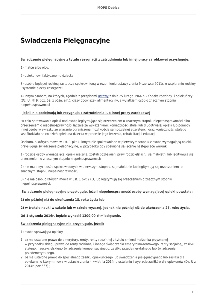 MOPS Dębica Świadczenia Pielęgnacyjne Świadczenie pielęgnacyjne z tytułu rezygnacji z zatrudnienia lub innej pracy zarobkowej przysługuje: 1) matce albo ojcu, 2) opiekunowi faktycznemu dziecka, 3) osobie będącej rodziną zastępczą spokrewnioną w rozumieniu ustawy z dnia 9 czerwca 2011r. o wspieraniu rodziny i systemie pieczy zastępczej, 4) innym osobom, na których, zgodnie z przepisami ustawy z dnia 25 lutego 1964 r. - Kodeks rodzinny i opiekuńczy (Dz. U. Nr 9, poz. 59, z późn. zm.), ciąży obowiązek alimentacyjny, z wyjątkiem osób o znacznym stopniu niepełnosprawności - jeżeli nie podejmują lub rezygnują z zatrudnienia lub innej pracy zarobkowej w celu sprawowania opieki nad osobą legitymującą się orzeczeniem o znacznym stopniu niepełnosprawności albo orzeczeniem o niepełnosprawności łącznie ze wskazaniami: konieczności stałej lub długotrwałej opieki lub pomocy innej osoby w związku ze znacznie ograniczoną możliwością samodzielnej egzystencji oraz konieczności stałego współudziału na co dzień opiekuna dziecka w procesie jego leczenia, rehabilitacji i edukacji. Osobom, o których mowa w ust. 1 pkt 4, innym niż spokrewnione w pierwszym stopniu z osobą wymagającą opieki, przysługuje świadczenie pielęgnacyjne, w przypadku gdy spełnione są łącznie następujące warunki: 1) rodzice osoby wymagającej opieki nie żyją, zostali pozbawieni praw rodzicielskich, są małoletni lub legitymują się orzeczeniem o znacznym stopniu niepełnosprawności; 2) nie ma innych osób spokrewnionych w pierwszym stopniu, są małoletnie lub legitymują się orzeczeniem o znacznym stopniu niepełnosprawności; 3) nie ma osób, o których mowa w ust. 1 pkt 2 i 3, lub legitymują się orzeczeniem o znacznym stopniu niepełnosprawności. Świadczenie pielęgnacyjne przysługuje, jeżeli niepełnosprawność osoby wymagającej opieki powstała: 1) nie później niż do ukończenia 18. roku życia lub 2) w trakcie nauki w szkole lub w szkole wyższej, jednak nie później niż do ukończenia 25. roku życia. Od 1 stycznia 2016r. będzie wynosić 1300,00 zł miesięcznie. Świadczenia pielęgnacyjne nie przysługuje, jeżeli: 1) osoba sprawująca opiekę: 1. a) ma ustalone prawo do emerytury, renty, renty rodzinnej z tytułu śmierci małżonka przyznanej w przypadku zbiegu prawa do renty rodzinnej i innego świadczenia emerytalno-rentowego, renty socjalnej, zasiłku stałego, nauczycielskiego świadczenia kompensacyjnego, zasiłku przedemerytalnego lub świadczenia przedemerytalnego, 2. b) ma ustalone prawo do specjalnego zasiłku opiekuńczego lub świadczenia pielęgnacyjnego lub zasiłku dla opiekuna, o którym mowa w ustawie z dnia 4 kwietnia 2014r o ustaleniu i wypłacie zasiłków dla opiekunów (Dz. U z 2014r. poz.567).; 1 MOPS Dębica 2) osoba wymagająca opieki: 1. a) pozostaje w związku małżeńskim, chyba że współmałżonek legitymuje się orzeczeniem o znacznym stopniu niepełnosprawności, 2. b) została umieszczona w rodzinie zastępczej, z wyjątkiem rodziny zastępczej spokrewnionej z dzieckiem, na której ciąży obowiązek alimentacyjny, rodzinnym domu dziecka albo, w związku z koniecznością kształcenia, rewalidacji lub rehabilitacji, w placówce zapewniającej całodobową opiekę, w tym w specjalnym ośrodku szkolno-wychowawczym, i z wyjątkiem podmiotu wykonującego działalność leczniczą, i korzysta w niej z całodobowej opieki przez więcej niż 5 dni w tygodniu, z wyjątkiem zakładów opieki zdrowotnej; 3) na osobę wymagającą opieki inna osoba ma ustalone prawo do wcześniejszej emerytury; 4) członek rodziny osoby sprawującej opiekę ma ustalone prawo do dodatku do zasiłku rodzinnego z tytułu opieki nad dzieckiem w okresie korzystania z urlopu wychowawczego, specjalnego zasiłku opiekuńczego lub świadczenia pielęgnacyjnego lub zasiłku dla opiekuna, o którym mowa w ustawie z dnia 4 kwietnia 2014r o ustaleniu i wypłacie zasiłków dla opiekunów (Dz. U z 2014r. poz.567).; 5) na osobę wymagającą opieki jest ustalone prawo do dodatku do zasiłku rodzinnego z tytułu opieki nad dzieckiem w okresie korzystania z urlopu wychowawczego, prawo do specjalnego zasiłku opiekuńczego lub prawo do świadczenia pielęgnacyjnego lub zasiłku dla opiekuna, o którym mowa w ustawie z dnia 4 kwietnia 2014r o ustaleniu i wypłacie zasiłków dla opiekunów (Dz. U z 2014r. poz.567).; 6) na osobę wymagającą opieki inna osoba jest uprawniona za granicą do świadczenia na pokrycie wydatków związanych z opieką, chyba że przepisy o koordynacji systemów zabezpieczenia społecznego lub dwustronne umowy o zabezpieczeniu społecznym stanowią inaczej 2