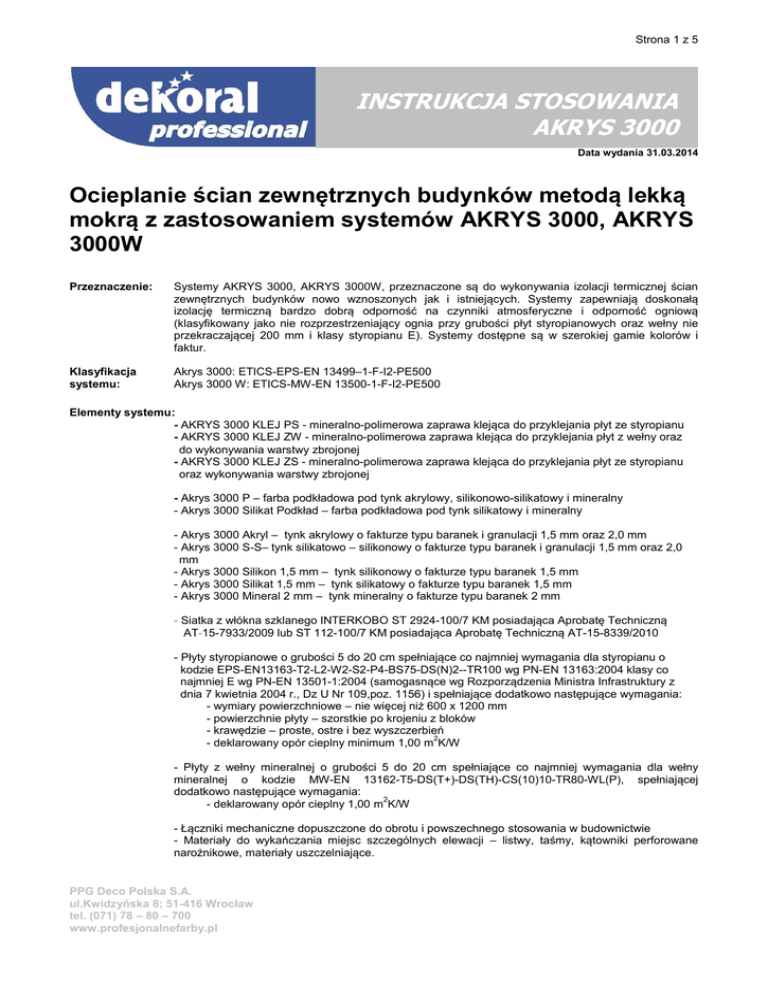 Strona 1 z 5 INSTRUKCJA STOSOWANIA AKRYS 3000 Data wydania 31.03.2014 Ocieplanie ścian zewnętrznych budynków metodą lekką mokrą z zastosowaniem systemów AKRYS 3000, AKRYS 3000W Przeznaczenie: Systemy AKRYS 3000, AKRYS 3000W, przeznaczone są do wykonywania izolacji termicznej ścian zewnętrznych budynków nowo wznoszonych jak i istniejących. Systemy zapewniają doskonałą izolację termiczną bardzo dobrą odporność na czynniki atmosferyczne i odporność ogniową (klasyfikowany jako nie rozprzestrzeniający ognia przy grubości płyt styropianowych oraz wełny nie przekraczającej 200 mm i klasy styropianu E). Systemy dostępne są w szerokiej gamie kolorów i faktur. Klasyfikacja systemu: Akrys 3000: ETICS-EPS-EN 13499–1-F-I2-PE500 Akrys 3000 W: ETICS-MW-EN 13500-1-F-I2-PE500 Elementy systemu: - AKRYS 3000 KLEJ PS - mineralno-polimerowa zaprawa klejąca do przyklejania płyt ze styropianu - AKRYS 3000 KLEJ ZW - mineralno-polimerowa zaprawa klejąca do przyklejania płyt z wełny oraz do wykonywania warstwy zbrojonej - AKRYS 3000 KLEJ ZS - mineralno-polimerowa zaprawa klejąca do przyklejania płyt ze styropianu oraz wykonywania warstwy zbrojonej - Akrys 3000 P – farba podkładowa pod tynk akrylowy, silikonowo-silikatowy i mineralny - Akrys 3000 Silikat Podkład – farba podkładowa pod tynk silikatowy i mineralny - Akrys 3000 Akryl – tynk akrylowy o fakturze typu baranek i granulacji 1,5 mm oraz 2,0 mm - Akrys 3000 S-S– tynk silikatowo – silikonowy o fakturze typu baranek i granulacji 1,5 mm oraz 2,0 mm - Akrys 3000 Silikon 1,5 mm – tynk silikonowy o fakturze typu baranek 1,5 mm - Akrys 3000 Silikat 1,5 mm – tynk silikatowy o fakturze typu baranek 1,5 mm - Akrys 3000 Mineral 2 mm – tynk mineralny o fakturze typu baranek 2 mm - Siatka z włókna szklanego INTERKOBO ST 2924-100/7 KM posiadająca Aprobatę Techniczną AT-15-7933/2009 lub ST 112-100/7 KM posiadająca Aprobatę Techniczną AT-15-8339/2010 - Płyty styropianowe o grubości 5 do 20 cm spełniające co najmniej wymagania dla styropianu o kodzie EPS-EN13163-T2-L2-W2-S2-P4-BS75-DS(N)2--TR100 wg PN-EN 13163:2004 klasy co najmniej E wg PN-EN 13501-1:2004 (samogasnące wg Rozporządzenia Ministra Infrastruktury z dnia 7 kwietnia 2004 r., Dz U Nr 109,poz. 1156) i spełniające dodatkowo następujące wymagania: - wymiary powierzchniowe – nie więcej niż 600 x 1200 mm - powierzchnie płyty – szorstkie po krojeniu z bloków - krawędzie – proste, ostre i bez wyszczerbień 2 - deklarowany opór cieplny minimum 1,00 m K/W - Płyty z wełny mineralnej o grubości 5 do 20 cm spełniające co najmniej wymagania dla wełny mineralnej o kodzie MW-EN 13162-T5-DS(T+)-DS(TH)-CS(10)10-TR80-WL(P), spełniającej dodatkowo następujące wymagania: 2 - deklarowany opór cieplny 1,00 m K/W - Łączniki mechaniczne dopuszczone do obrotu i powszechnego stosowania w budownictwie - Materiały do wykańczania miejsc szczególnych elewacji – listwy, taśmy, kątowniki perforowane narożnikowe, materiały uszczelniające. PPG Deco Polska S.A. ul.Kwidzyńska 8; 51-416 Wrocław tel. (071) 78 – 80 – 700 www.profesjonalnefarby.pl Strona 2 z 5 Elementy systemów ociepleń Akrys 3000 i Akrys 3000 W: L.p. 1 2 3 4 Elementy systemu Zaprawa klejąca do przyklejania płyt 6 Masa tynkarska 2 3 4 Styropian Siatka z włókna szklanego Zaprawa klejąca do wykonywania warstwy zbrojonej 5 1 AKRYS 3000 Klej PS Materiał izolujący Preparat gruntujący L.p. AKRYS 3000 * ST 112-100/7 KM lub ST 2924KM-100/7 AKRYS 3000 Klej ZS AKRYS 3000 P AKRYS 3000 Silikon Podkład AKRYS 3000 Silikat Podkład AKRYS 3000 Silikat Podkład lub Akrys 3000 P Akrys 3000 S-S Podkład lub Akrys 3000 P AKRYS 3000 Akryl AKRYS 3000 Silikon AKRYS 3000 Silikat AKRYS 3000 Mineral Akrys 3000 S-S Elementy systemu Zaprawa klejąca do przyklejania płyt AKRYS 3000W AKRYS 3000 Klej ZW Materiał izolujący Wełna mineralna Siatka z włókna szklanego Zaprawa klejąca do wykonywania warstwy zbrojonej ST 112-100/7 KM ST 2924KM-100/7 * AKRYS 3000 Klej ZW 5 Preparat gruntujący AKRYS 3000 P AKRYS 3000 Silikon Podkład AKRYS 3000 Silikat Podkład AKRYS 3000 Silikat Podkład lub Akrys 3000 P Akrys 3000 S-S Podkład lub Akrys 3000 P 6 Masa tynkarska AKRYS 3000 Akryl AKRYS 3000 Silikon AKRYS 3000 Silikat AKRYS 3000 Mineral Akrys 3000 S-S W ramach danego systemu niedozwolone jest stosowanie produktów niewchodzących w skład danego systemu Narzędzia i sprzęt - Pace metalowe do nakładania zapraw mas klejących oraz mas tynkarskich - Pace z tworzywa sztucznego do zacierania mas tynkarskich - Pace pokryte papierem ściernym do wyrównywania powierzchni i krawędzi przyklejonych płyt z wełny mineralnej i styropianu - Piłki ręczne lub specjalistyczne noże do cięcia płyt - Mieszadła koszykowe, wolnoobrotowe * Siatka ST 2924KM-100/7 jest przeznaczona do stosowana w zestawach z Akrys 3000 Silikon Podkład + Akrys 3000 Silikon, Akrys 3000 Silikat Podkład + Akrys 3000 Mineral lub Akrys 3000 Silikat Podkład + Akrys 3000 Silikat PPG Deco Polska S.A. ul.Kwidzyńska 8; 51-416 Wrocław tel. (071) 78 – 80 – 700 www.profesjonalnefarby.pl Strona 3 z 5 - Wiertarki do wiercenia otworów na łączniki - Aparaty do zmywania powierzchni ścian - Rusztowania systemowe, siatki ochronne Wskazówki wykonawcze Na efekt końcowy wykonanej wyprawy tynkarskiej może mieć wpływ rodzaj podłoża. Dlatego też, w przypadku występowania podłoża zróżnicowanego (jak np. tynk cementowo-wapienny połączony z podłożem betonowym) zaleca się wcześniejsze przeszpachlowanie jego całej powierzchni zaprawą klejowo-szpachlową (np. Akrys 3000 ZW lub ZS). Przygotowanie podłoża i elewacji Podłoże musi być nośne, odtłuszczone, czyste i suche oraz wolne od kurzu, plam i wykwitów pochodzenia biologicznego i chemicznego (solnych lub korozyjnych). W przypadku występowania tego rodzaju plam i wykwitów należy zastosować specjalne materiały przeznaczone do ich likwidacji. Wszelkie luźne, ni