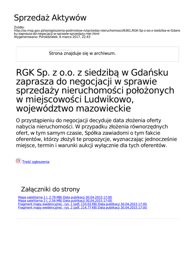 Sprzedaż Aktywów Źródło: http://se.msp.gov.pl/se/ogloszenia-podmiotow-n/sprzedaz-nieruchomosci/6361,RGK-Sp-z-oo-z-siedziba-w-Gdans ku-zaprasza-do-negocjacji-w-sprawie-sprzedazy-nier.html Wygenerowano: Poniedziałek, 6 marca 2017, 22:43 Strona znajduje się w archiwum. RGK Sp. z o.o. z siedzibą w Gdańsku zaprasza do negocjacji w sprawie sprzedaży nieruchomości położonych w miejscowości Ludwikowo, województwo mazowieckie O przystąpieniu do negocjacji decyduje data złożenia oferty nabycia nieruchomości. W przypadku złożenia równorzędnych ofert, w tym samym czasie, Spółka zawiadomi o tym fakcie oferentów, którzy złożyli te propozycje, wyznaczając jednocześnie miejsce, termin i warunki aukcji wyłącznie dla tych oferentów. Treść ogłoszenia Załączniki do strony Mapa satelitarna 1 (, 2.79 MB) Data publikacji 30.04.2015 17:00 Mapa satelitarna 2 (, 2.56 MB) Data publikacji 30.04.2015 17:00 Fragment mapy ewidencyjnej - rys. 1 (pdf, 110.02 KB) Data publikacji 30.04.2015 17:00 Fragment mapy ewidencyjnej - rys. 2 (pdf, 214.77 KB) Data publikacji 30.04.2015 17:00 Opublikowane przez: Aleksandra Sierpińska Ostatnia zmiana: 30.04.2015 , 04.05.2015 Autor: ENERGA S.A. Aleksandra Sierpińska Rejestr zmian