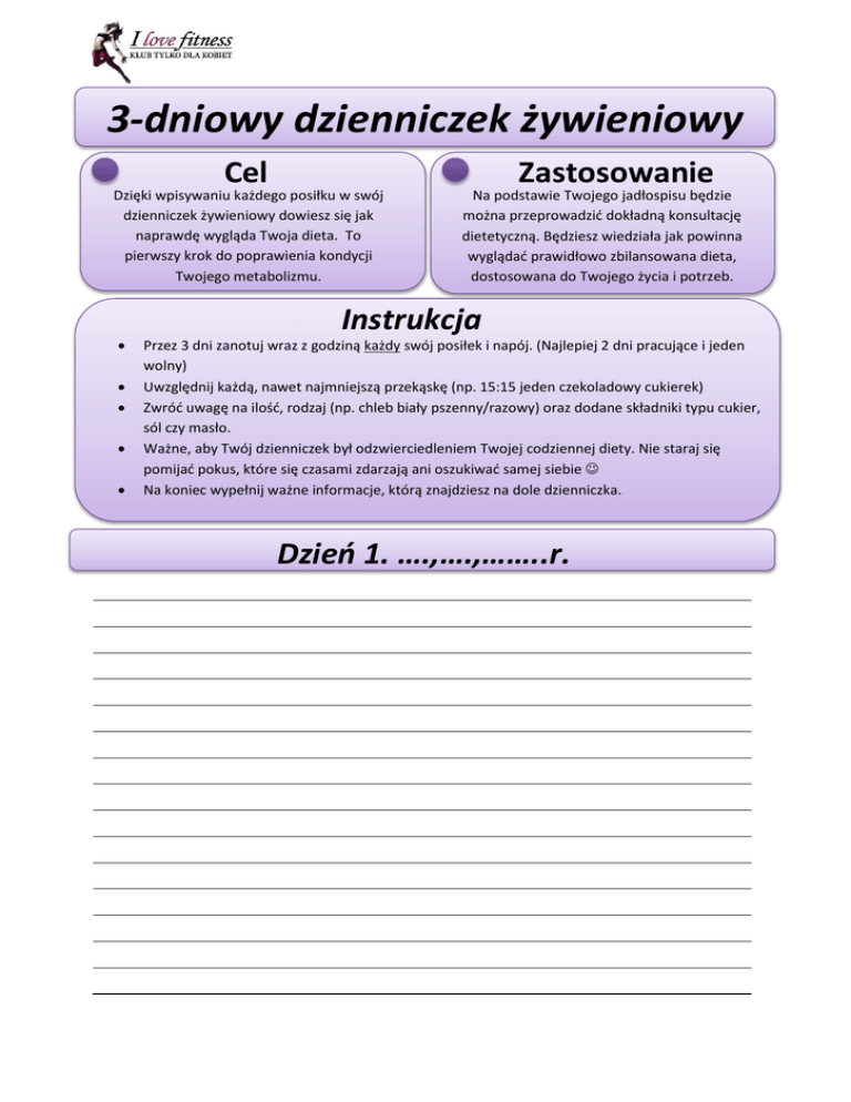 3-dniowy dzienniczek żywieniowy Cel Dzięki wpisywaniu każdego posiłku w swój dzienniczek żywieniowy dowiesz się jak naprawdę wygląda Twoja dieta. To pierwszy krok do poprawienia kondycji Twojego metabolizmu. Zastosowanie Na podstawie Twojego jadłospisu będzie można przeprowadzić dokładną konsultację dietetyczną. Będziesz wiedziała jak powinna wyglądać prawidłowo zbilansowana dieta, dostosowana do Twojego życia i potrzeb. Instrukcja Przez 3 dni zanotuj wraz z godziną każdy swój posiłek i napój. (Najlepiej 2 dni pracujące i jeden wolny) Uwzględnij każdą, nawet najmniejszą przekąskę (np. 15:15 jeden czekoladowy cukierek) Zwróć uwagę na ilość, rodzaj (np. chleb biały pszenny/razowy) oraz dodane składniki typu cukier, sól czy masło. Ważne, aby Twój dzienniczek był odzwierciedleniem Twojej codziennej diety. Nie staraj się pomijać pokus, które się czasami zdarzają ani oszukiwać samej siebie Na koniec wypełnij ważne informacje, którą znajdziesz na dole dzienniczka. Dzień 1. ….,….,……..r. Dzień 2. ….,….,……..r. Dzień 3. ….,….,……..r. Ważne informacje Tryb pracy Jak spędzasz czas wolny? Ile razy w tygodniu ćwiczysz? Co? Ile czasu? Co lubisz jeść? Czego kategorycznie nie? Alergie? Uczulenia? Choroby? (przyjdź z ostatnimi wynikami badań) Przyjmujesz leki/suplementy na stałe? Jakie? Wypełniony formularz prześlij na maila [email protected] minimum 2 dni przed planowaną konsultacją.