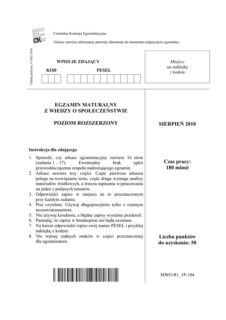 Centralna Komisja Egzaminacyjna Układ graficzny © CKE 2010 Arkusz zawiera informacje prawnie chronione do momentu rozpoczęcia egzaminu. WPISUJE ZDAJĄCY KOD PESEL Miejsce na naklejkę z kodem EGZAMIN MATURALNY Z WIEDZY O SPOŁECZEŃSTWIE POZIOM ROZSZERZONY SIERPIEŃ 2010 Instrukcja dla zdającego 1. Sprawdź, czy arkusz egzaminacyjny zawiera 16 stron (zadania 1 – 17). Ewentualny brak zgłoś przewodniczącemu zespołu nadzorującego egzamin. 2. Arkusz zawiera trzy części. Część pierwsza arkusza polega na rozwiązaniu testu, część druga wymaga analizy materiałów źródłowych, a trzecia napisania wypracowania na jeden z podanych tematów. 3. Odpowiedzi zapisz w miejscu na to przeznaczonym przy każdym zadaniu. 4. Pisz czytelnie. Używaj długopisu/pióra tylko z czarnym tuszem/atramentem. 5. Nie używaj korektora, a błędne zapisy wyraźnie przekreśl. 6. Pamiętaj, że zapisy w brudnopisie nie będą oceniane. 7. Na karcie odpowiedzi wpisz swój numer PESEL i przyklej naklejkę z kodem. 8. Nie wpisuj żadnych znaków w części przeznaczonej dla egzaminatora. Czas pracy: 180 minut Liczba punktów do uzyskania: 50 MWO-R1_1P-104 Egzamin maturalny z wiedzy o społeczeństwie Poziom rozszerzony 2 Zadanie 1. (2 pkt) Na podstawie fragmentu tekstu Konstytucji RP i własnej wiedzy rozstrzygnij, które zdania są prawdziwe, a które fałszywe. W tabelę wpisz odpowiednio: Prawda lub Fałsz. 1. 2. 3. 4. 5. Tryb legislacyjny Art. 122. Po zakończeniu postępowania określonego w art. 121 Marszałek Sejmu przedstawia uchwaloną ustawę do podpisu Prezydentowi Rzeczypospolitej. Prezydent Rzeczypospolitej podpisuje ustawę w ciągu 21 dni od dnia przedstawienia i zarządza jej ogłoszenie w Dzienniku Ustaw Rzeczypospolitej Polskiej. Przed podpisaniem ustawy Prezydent Rzeczypospolitej może wystąpić do Trybunału Konstytucyjnego z wnioskiem w sprawie zgodności ustawy z Konstytucją. Prezydent Rzeczypospolitej nie może odmówić podpisania ustawy, którą Trybunał Konstytucyjny uznał za zgodną z Konstytucją. Prezydent Rzeczypospolitej odmawia podpisania ustawy, którą Trybunał Konstytucyjny uznał za niezgodną z Konstytucją. Jeżeli jednak niezgodność z Konstytucją dotyczy poszczególnych przepisów ustawy, a Trybunał Konstytucyjny nie orzeknie, że są one nierozerwalnie związane z całą ustawą, Prezydent Rzeczypospolitej, po zasięgnięciu opinii Marszałka Sejmu, podpisuje ustawę z pominięciem przepisów uznanych za niezgodne z Konstytucją albo zwraca ustawę Sejmowi w celu usunięcia niezgodności. Jeżeli Prezydent Rzeczypospolitej nie wystąpił z wnioskiem do Trybunału Konstytucyjnego w trybie ust. 3, może z umotywowanym wnioskiem przekazać ustawę Sejmowi do ponownego rozpatrzenia. Po ponownym uchwaleniu ustawy przez Sejm większością 3/5 głosów w obecności co najmniej połowy ustawowej liczby posłów Prezydent Rzeczypospolitej w ciągu 7 dni podpisuje ustawę i zarządza jej ogłoszenie w Dzienniku Ustaw Rzeczypospolitej Polskiej. [...] Zdania A. B. C. D. Prawda / Fałsz Prezydent RP zarządza ogłoszenie ustawy w Dzienniku urzędowym Rzeczypospolitej Polskiej. Sejm może odrzucić veto Prezydenta RP kwalifikowaną większością głosów. Przed podpisaniem ustawy Prezydent RP musi uzyskać orzeczenie Trybunału Konstytucyjnego w sprawie jej zgodności z Konstytucją. Orzeczenie Trybunału Konstytucyjnego w sprawie zgodności ustawy z Konstytucją ma charakter wiążący i ostateczny. Zadanie 2. (1 pkt) Podkreśl trzy osoby, które w Polsce ponoszą odpowiedzialność przed Trybunałem Stanu. A. B. C. D. E. Prezydent Rzeczypospolitej Polskiej Prezes Rady Ministrów Rzecznik Praw Obywatelskich Prezes Narodowego Banku Polskiego Pierwszy Prezes Sądu Najwyższego Egzamin maturalny z wiedzy o społeczeństwie Poziom rozszerzony 3 Zadanie 3. (2 pkt) Do podanych funkcji Sejmu dobierz po dwie odpowiadające im kompetencje. W wyznaczone miejsca wpisz numery artykułów Konstytucji RP zawierających opis kompetencji. Funkcja kontrolna ............................................................ Funkcja kreacyjna ............................................................ Art. 115. Prezes Rady Ministrów i pozostali członkowie Rady Ministrów mają obowiązek udzielenia odpowiedzi na interpelacje i zapytania poselskie w ciągu 21 dni. Art. 120. Sejm uchwala ustawy zwykłą większością głosów w obecności co najmniej połowy ustawowej liczby posłów, chyba że Konstytucja przewiduje inną większość. Art. 159. Sejm może wyrazić ministrowi wotum nieufności. Wniosek o wyrażenie wotum nieufności może być zgłoszony przez co najmniej 69 posłów. Art. 209. Rzecznik Praw Obywatelskich jest powoływany przez Sejm za zgodą Senatu, na 5 lat. Art. 214. Członkowie Krajowej Rady Radiofonii i Telewizji są powoływani przez Sejm, Senat i Prezydenta Rzeczypospolitej. Zadanie 4. (2 pkt) Jakie są kompetencje podanych organów władzy sądowniczej? W wyznaczone miejsce wpisz właściwy numer. Trybunał Konstytucyjny ............... Naczelny Sąd Administracyjny ............... Sąd Najwyższy ............... 1. Sprawuje nadzór nad działalnością sądów powszechnych i wojskowych w zakresie orzekania. 2. Orzeka w sprawach odpowiedzialności konstytucyjnej osób zajmujących najważniejsze stanowiska państwowe. 3. Rozpoznaje środki odwoławcze od orzeczeń wojewódzkich sądów administracyjnych. 4. Rozstrzyga spory kompetencyjne pomiędzy centralnymi konstytucyjnymi organami państwa. Zadanie 5. (1 pkt) Uporządkuj chronologicznie wydarzenia. Wydarzenie najwcześniejsze oznacz numerem 1, kolejne 2, 3. A. Powstanie rządu Jerzego Buzka .............. B. Wybór Lecha Kaczyńskiego na Prezydenta RP .............. C. Wejście Polski do NATO .............. Zadanie 6. (1 pkt) Wymień imiona i nazwiska dwóch osób pełniących funkcję Rzecznika Praw Obywatelskich w Polsce w latach 1987–2010. ...............................................................