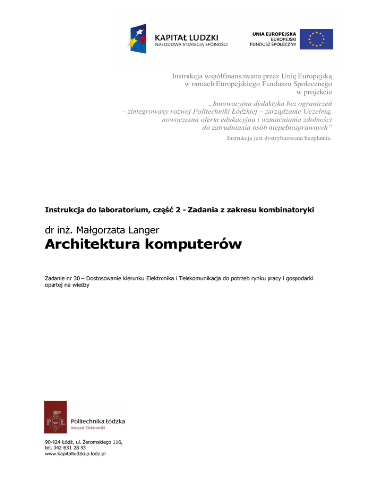 Instrukcja współfinansowana przez Unię Europejską w ramach Europejskiego Funduszu Społecznego w projekcie „Innowacyjna dydaktyka bez ograniczeń – zintegrowany rozwój Politechniki Łódzkiej – zarządzanie Uczelnią, nowoczesna oferta edukacyjna i wzmacniania zdolności do zatrudniania osób niepełnosprawnych” Instrukcja jest dystrybuowana bezpłatnie. Instrukcja do laboratorium, część 2 - Zadania z zakresu kombinatoryki dr inż. Małgorzata Langer Architektura komputerów Zadanie nr 30 – Dostosowanie kierunku Elektronika i Telekomunikacja do potrzeb rynku pracy i gospodarki opartej na wiedzy 90-924 Łódź, ul. Żeromskiego 116, tel. 042 631 28 83 www.kapitalludzki.p.lodz.pl Instrukcja współfinansowana przez Unię Europejską w ramach Europejskiego Funduszu Społecznego Ćwiczenia w obliczaniu działań logicznych: Przykładowe zadania typu: „Oblicz wartość funkcji F=A’BC + (AB’)(A + C’) dla A=0; B=1; C=1” Różna postać zapisów dwójkowych: KOD BCD Każda cyfra zapisu dziesiętnego zapisywana jest w 4 bitach dwójkowych – czyli 2 cyfry znajdują się w jednym bajcie, 4 są upakowane w jednym słowie 16-bitowym, itd. Przykład zapisu w słowie 16-bitowym: Notacja Dziesiętna 3 53 738 Zapis w kodzie BCD 0000000000000011 0000000001010011 0000011100111000 Przykładowe zadania typu: „Podaj wartość liczby w zapisie dziesiętnym: 1001100100000101” „Przekształć liczbę 57910 w kod BCD” U2 - kod uzupełnieniowy do dwóch Ogólny zapis uzupełnienia liczby całkowitej N w notacji r ma postać: [ N ]r = r n − ( N ) r gdy ( N ) r ≠ 0 =0 gdy ( N )r = 0 gdzie n – jest liczbą cyfr liczby N, natomiast [N]r oznacza jej uzupełnienie do r Uzupełnienie do 10 dla liczby (2345)10 ma postać: 104 – 2345 = 10000 – 2345 = 7655 U2 – uzupełnienie do dwóch dla n-bitowej liczby binarnej ma postać: 2n – liczba binarna 90-924 Łódź, ul. Żeromskiego 116, tel. 042 631 28 83, www.kapitalludzki.p.lodz.pl 2/5 Instrukcja współfinansowana przez Unię Europejską w ramach Europejskiego Funduszu Społecznego Przykłady obliczeń: [01010]2 = 25 – (01010) = 100000 – 01010 = 10110 [0.0010]2 = 21 – (0.0010) = 10.0000 – 0.0010 = 1.1110 Sprawdź skrócony sposób obliczania U2 – zamienić każde 0 na 1 i każdą 1 na 0 oraz dodać 1 do najmniej znaczącego bitu Przykładowe pytania testu: „Zapisz uzupełnienie do 10 następującej liczby”; „Zapisz uzupełnienie do 2 następującej liczby” Tablice prawdy Dla n zmiennych logicznych istnieje 2n możliwych kombinacji wartości tych zmiennych. Dla funkcji wielu zmiennych logicznych można przygotować tabele - tablice prawdy – gdzie dla każdej możliwej kombinacji tych zmiennych podaje się wartość funkcji. Aby uwzględnić wszystkie kombinacje, - zmienna w skrajnej prawej kolumnie zmienia swoją wartość przemiennie: 0 – 1 – 0 – 1 - zmienna sąsiadująca z lewej co dwa wiersze: 0 – 0 – 1 – 1 – 0 – 0 – 1 - zmienna kolejna co 4 wiersze: 0 – 0 – 0 – 0 – 1 – 1 – 1 – 1 itd. Dla ułatwienia obliczeń, można obliczać również wyrażenia cząstkowe (jak w poniższym przykładzie – w pomocniczych kolumnach) Przykład: F = AB’ + A’C + A’B’C A 0 0 0 0 1 1 1 1 B 0 0 1 1 0 0 1 1 C 0 1 0 1 0 1 0 1 A’ 1 1 1 1 0 0 0 0 B’ 1 1 0 0 1 1 0 0 AB’ 0 0 0 0 1 1 0 0 A’C 0 1 0 1 0 0 0 0 A’B’C 0 1 0 0 0 0 0 0 F 0 1 0 1 1 1 0 0 Nie zawsze dysponujemy zminimalizowaną postacią funkcji, jak w powyższym przykładzie. Pierwszą czynnością dla przygotowania układu logicznego jest raczej wypełnienie tablicy prawdy. Na podstawie wartości funkcji wpisanych do tablicy prawdy możemy następnie odtworzyć i zminimalizować postać funkcji. 90-924 Łódź, ul. Żeromskiego 116, tel. 042 631 28 83, www.kapitalludzki.p.lodz.pl 3/5 Instrukcja współfinansowana przez Unię Europejską w ramach Europejskiego Funduszu Społecznego Otrzymaną postacią funkcji są odpowiednio: - SOP (suma iloczynów) - POS (iloczyn sum) Można je uzyskać bezpośrednio z tablicy prawdy. Procedura otrzymania SOP 1. Dla każdego wiersza, gdzie wartość funkcji = 1 tworzymy iloczyn zmiennych 2. W każdym iloczynie wpisujemy zmienną, jeżeli w tym wierszu jej wartość = 1 oraz negację zmiennej, jeżeli w tym wierszu jej wartość = 0 3. Kolejne iloczyny są składnikami sumy logicznej Procedura otrzymania POS 1. Dla każdego wiersza, gdzie wartość funkcji = 0 tworzymy sumę zmiennych 2. W każdej sumie wpisujemy zmienną, jeżeli w tym wierszu jej wartość = 0 oraz negację zmiennej, jeżeli w tym wierszu jej wartość = 1 3. Kolejne sumy są czynnikami iloczynu logicznego Dla tablicy ze strony poprzedniej: SOP: F = A’B’C + A’BC + AB’C’ + AB’C POS: (A + B + C) (A + B’ + C) (A’ + B’ + C) (A’ + B’ + C’) Jest to postać kanoniczna funkcji – w każdym wyrazie (odpowiednio czynniku lub składniku) występują wszystkie zmienne (w postaci prostej lub zanegowanej). Inna nazwa SOP – miniterm; POS – maxterm. Postać kanoniczna może najczęściej zostać później zminimalizowana. Skrócone, sformalizowane zapisy dla postaci kanonicznych: Korzystając z powyższego przykładu: Dla sumy iloczynów – SOP. F(A,B,C) w postaci binarnej: wartości dziesiętne = A’B’C + A’BC + AB’C’ + AB’C 001 011 100 101 1 3 4 5 zapis formalny = ∑m(1,3,4,5) 90-924 Łódź, ul. Żeromskiego 116, tel. 042 631 28 83, www.kapitalludzki.p.lodz.pl 4/5 Instrukcja współfinansowana przez Unię Europejską w ramach Europejskiego Funduszu Społecznego Dla iloczynu sum – POS. F(A,B,C) = (A + B + C) (A + B’ + C) (A’ + B’ + C) (A’ + B’ + C’) w postaci binarnej zapisujemy odwrotnie: 1 dla wartości zanegowanej i 0 dla prostej 000 010 110 111 wartości dziesiętne 0 2 6 7 zapis formalny = ∏M(0,2,6,7) UWAGA: Znając jeden zapis – drugi tworzymy automatycznie, gdyż wyrazy w obu postaciach kanonicznych tworzą zbiór pełny i nie powtarzają się. Przykładowe pytanie