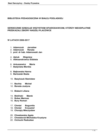 Nasi Darczyńcy - Osoby Prywatne BIBLIOTEKA PEDAGOGICZNA W BIAŁEJ PODLASKIEJ SERDECZNIE DZIĘKUJE WSZYSTKIM OFIARODAWCOM, KTÓRZY NIEODPŁATNIE PRZEKAZALI ZBIORY NASZEJ PLACÓWCE W LATACH 2006-2017 1. Adamczuk Jarosław 2. Adamczuk Renata 3. prof. dr hab. Adamowski Jan 4. Ajziuk Zbigniew 5. Aleksandrowicz Elżbieta 6. Antuszewicz Maria 7. Badyńska Monika 8. Bajkowska Hanna 9. Bartosiak Beata 10. Bazylczuk Stanisław 11. Bechta Michał 12. Bereda Justyna 13. Białach Liliana 14. Bieliński Marek 15. Bober Mariusz 16. Bury Roman 17. Chmiel Bogumiła 18. Chmiel Krzysztof 19. Chorąży Mieczysław 20. Chwalewska Agata 21. Chwedoruk-Michalska Krystyna 22. Cichocki Radosław 1/6 Nasi Darczyńcy - Osoby Prywatne 23. Ciepły Leszek 24. Czarnecki Ryszard 25. Czernik Jan 26. Daniluk Jacek 27. dr Demidowicz 28. Denkiewicz Ada Tomasz 29. Denkiewicz Anna 30. Dobosz Katarzyna 31. Doroszuk Renata 32. Dubaniewicz Walentyna 33. Duda Marek 34. Efimow Mikołaj 35. Fabian Kamil 36. Filipiak Michał 37. dr Flisiński Jerzy 38. Gębala Ewa 39. Gibasiewicz Wanda 40. Głowacka Joanna 41. Golanko Waldemar 42. Gondowiczowie Joanna i Jan 43. Hałabuda Ada 44. Hołownia Malwina 45. Hordejuk Sławomir 46. Hubczuk Marcin 47. Izdebska Wioletta 48. 49. 50. 51. Jadczak Stanisław Jankowska Irena Jeleń Zofia Johnson Agnieszka 52. dr Kalinowski Szczepan 53. Kieczka Joanna 54. Klebaniuk Marian Zygmunt 2/6 Nasi Darczyńcy - Osoby Prywatne 55. Kłusek Izabela 56. Kochan Krzysztof 57. Konopiuk Marzena 58. prof. Korczyński Mariusz 59. dr Korzeniewski Bogusław 60. Kosyra-Cieślak Teresa 61. Kotkowski Zbigniew 62. Kowalczyk Grażyna 63. prof. Kowalczykowa 64. Koziara Ewa Alina 65. Kubin Jerzy 66. Kuc Elżbieta 67. Kuczewska Anna 68. 69. 70. 71. Kulawiec Agnieszka Kulawiec Edyta Kurowska Marzanna Kuzioła Wojciech 72. Laskowska Katarzyna 73. Leleń Urszula 74. Lemieszek Zofia 75. Lenz Renata 76. Lewandowski Remigiusz 77. Litwiniuk Ewelina 78. Łotocka-Wyczółkowska Barbara 79. Łukaszuk Anna 80. 81. 82. 83. Łuszczewska Agata Machnio Ryszard Machuła Ryszard Maj Renata 84. Majchrowska Jolanta 85. Makowska Ewa 86. Masarz Bożena 3/6 Nasi Darczyńcy - Osoby Prywatne 87. 88. 89. 90. Mateńko Iwona dr Matysiuk Renata Melaniuk Barbara Melaniuk Renata 91. 92. 93. 94. 95. 96. 97. Milewicz Bożena Michalak Ewa Michalczuk Anna Michałowski Grzegorz Michońska Ewa prof. Mierzwiński Henryk Mikucewicz Marta 98. Mirończuk Justyna 99. Mirończuk Robert 100. Mleczak Małgorzata 101. Morange Andżelika 102. Morochow Anna 103. Nazaruk Stanisława 104. Nerwińska Justyna 105. dr Nikitin Siergiy 106. Nowotniak Jolanta 107. Oksiejuk Katarzyna i Robert 108. Oleszczuk Anna 109. Orluk Krystyna 110. Osipiuk Agnieszka 111. Pakuła Paweł 112. Panasiuk Dorota 113. Parafiniuk Maria 114. Pasik Jan i Małgorzata 115. Piasecki Michał 116. Piesiak Mariusz 117. Polak Anna 118. Pomorska Krystyna 119. Pomorski Jarosław 120. Popławska Elżbieta 4/6 Nasi Darczyńcy - Osoby Prywatne 121. Popławska Renata 122. Robak Tadeusz 123. Romaniuk Jadwiga 124. prof. dr hab. Rosa Ryszard 125. Rychlik Rafał 126. dr Jerzy Rydzewski 127. Sacharuk Anna 128. Sacewicz Paulina 129. Sawczuk Krystyna 130. Sebastianiuk Katarzyna 131. 132. 133. 134. Sidorowicz Marzena Siekielewska Aneta dr Sikora Dariusz Skolimowski Rudolf 135. Srzednicka Krystyna 136. Suchożerbska Sławomira 137. 138. 139. 140. Sulikowska Aleksandra Szczuka Kazimiera Szlaska Magdalena Szucka Milena 141. 142. 143. 144. Szucki Włodzimierz Szupiluk Grzegorz Szydłowska Monika Światłowscy Maria i Marek 145. Świć Adam 146. Toś Marek 147. Trębicki Dariusz 148. Trudzik Jerzy 149. Trzebiński Łukasz 150. Urbańska Łucja 151. Wagner Ireneusz 152. Wawryszuk Zygmunt 5/6 Nasi Darczyńcy - Osoby Prywatne 153. 154. 155. 156. Wegiera Aleksandra Wegiera Jerzy Weremczuk Halina Wickiewicz Janina 157. Wierzejski Kamil 158. Wilbik Andrzej 159. Wilkowski Eugeniusz 160. Woch Marzena 161. 162. 163. 164. 165. Wojtczuk-Turek Agnieszka Wójcicka-Miechowicz Jowita Wołosiuk Beata Wołosz Elżbieta Wójcicka-Miechowicz Jowita 166. Wroński Stanisław 167. Wrzosek Sylwia 168. Wysokińska Barbara 169. Zalewska Zofia 170. Złotkowski 171. Żarnowska 172. Żukowska Bronisław Agnieszka Teresa Bardzo dziękujemy wszystkim ofiarodawcom za ich pomoc i życzliwość. Dary opatrzone zostały etykietą z imieniem i nazwiskiem, co jest wyrazem naszych podziękowań i jednocześnie uhonorowaniem Ofiarodawców. 6/6
