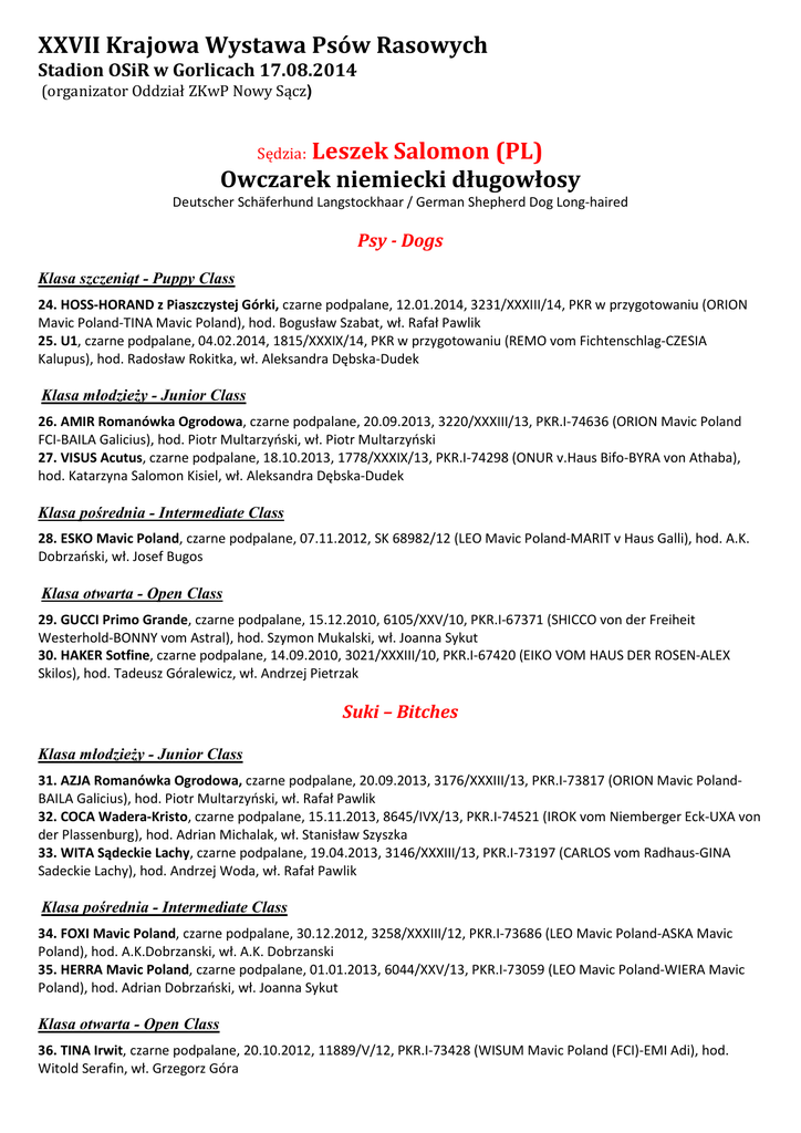 XXVII Krajowa Wystawa Psów Rasowych Stadion OSiR w Gorlicach 17.08.2014 (organizator Oddział ZKwP Nowy Sącz) Leszek Salomon (PL) Owczarek niemiecki długowłosy Sędzia: Deutscher Schäferhund Langstockhaar / German Shepherd Dog Long-haired Psy - Dogs Klasa szczeniąt - Puppy Class 24. HOSS-HORAND z Piaszczystej Górki, czarne podpalane, 12.01.2014, 3231/XXXIII/14, PKR w przygotowaniu (ORION Mavic Poland-TINA Mavic Poland), hod. Bogusław Szabat, wł. Rafał Pawlik 25. U1, czarne podpalane, 04.02.2014, 1815/XXXIX/14, PKR w przygotowaniu (REMO vom Fichtenschlag-CZESIA Kalupus), hod. Radosław Rokitka, wł. Aleksandra Dębska-Dudek Klasa młodzieży - Junior Class 26. AMIR Romanówka Ogrodowa, czarne podpalane, 20.09.2013, 3220/XXXIII/13, PKR.I-74636 (ORION Mavic Poland FCI-BAILA Galicius), hod. Piotr Multarzyński, wł. Piotr Multarzyński 27. VISUS Acutus, czarne podpalane, 18.10.2013, 1778/XXXIX/13, PKR.I-74298 (ONUR v.Haus Bifo-BYRA von Athaba), hod. Katarzyna Salomon Kisiel, wł. Aleksandra Dębska-Dudek Klasa pośrednia - Intermediate Class 28. ESKO Mavic Poland, czarne podpalane, 07.11.2012, SK 68982/12 (LEO Mavic Poland-MARIT v Haus Galli), hod. A.K. Dobrzański, wł. Josef Bugos Klasa otwarta - Open Class 29. GUCCI Primo Grande, czarne podpalane, 15.12.2010, 6105/XXV/10, PKR.I-67371 (SHICCO von der Freiheit Westerhold-BONNY vom Astral), hod. Szymon Mukalski, wł. Joanna Sykut 30. HAKER Sotfine, czarne podpalane, 14.09.2010, 3021/XXXIII/10, PKR.I-67420 (EIKO VOM HAUS DER ROSEN-ALEX Skilos), hod. Tadeusz Góralewicz, wł. Andrzej Pietrzak Suki – Bitches Klasa młodzieży - Junior Class 31. AZJA Romanówka Ogrodowa, czarne podpalane, 20.09.2013, 3176/XXXIII/13, PKR.I-73817 (ORION Mavic PolandBAILA Galicius), hod. Piotr Multarzyński, wł. Rafał Pawlik 32. COCA Wadera-Kristo, czarne podpalane, 15.11.2013, 8645/IVX/13, PKR.I-74521 (IROK vom Niemberger Eck-UXA von der Plassenburg), hod. Adrian Michalak, wł. Stanisław Szyszka 33. WITA Sądeckie Lachy, czarne podpalane, 19.04.2013, 3146/XXXIII/13, PKR.I-73197 (CARLOS vom Radhaus-GINA Sadeckie Lachy), hod. Andrzej Woda, wł. Rafał Pawlik Klasa pośrednia - Intermediate Class 34. FOXI Mavic Poland, czarne podpalane, 30.12.2012, 3258/XXXIII/12, PKR.I-73686 (LEO Mavic Poland-ASKA Mavic Poland), hod. A.K.Dobrzanski, wł. A.K. Dobrzanski 35. HERRA Mavic Poland, czarne podpalane, 01.01.2013, 6044/XXV/13, PKR.I-73059 (LEO Mavic Poland-WIERA Mavic Poland), hod. Adrian Dobrzański, wł. Joanna Sykut Klasa otwarta - Open Class 36. TINA Irwit, czarne podpalane, 20.10.2012, 11889/V/12, PKR.I-73428 (WISUM Mavic Poland (FCI)-EMI Adi), hod. Witold Serafin, wł. Grzegorz Góra 37. XAVIA vom Schwarzwald, czarne podpalane, 14.09.2012, 1406/XLVI /12, PKR.I-72160 (YUGO vom Altenberger LandFERIE Team V-Max), hod. Joanna Filipecka, wł. Marceli Nieciąg Klasa użytkowa - Working Class 38. DEJZI Mavic Poland, czarne podpalane, 05.11.2012, 3139/XXXIII/12, PKR.I-73146 (PACCO v Langebungert-VARINA v Farbenspiel), hod. A.K.Dobrzanski, wł. Pawel Bado Stanisław Abłamowicz (PL) Owczarek niemiecki krótkowłosy Sędzia: Deutscher Schäferhund Stockhaar / German Shepherd Dog Short-haired Psy - Dogs Klasa szczeniąt - Puppy Class 39. NEIKO Aksaris, czarne podpalane, 30.12.2013, 8696/XIV/13, PKR w przygotowaniu (ALDO Aksaris-WIWA Aksaris), hod. Kulik Jacek, wł. Grzegorz Koziara 40. ONDO vom Huhnegrab, czarne podpalane, 06.11.2013, 15059/XV/13, PKR w przygotowaniu (YANKEE vom Feuermelder-IRINA vom Huhnegrab), hod. Heinz Scheerer, wł. Bernard Famuła Klasa młodzieży - Junior Class 41. FINO von der Piste Trophe, czarne podpalane, 09.10.2013, 15099/XV/13, PKR w przygotowaniu (YANKEE vom Feuermeider-HILARY von der Piste Trophe), hod. Erich Bosl, wł. Bernard Famuła Klasa otwarta - Open Class 42. BECKHAM von Gran Peregrino, wilczaste, 18.05.2012, 29834/II/12, PKR.I-71933 (NINO von Tronje-MILLA vom Fichtenschlag-Zwinger), hod. Alexander Moscoa Zeledon, wł. Anetta Anetta Szczerbic 43. IGOR Orrylordblack, czarno-szare, 01.03.2013, 8703/XIV/13, PKR.I-75010 (KATO Aritar Bastet-ENNY z Lomeckeho Polesi), hod. Orrylordblack, wł. Stefano Alacqua Klasa użytkowa 44. HARRY von der Glockenheide, czarne podpalane, 20.07.2010, 28786/II/10, PKR.I-67167 (AREX von der Wilhelmswarte-CESSY von Trafalga), hod. Sigrid Becker, wł. Robert Rubacha 45. Falkoen's RAMOS, czarne podpalane, 14.12.2011, 8499/XIV/11, PKR.I-73400 (ROY del Reventino-REA vom Hamburger Land), hod. Kjell Olaf Olsen, wł. Andrzej Piwowar Suki – Bitches Klasa młodszych szczeniąt - Minor Puppy 46. BINET Mavic Poland, czarne podpalane, 16.03.2014, 3298/XXVIII/14, PKR w przygotowaniu (LUCKY Mavic PolandANET V Haus Galli), hod. A.K. Dobrzański, wł. A.K. Dobrzański 47. CONNIE Żabieńska Zagroda, czarne podpalane, 18.03.2014, 3284/XXXIII/14, PKR w przygotowaniu (ZORKO z Kojca Elbikame-IZKA Adi), hod. Zbigniew Panek, wł. Aneta Kępowicz 48. IGUA vom TeamAlhambra, czarne podpalane, 08.03.2014, 8749/XIV/14, PKR w przygotowaniu (Falkoen's RAMOSLUNA ze Skalnego Wzgórza), hod. Andrzej Piwowar, wł. Andrzej Piwowar 49. MIRA Fikusar, czarne podpalane, 26.02.2014, 9698/XIV/14, PKR w przygotowaniu (VADIM von Aurelius-BAXI Fikusar), hod. Koziara Grzegorz, wł. Grzegorz Koziara 50. MOLI Fikusar, czarne podpalane, 26.02.2014, 9699/XIV/14, PKR w przygotowaniu (VADIM von Aurelius-BAXI Fikusar), hod. Koziara Grzegorz, wł. Grzegorz Koziara Klasa szczeniąt - Puppy Class 51. JURI Ontopus (FCI), czarne podpalane, 13.01.2014, 30515/II/14, PKR w przygotowaniu (VADIM von Aurelius-BARINA Ontopus), hod. Robert Rubacha, wł. Robert Rubacha 52. MOLLY Aksaris, czarne podpalane, 10.12.2013, 8697/XIV/13, PKR.I-74926 (TOGO Aksaris-AFRA Aksaris), hod. Jacek Kulik, wł. Wiesław Piecuch Klasa młodzieży - Junior Class 53. CESI Kenola, czarne podpalane, 16.07.2013, 3174/XXXIII/13, PKR.I-73820 (REMO vom Fichtenschlag-CONDA vom Frankengold), hod. Sebastian Zajączkowski, wł. Małgorzata Chmielek 54. IRIS Ontopus, czarne podpalane, 17.02.201