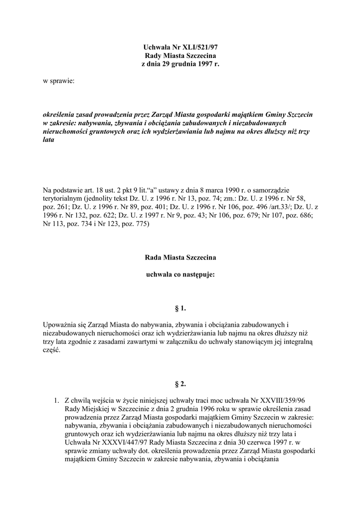 Uchwała Nr XLI/521/97 Rady Miasta Szczecina z dnia 29 grudnia