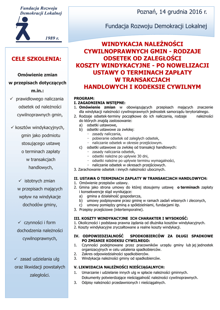 14 grudnia 2016 r. Rozwiązania Poznań, informatyczne Fundacja Rozwoju Demokracji Lokalnej CELE SZKOLENIA: Omówienie zmian w przepisach dotyczących m.in.: prawidłowego naliczania odsetek od należności cywilnoprawnych gmin, kosztów windykacyjnych, gmin jako podmiotu stosującego ustawę o terminach zapłaty w transakcjach handlowych, istotnych zmian w przepisach mających wpływ na windykacje dochodów gminy, czynności i form dochodzenia należności cywilnoprawnych, zasad udzielania ulg oraz likwidacji powstałych zaległości. WINDYKACJA NALEŻNOŚCI CYWILNOPRAWNYCH GMIN - RODZAJE ODSETEK OD ZALEGŁOŚCI KOSZTY WINDYKACYJNE - PO NOWELIZACJI USTAWY O TERMINACH ZAPŁATY W TRANSAKCJACH HANDLOWYCH I KODEKSIE CYWILNYM PROGRAM: I. ZAGADNIENIA WSTĘPNE: 1. Omówienie zmian w obowiązujących przepisach mających znaczenie dla windykacji należności cywilnoprawnych jednostek samorządu terytorialnego. 2. Rodzaje odsetek-terminy początkowe do ich naliczania, rodzaje należności do których znajdą zastosowanie: a) odsetki ustawowe, b) odsetki ustawowe za zwłokę: - zasady naliczania, - pobieranie odsetek od zaległych odsetek, - naliczanie odsetek w okresie przejściowym. c) odsetki ustawowe za zwłokę od transakcji handlowych: - zasady naliczania odsetek, - odsetki należne po upływie 30 dni, - odsetki należne po upływie terminu wymagalności, - naliczanie odsetek w okresach przejściowych. 3. Zarachowanie odsetek i innych należności ubocznych. II. USTAWA O TERMINACH ZAPŁATY W TRANSAKCJACH HANDLOWYCH: 1. Omówienie przepisów ustawy. 2. Gmina jako strona umowy do której stosujemy ustawę o terminach zapłaty i konsekwencje stąd wynikające: a) gmina a działalność gospodarcza, b) umowy podpisywane przez gminę w ramach zadań własnych i zleconych, c) umowy pomiędzy gminą a spółdzielniami, fundacjami itp. 3. Przepisy przejściowe (intertemporalne). III. KOSZTY WINDYKACYJNE ICH CHARAKTER I WYSOKOŚĆ: 1. Okoliczności i podstawa prawna żądania od dłużnika kosztów windykacyjnych. 2. Koszty windykacyjne zryczałtowane a realne koszty windykacji. IV. ODPOWIEDZIALNOŚĆ SPODKOBIERCÓW ZA DŁUGI SPADKOWE PO ZMIANIE KODEKSU CYWILNEGO: 1. Czynności podejmowane przez pracowników urzędu gminy lub jej jednostek organizacyjnych w celu ustalenia spadkobierców. 2. Zakres odpowiedzialności spadkobierców. 3. Windykacja należności gminy od spadkobierców. V. LIKWIDACJA NALEŻNOŚCI NIEŚCIĄGALNYCH: 1. Umarzanie i udzielanie innych ulg w spłacie należności gminnych. 2. Dokumenty potwierdzające nieściągalność należności cywilnoprawnych. 3. Odpisy należności przedawnionych i nieściągalnych. SZKOLENIE SKIEROWANE DO: pracowników JST zajmujących się windykacją należności, pracowników działów finansowych oraz wszystkich zainteresowanych tematyką szkolenia. DANE DO KONTAKTU: Ośrodek Kształcenia Samorządu Terytorialnego im. Waleriana Pańki 40-014 Katowice ul. Mariacka 1 NIP: 522-000-18-95 Tel 32 259 86 73, 32 253 84 09 Fax. 32 259 86 73 w. 22, 26 e-mail: [email protected] www.okst.pl MIEJSCE SZKOLENIA: Poznań, ul. Dąbrowskiego 79 A, Biurowiec OMEGA sale szkoleniowe i konferencyjne, 11-te piętro. Mapkę dojazdu do miejsca szkolenia znajdą Państwo na www.okst.pl/dojazd TERMIN SZKOLENIA: Poznań, 13 grudnia 2016 r., godz. 10.00 – 15.00. CENA: 369 zł netto/os. Udział w szkoleniu zwolniony z VAT w przypadku finansowania szkolenia ze środków publicznych. Cena zawiera materiały szkoleniowe, zaświadczenie o ukończeniu szkolenia, poczęstunek i serwis kawowy. ZGŁOSZENIA: Wypełnioną kartę zgłoszenia należy przesłać mailem lub faksem lub poprzez formularz zgłoszenia na www.okst.pl do 7 grudnia 2016 r. OSOBA DO KONTAKTU: Renata Bąk, tel. 32 206 98 43, w. 24 [email protected] KOD SZKOLENIA Poznań 1296/16P/B Nazwa nabywcy (dane do faktury) Adres nabywcy (ulica, nr domu, kod pocztowy, miejscowość) NIP Telefon Email 1.Imię i nazwisko uczestnika, stanowisko 2.Imię i nazwisko uczestnika, stanowisko 3.Imię i nazwisko uczestnika, stanowisko Oświadczam, że szkolenie dla ww. pracowników jest kształceniem zawodowym finansowanym w całości lub co najmniej 70% ze środków publicznych (proszę zaznaczyć właściwe) Członek FORUM (proszę zaznaczyć właściwe) UWAGA Ilość miejsc ograniczona. O udziale w szkoleniu decyduje kolejność zgłoszeń. Zgłoszenie na szkolenie musi zostać potwierdzone przesłaniem do Ośrodka karty zgłoszenia (mail, fax lub formularz na www.okst.pl). Brak pisemnej rezygnacji ze szkolenia najpóźniej na trzy dni robocze przed terminem szkolenia będzie równoznaczny z obciążeniem Państwa należnością za to szkolenie niezależnie od przyczyn rezygnacji. Płatność należy uregulować przelewem przed lub po szkoleniu (na przelewie prosimy podać nazwę szkolenia lub jego kod). NR RACHUNKU: BPH: 68-10600076-0000321000197618 TAK ☐ NIE ☐ TAK ☐ NIE ☐ PODPIS