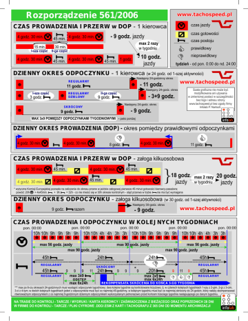 Rozporządzenie 561/2006 www.tachospeed.pl czas jazdy CZAS PROWADZENIA I PRZERW w DOP - 1 kierowca 4 godz. 30 min. 15 min. czas postoju max 2 razy w tygodniu 30 min. I-sza część II-ga część 45 min. 4 godz. 30 min. prawidłowy C nieprawidłowy C 4 godz. 30 min. czas gotowości - 9 godz. jazdy 45 min. 4 godz. 30 min. - 10 godz. jazdy 45 min. 1 godz. tydzień - od pon. 0:00 do nd. 24:00 DZIENNY OKRES ODPOCZYNKU - 1 kierowca (w 24 godz. od 1-szej aktywności) Następny 24-godzinny okres REGULARNY - 11 godz. 11 godz. www.tachospeed.pl Szata graficzna nie może być modyfikowana ani używana w zmienionej postaci w szczególności bez logo i adresu strony www.tachospeed.pl bez zgody firmy Infolab P. Narloch. Następny 24-godz. okres I-sza część II-ga część REGULARNY DZIELONY 3 godz. - 3+9 godz. 9 godz. Następny 24-godz. okres SKRÓCONY - 9 godz. 9 godz. MAX 3x9 POMIĘDZY ODPOCZYNKAMI TYGODNIOWYMI - patrz poniżej DZIENNY OKRES PROWADZENIA (DOP) - okres pomiędzy prawidłowymi odpoczynkami C 4 godz. 30 min. 4 godz. 30 min. C 4 godz. 30 min. 8 godz. 11 godz. CZAS PROWADZENIA I PRZERW w DOP - załoga kilkuosobowa 4 godz. 30 min. 45 min. 4 godz. 30 min. 45 min. 4 godz. 30 min. 4 godz. 30 min. 45 min. 4 godz. 30 min. 18 godz. jazdy max 2 razy w tygodniu 20 godz. jazdy * wytyczna Komisji Europejskiej pozwala na zaliczenie do okresu przerw w jeździe załogowej pierwsze 45 minut gotowości kierowcy-pasażera; powód: 20h + 4x45min. + 9h = 32h - co nie mieści się w 30h okresie kontrolnym - stąd przerwa w trybie nie ma być wymagana DZIENNY OKRES ODPOCZYNKU - załoga kilkuosobowa (w 30 godz. od 1-szej aktywności) Następny 30-godz. okres 9 godz. razem www.tachospeed.pl - 9 godz. CZAS PROWADZENIA I ODPOCZYNKU W KOLEJNYCH TYGODNIACH pon. 00:00 pon. 00:00 pon. 00:00 pon. 00:00 pon. 00:00 10h 10h 9h 9h 9h 9h 10h 10h 4h 4h 3h 3h 10h 10h 9h 9h 9h 9h 10h 10h 4h 4h 3h 3h 45h 24h REGULARNY REGULARNY SKRÓCONY 9 9 9 max 3x9 ODSTĘP max 6x24h 11 24h max 56 godz. jazdy max 90 godz. jazdy 24h 45h 9 9 9 20h REGULARNY 9 11 9 45h C C 45h max 90 godz. jazdy C max 56 godz. jazdy max 90 godz. jazdy max 3x9 max 6x24h REGULARNY C REKOMPENSATA SKRÓCENIA DO KOŃCA 3-GO TYGODNIA *** max po 6-ciu okresach 24-godzinnych musi wystąpić odpoczynek tygodniowy; dwa kolejne tygodnie są kontrolowane krzyżowo, tj. w czterech kolejnych tygodniach 1-szy z 2-gim, 2-gi z 3-cim, 3-ci z 4-tym; w dwóch kolejnych tygodniach jeden z odpoczynków musi być co najmniej 45-godzinny, w kolejnym tygodniu musi być co najmniej skrócony do 24 godzin, który należy skompensować równoważnym odpoczynkiem z co najmniej 9-godzinnym dziennym odpoczynkiem wykorzystanym jednorazowo przed końcem trzeciego tygodnia następującego po danym tygodniu. NA TRASIE DO KONTROLI - TARCZE / WYDRUKI / KARTA KIEROWCY / ZAŚWIADCZENIA Z BIEŻĄCEGO ORAZ POPRZEDNICH 28 DNI W FIRMIE DO KONTROLI - TARCZE / PLIKI CYFROWE .DDD/.ESM Z KART I TACHOGRAFU Z 365 DNI OD MOMENTU ARCHIWIZACJI