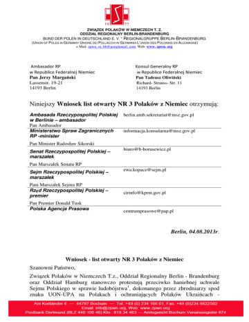 ZWIĄZEK POLAKÓW W NIEMCZECH T. Z. ODDZIAŁ REGIONALNY BERLIN-BRANDENBURG BUND DER POLEN IN DEUTSCHLAND E. V. * REGIONALGRUPPE BERLIN-BRANDENBURG (UNION OF POLES IN GERMANY UNIONE DEI POLLACCHI IN GERMANIA L‘UNION DES POLONAIS EN ALLEMAGNE) e Mail: zpwn. or. bb@googlemail. com Web: www. zpwn. org Ambasador RP w Republice Federalnej Niemiec Pan Jerzy Margański Lassenstr. 19-21 14193 Berlin Konsul Generalny RP w Republice Federalnej Niemiec Pan Tadeusz Oliwiński Richard- Strauss- Str. 11 14193 Berlin Niniejszy Wniosek list otwarty NR 3 Polaków z Niemiec otrzymują: Ambasada Rzeczypospolitej Polskiej w Berlinie – ambasador Pan Ambasador Ministerstwo Spraw Zagranicznych RP -minister [email protected] [email protected] Pan Minister Radosław Sikorski Senat Rzeczypospolitej Polskiej – marszałek [email protected] Pan Marszałek Senatu RP Sejm Rzeczypospolitej Polskiej – marszałek Pani Marszałek Sejmu RP Rząd Rzeczypospolitej Polskiej – premier Pan Premier Donald Tusk Polska Agencja Prasowa [email protected] [email protected] [email protected] Berlin, 04.08.2013r. Wniosek - list otwarty NR 3 Polaków z Niemiec Szanowni Państwo, Związek Polaków w Niemczech T.z., Oddział Regionalny Berlin - Brandenburg oraz Oddział Hamburg stanowczo protestują przeciwko haniebnej uchwale Sejmu Polskiego w sprawie ludobójstwa1, dokonanego przez zbrodniarzy spod znaku UON-UPA na Polakach i ochraniających Polaków Ukraińcach - obywateli II RP. Zdominowany przez posłów PO, Sejm przyjął kuriozalną, pogardliwą uchwałę o cyt: „czystce etnicznej o znamionach ludobójstwa” zamiast barbarzyńskim ludobójstwie niewinnych i bezbronnych Polaków dokonanym przez zwyrodnialców z UON, UPA. Warto podkreślić, że Polacy, Żydzi, Ormianie, Czesi od wieków byli mieszkańcami Wołynia i Małopolski Wschodniej. Głosowanie przez parlamentarzystów w Polsce nad taką uchwałą, która nie mówi pełnej prawdy o ludobójstwie na Narodzie Polskim i nie określa żadnych działań w tej niezwykle ważnej sprawie historycznej jest po prostu niczym innym jak jawną zdradą Narodu Polskiego. Ta uchwała polskiego Sejmu wpisuje się w ciąg systematycznego naigrawania się z własnego Narodu, przypodobania się potomkom morderców, wręcz dalszego zachęcania do kpin i poniżania Polski i Polaków na arenie międzynarodowej. Obecne zakłamywanie historii własnego Narodu przez różne osoby i niestety także organy Państwa Polskiego stało się notorycznym wyznacznikiem postępu wręcz paradygmatem. Kluczową rolę w relatywizowaniu upamiętnienia ofiar zbrodni dokonanych przez nacjonalistów ukraińskich na Polakach odgrywają liberalni posłowie polskiego parlamentu, którzy przy tym i przede wszystkim kierują się interesami, gospodarczymi, dyktowanymi przez zdominowaną przez Niemcy Unię Europejską. Cały program tzw. integracji Ukrainy z Unią Europejską podlega ścisłej reżyserii Unii Europejskiej (Niemiec) i co za tym idzie zastosowania takich kryteriów, które zupełnie pomijają aspekt historyczny, gdyż Niemcy są dzisiaj państwem, które, zakłamując historię, systematycznie buduje swoją dominację polityczno-gospodarczą w Europie i w świecie. Ukraina po 1991 roku to państwo, którego teren odgrywa dla Unii Europejskiej – Niemiec bardzo ważną rolę jako: Ukraina – rynek zbytu, Ukraina – „spichlerz Rosji” zamieniany na spichlerz Unii Europejskiej, Ukraina - zagłębie surowcowe (Donbas) wraz z dostępem do Morza Czarnego, Ukraina niewyczerpany rezerwuar najtańszej siły roboczej na najbliższe dziesięciolecia dla koncernów niemieckich i starzejących się (wymierających) społeczeństw innych państw „Unii Europejskiej” oraz, co bardzo ważne, podobnie jak Polski teren - teren Ukrainy i Białorusi jako droga transportowa (przede wszystkim pociągów towarowych z kontenerami), którą pokonują w 15 dni, czyli w rekordowo krótkim czasie; ze środkowych Chin i z Rosji, poprzez wschodnią, środkową i zachodnią część kontynentu europejskiego, do portów niemieckich (Hamburg) i holenderskich (Rotterdam) oraz innych. Trasę morską statki, z kontenerami pełnymi towarów firm niemieckich z portów Chin do Hamburga, przepływają o ponad 50% dłuższym czasie niż jedzie pociąg 2. Obserwując obecnie rządzących odnosi się wrażenie, że odrzucając w przyjętej przez Sejm RP uchwale pojęcie barbarzyńskie ludobójstwo świadomie dążą do ciągłego poniżania Polaków i celowego przy tym demontowania i tak już słabych struktur Państwa Polskiego. Stwierdzamy, że jawne i cyniczne naigrawanie się, wprost szydzenie z Narodu Polskiego przez wielu obecnych przedstawicieli rządu i niektórych parlamentarzystów w Sejmie i Parlamencie UE, z Narodu, tak bardzo prześladowanego w czasie II wojny światowej przez oprawców – Niemców, sowietów oraz barbarzyńców z UON-UPA, jest, jak dotąd, niespotykane w takiej skali w historii Polski. Wnosimy o zmianę uchwały Sejmu i w tym przyznanie się do winy przez posłów, właśnie tych świadomie działających na szkodę własnego narodu, w przeciwnym razie o obłożenie tych posłów wieczną infamią oraz wytoczenie procesów karnych przywódcom – wnioskodawcom bezprecedensowej i urągającej zdrowemu rozsądkowi uchwały. Niniejszy Wniosek – list otwarty Nr 3 Polaków z Niemiec podpisują Polacy, członkowie Związku Polaków w Niemczech spod znaku Rodła, spadkobiercy przedwojennych Polaków od pokoleń zamieszkałych w Niemczech, członków uznanej mniejszości polskiej w Niemczech – także obywateli Niemiec. Z poważaniem Wiceprezes ZPwN T.z. Oddział Hamburg Wiceprezes ZPwN T.z. Oddział BerlinBrandenburg Anna Halves Józef Galiński Uzasadnienie Wniosku - listu otwartego NR 3 Polaków z Niemiec Dokonywane na bezbronnej polskiej ludności oraz chroniącej Ją ludności ukraińskiej bestialskie mordy przez oprawców z UON i UPA były inspirowane przez Niemców i sowietów. Zbrodnicza napaść