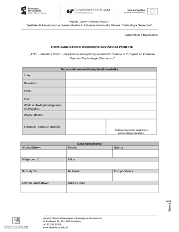 Projekt „CHIP – Chemia i Praca – Zwiększenie kompetencji w ramach studiów I i II stopnia na kierunku Chemia i Technologia Chemiczna” Załącznik nr 2 Regulaminu FORMULARZ DANYCH OSOBOWYCH UCZESTNIKA PROJEKTU „CHiP – Chemia i Praca – Zwiększenie kompetencji w ramach studiów I i II stopnia na kierunku Chemia i Technologia Chemiczna” Dane podstawowe Kandydata/Uczestnika Imię Nazwisko PESEL Płeć Wiek w chwili przystąpienia do Projektu Wykształcenie Kierunek i semestr studiów Podpis pracownika dziekanatu potwierdzającego dane: Dane kontaktowe Powiat Miejscowość Ulica Nr budynku Nr lokalu Telefon kontaktowy Adres e-mail Gmina Kod pocztowy Strona 1 Województwo Instytut Chemii Uniwersytetu Śląskiego w Katowicach, ul. Bankowa 14, 40 – 007 Katowice, tel. 32 359 15 82, www.chemia.us.edu.pl Projekt „CHIP – Chemia i Praca – Zwiększenie kompetencji w ramach studiów I i II stopnia na kierunku Chemia i Technologia Chemiczna” Status Kandydata/Uczestnika na rynku pracy □ osoba bezrobotna zarejestrowana w ewidencji Status osoby na rynku pracy w chwili urzędów pracy przystąpienia do projektu □ □ □ osoba bezrobotna niezarejestrowana w ewidencji urzędów pracy osoba bierna zawodowo osoba pracująca Wykonywany zawód (jeśli dotyczy) Zatrudniony w (jeśli dotyczy) Status uczestnika w chwili przystąpienia do projektu – informacje dodatkowe Osoba należąca do mniejszości narodowej lub etnicznej, migrant, osoba obcego pochodzenia Osoba bezdomna lub dotknięta wykluczeniem z dostępu do mieszkań Osoba z niepełnosprawnościami Osoba przebywająca w gospodarstwie domowym bez osób pracujących W tym: w gospodarstwie domowym z dziećmi pozostającymi na utrzymaniu Osoba żyjąca w gospodarstwie składającym się z jednej osoby dorosłej i dzieci pozostających na utrzymaniu Osoba w innej niekorzystnej sytuacji społecznej (innej niż wymienione powyżej) Ponadto oświadczam, że zapoznałam/em się z Regulaminem rekrutacji i uczestnictwa w projekcie pt.: „CHiP – Chemia i Praca – Zwiększenie kompetencji w ramach studiów I i II stopnia na kierunku Chemia i Technologia Chemiczna” i zobowiązuję się do przestrzegania jego zapisów. …..……………………………………… CZYTELNY PODPIS UCZESTNIKA PROJEKTU* * W przypadku deklaracji uczestnictwa osoby małoletniej oświadczenie powinno zostać podpisane przez jej prawnego opiekuna. Instytut Chemii Uniwersytetu Śląskiego w Katowicach, ul. Bankowa 14, 40 – 007 Katowice, tel. 32 359 15 82, www.chemia.us.edu.pl Strona 2 MIEJSCOWOŚĆ I DATA ……………………………………………