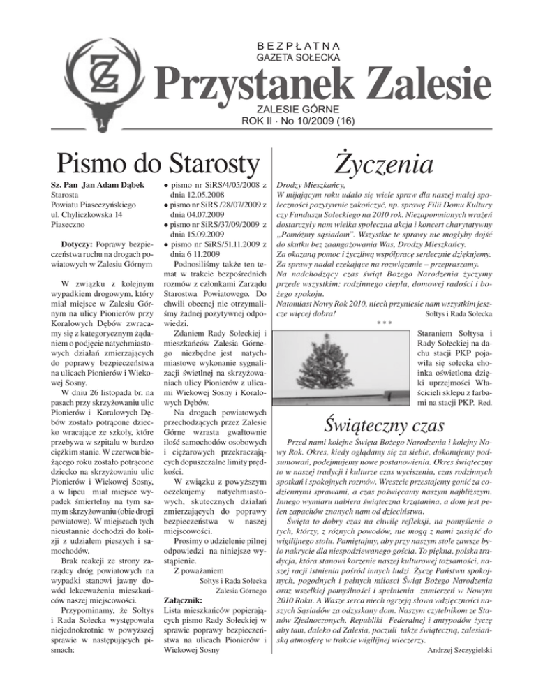 B E Z P Ł AT N A GAZETA SOŁECKA Przystanek Zalesie ZALESIE GÓRNE ROK II . No 10/2009 (16) Pismo do Starosty Sz. Pan Jan Adam Dąbek Starosta Powiatu Piaseczyńskiego ul. Chyliczkowska 14 Piaseczno Dotyczy: Poprawy bezpieczeństwa ruchu na drogach powiatowych w Zalesiu Górnym W związku z kolejnym wypadkiem drogowym, który miał miejsce w Zalesiu Górnym na ulicy Pionierów przy Koralowych Dębów zwracamy się z kategorycznym żądaniem o podjęcie natychmiastowych działań zmierzających do poprawy bezpieczeństwa na ulicach Pionierów i Wiekowej Sosny. W dniu 26 listopada br. na pasach przy skrzyżowaniu ulic Pionierów i Koralowych Dębów zostało potrącone dziecko wracające ze szkoły, które przebywa w szpitalu w bardzo ciężkim stanie. W czerwcu bieżącego roku zostało potrącone dziecko na skrzyżowaniu ulic Pionierów i Wiekowej Sosny, a w lipcu miał miejsce wypadek śmiertelny na tym samym skrzyżowaniu (obie drogi powiatowe). W miejscach tych nieustannie dochodzi do kolizji z udziałem pieszych i samochodów. Brak reakcji ze strony zarządcy dróg powiatowych na wypadki stanowi jawny dowód lekceważenia mieszkańców naszej miejscowości. Przypominamy, że Sołtys i Rada Sołecka występowała niejednokrotnie w powyższej sprawie w następujących pismach: pismo nr SiRS/4/05/2008 z dnia 12.05.2008 l pismo nr SiRS /28/07/2009 z dnia 04.07.2009 l pismo nr SiRS/37/09/2009 z dnia 15.09.2009 l pismo nr SiRS/51.11.2009 z dnia 6 11.2009 Podnosiliśmy także ten temat w trakcie bezpośrednich rozmów z członkami Zarządu Starostwa Powiatowego. Do chwili obecnej nie otrzymaliśmy żadnej pozytywnej odpowiedzi. Zdaniem Rady Sołeckiej i mieszkańców Zalesia Górnego niezbędne jest natychmiastowe wykonanie sygnalizacji świetlnej na skrzyżowaniach ulicy Pionierów z ulicami Wiekowej Sosny i Koralowych Dębów. Na drogach powiatowych przechodzących przez Zalesie Górne wzrasta gwałtownie ilość samochodów osobowych i ciężarowych przekraczających dopuszczalne limity prędkości. W związku z powyższym oczekujemy natychmiastowych, skutecznych działań zmierzających do poprawy bezpieczeństwa w naszej miejscowości. Prosimy o udzielenie pilnej odpowiedzi na niniejsze wystąpienie. Z poważaniem l Sołtys i Rada Sołecka Zalesia Górnego Załącznik: Lista mieszkańców popierających pismo Rady Sołeckiej w sprawie poprawy bezpieczeństwa na ulicach Pionierów i Wiekowej Sosny Życzenia Drodzy Mieszkańcy, W mijającym roku udało się wiele spraw dla naszej małej społeczności pozytywnie zakończyć, np. sprawę Filii Domu Kultury czy Funduszu Sołeckiego na 2010 rok. Niezapomnianych wrażeń dostarczyły nam wielka społeczna akcja i koncert charytatywny „Pomóżmy sąsiadom”. Wszystkie te sprawy nie mogłyby dojść do skutku bez zaangażowania Was, Drodzy Mieszkańcy. Za okazaną pomoc i życzliwą współpracę serdecznie dziękujemy. Za sprawy nadal czekające na rozwiązanie – przepraszamy. Na nadchodzący czas świąt Bożego Narodzenia życzymy przede wszystkim: rodzinnego ciepła, domowej radości i bożego spokoju. Natomiast Nowy Rok 2010, niech przyniesie nam wszystkim jeszcze więcej dobra! Sołtys i Rada Sołecka *** Staraniem Sołtysa i Rady Sołeckiej na dachu stacji PKP pojawiła się sołecka choinka oświetlona dzięki uprzejmości Właścicieli sklepu z farbami na stacji PKP. Red. Świąteczny czas Przed nami kolejne Święta Bożego Narodzenia i kolejny Nowy Rok. Okres, kiedy oglądamy się za siebie, dokonujemy podsumowań, podejmujemy nowe postanowienia. Okres świąteczny to w naszej tradycji i kulturze czas wyciszenia, czas rodzinnych spotkań i spokojnych rozmów. Wreszcie przestajemy gonić za codziennymi sprawami, a czas poświęcamy naszym najbliższym. Innego wymiaru nabiera świąteczna krzątanina, a dom jest pełen zapachów znanych nam od dzieciństwa. Święta to dobry czas na chwilę refleksji, na pomyślenie o tych, którzy, z różnych powodów, nie mogą z nami zasiąść do wigilijnego stołu. Pamiętajmy, aby przy naszym stole zawsze było nakrycie dla niespodziewanego gościa. To piękna, polska tradycja, która stanowi korzenie naszej kulturowej tożsamości, naszej racji istnienia pośród innych ludzi. Życzę Państwu spokojnych, pogodnych i pełnych miłosci Świąt Bożego Narodzenia oraz wszelkiej pomyślności i spełnienia zamierzeń w Nowym 2010 Roku. A Wasze serca niech ogrzeją słowa wdzięczności naszych Sąsiadów za odzyskany dom. Naszym czytelnikom ze Stanów Zjednoczonych, Republiki Federalnej i antypodów życzę aby tam, daleko od Zalesia, poczuli także świąteczną, zalesiańską atmosferę w trakcie wigilijnej wieczerzy. Andrzej Szczygielski Szanowni Mieszkańcy! Z okazji zbliżających się Świąt Bożego Narodzenia chciałbym życzyć wszystkim Państwu radosnego przeżycia tych wyjatkowych dni w atmosferze miłości i wzajemnego szacunku w gronie najbliższych a osobom samotnym, by spotkały się z ciepłem i życzliwością ze strony sąsiadów.W nadchodzącym Nowym Roku życzę wszystkim optymizmu i wiary, że dziś występujące problemy, które ma każdy z nas, staną się przeszłością a przyszłość będzie godna naszych oczekiwań i pragnień.Z wyrazami szacunku Wojciech Kaczorowski – radny Remonty dobiegają końca ! Powoli dobiegają końca zaplanowane na rok biężący remonty obu lokali świetlicowych. W budynku przu ul. Wiekowej Sosny udało się, dzięki pomocy dyrektora Ośrodka Kultury w Piasecznie, pani Ewy Dudek, przeprowadzić naprawę dachu z malowaniem, naprawę obróbek blacharskich, opaski wokół budynku oraz położyć nowy chodnik do świetlicy. Na ul. Jelonka prace zewnętrzne dobiegają końca, wewnątrz trwa lakierowanie podłóg. Planujemy, że do Świąt ekipa remontowa zakończy sprzątanie i przekaże budynek do użytkowania. Red. Pogodnych, pełnych radości,miłości i rodzinnego ciepła Świąt Bożego Narodzenia oraz samych pomyślnych dni w Nowym
