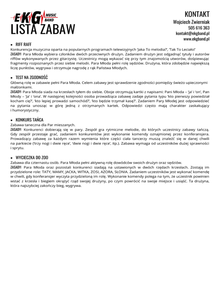 KONTAKT LISTA ZABAW RIFF RAFF Wojciech Zwierniak 505 616 363 [email protected] www.ekgband.pl Konkurencja muzyczna oparta na popularnych programach telewizyjnych ‘Jaka To melodia?’, ‘Tak To Leciało!’ ZASADY: Para Młoda wybiera członków dwóch przeciwnych drużyn. Zadaniem drużyn jest odgadnąć tytuły i autorów riffów wykonywanych przez gitarzystę. Uczestnicy mogą wykazać się przy tym znajomością utworów, dośpiewując fragmenty rozpoznanych przez siebie melodii. Para Młoda pełni rolę sędziów. Drużyna, która zdobędzie największą liczę punktów, wygrywa i otrzymuje nagrodę z rąk Państwa Młodych. TEST NA ZGODNOŚĆ Główną rolę w zabawie pełni Para Młoda. Celem zabawy jest sprawdzenie zgodności pomiędzy świeżo upieczonymi małżonkami. ZASADY: Para Młoda siada na krzesłach tyłem do siebie. Oboje otrzymują kartki z napisami: Pani Młoda – ‘ja’ i ‘on’, Pan Młody – ‘Ja’ i ‘ona’. W następnej kolejności osoba prowadząca zabawę zadaje pytania typu ‘kto pierwszy powiedział kocham cię?’, ‘kto lepiej prowadzi samochód?’, ‘kto będzie trzymał kasę?’. Zadaniem Pary Młodej jest odpowiedzieć na pytania unosząc w górę jedną z otrzymanych kartek. Odpowiedzi często mają charakter zaskakujący i humorystyczny. KONKURS TAŃCA Zabawa taneczna dla Par mieszanych. ZASADY: Konkurenci dobierają się w pary. Zespół gra rytmiczne melodie, do których uczestnicy zabawy tańczą. Gdy zespół przestaje grać, zadaniem konkurentów jest wykonanie komendy oznajmionej przez konferansjera. Prowadzący zabawę za każdym razem wymienia które części ciała tancerzy muszą znaleźć się w danej chwili na parkiecie (‘trzy nogi i dwie ręce’, ‘dwie nogi i dwie ręce’, itp.). Zabawa wymaga od uczestników dużej sprawności i sprytu. WYCIECZKA DO ZOO Zabawa dla czternastu osób. Para Młoda pełni aktywną rolę dowódców swoich drużyn oraz sędziów. ZASADY: Para Młoda oraz pozostali konkurenci siadają na ustawionych w dwóch rzędach krzesłach. Zostają im przydzielone role: TATY, MAMY, JACKA, WITKA, ZOSI, AZORA, SŁONIA. Zadaniem uczestników jest wykonać komendę w chwili, gdy konferansjer wyczyta przydzieloną im rolę. Wykonanie komendy polega na tym, że uczestnik powinien wstać z krzesła i biegiem okrążyć rząd swojej drużyny, po czym powrócić na swoje miejsce i usiąść. Ta drużyna, która najszybciej zakończy bieg, wygrywa.