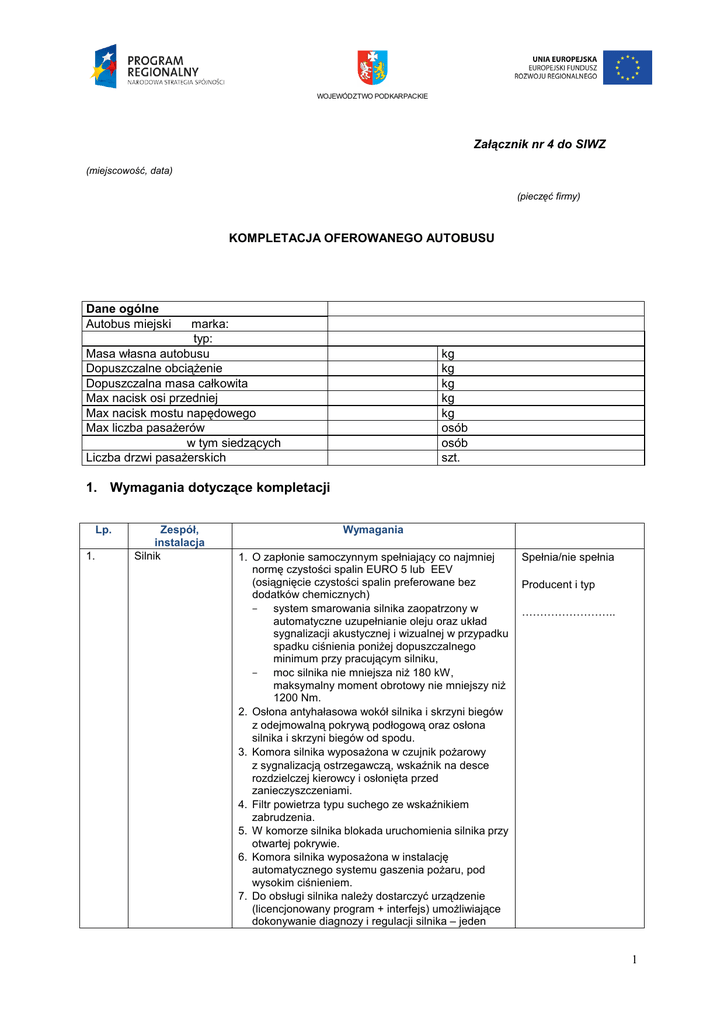 WOJEWÓDZTWO PODKARPACKIE Załącznik nr 4 do SIWZ (miejscowość, data) (pieczęć firmy) KOMPLETACJA OFEROWANEGO AUTOBUSU Dane ogólne Autobus miejski marka: typ: Masa własna autobusu Dopuszczalne obciążenie Dopuszczalna masa całkowita Max nacisk osi przedniej Max nacisk mostu napędowego Max liczba pasażerów w tym siedzących Liczba drzwi pasażerskich kg kg kg kg kg osób osób szt. 1. Wymagania dotyczące kompletacji Lp. 1. Zespół, instalacja Silnik Wymagania 1. O zapłonie samoczynnym spełniający co najmniej normę czystości spalin EURO 5 lub EEV (osiągnięcie czystości spalin preferowane bez dodatków chemicznych) - system smarowania silnika zaopatrzony w automatyczne uzupełnianie oleju oraz układ sygnalizacji akustycznej i wizualnej w przypadku spadku ciśnienia poniżej dopuszczalnego minimum przy pracującym silniku, - moc silnika nie mniejsza niż 180 kW, maksymalny moment obrotowy nie mniejszy niż 1200 Nm. 2. Osłona antyhałasowa wokół silnika i skrzyni biegów z odejmowalną pokrywą podłogową oraz osłona silnika i skrzyni biegów od spodu. 3. Komora silnika wyposażona w czujnik pożarowy z sygnalizacją ostrzegawczą, wskaźnik na desce rozdzielczej kierowcy i osłonięta przed zanieczyszczeniami. 4. Filtr powietrza typu suchego ze wskaźnikiem zabrudzenia. 5. W komorze silnika blokada uruchomienia silnika przy otwartej pokrywie. 6. Komora silnika wyposażona w instalację automatycznego systemu gaszenia pożaru, pod wysokim ciśnieniem. 7. Do obsługi silnika należy dostarczyć urządzenie (licencjonowany program + interfejs) umożliwiające dokonywanie diagnozy i regulacji silnika – jeden Spełnia/nie spełnia Producent i typ …………………….. 1 WOJEWÓDZTWO PODKARPACKIE 2. Układ silnika zasilania 3. Układ chłodzenia silnika i ogrzewanie wnętrza autobusu 4. Skrzynia biegów zestaw na osiem autobusów. 8. Od Wykonawcy autobusów, w których czystość spalin określona normą Euro 5 lub EEV, jest osiągana poprzez system selektywnej redukcji katalitycznej (SCR), Zamawiający wymaga: dostarczenia w ramach zamówienia i instalację, stacji napełniania AdBlue w miejscu wskazanym przez Zamawiającego na zajezdni Zakładu Miejskiej Komunikacji Samochodowej w Stalowej Woli przy ul. Komunalnej 3 oraz bezpłatnego przeszkolenia trzech pracowników operatora z zakresu obsługi stacji; zapewnienia serwisu technicznego stacji napełniania AdBlue; stacja napełniania AdBlue winna być przystosowana do pracy na placu parkingowym zajezdni, na otwartej przestrzeni tj. na działanie ekstremalnych temperatur i bezpośredniego działania słońca; pojemność stacji napełniania AdBlue nie mniejsza niż 2900 litrów. 1. Wyposażony w podgrzewane filtry paliwa (dokładnego oczyszczania). 2. Wyposażony w podgrzewany wstępny filtr odwadniający o dokładności filtracji 30 µm i przepustowości co najmniej 10 l/min (zalecany Separ SWK 2000/10/H). 3. Zbiornik paliwa wykonany z materiału odpornego na korozję o pojemności min. 250l z zamknięciem błyskawicznym typu „Bartelt” zamykany na klucz. 1. Rury układu chłodzenia i ogrzewania wykonane z materiałów odpornych na korozję (miedź, mosiądz lub tworzywo) i termo izolowane. 2. Wyposażony w złączki z gumy silikonowej zaciskane opaskami ślimakowymi lub innymi gwarantującymi szczelność układu przez cały okres eksploatacji pojazdu. 3. Wyposażony w układ sygnalizacji akustycznej i wizualnej - wskaźnik na desce rozdzielczej – w przypadku utraty cieczy chłodzącej. 4. Konstrukcja chłodnicy powinna minimalizować zabrudzenie jej rdzenia np. przed pyłkami topoli. 5. Ogrzewanie wnętrza autobusu wykorzystujące ciepło układu chłodzenia silnika i automatycznej skrzyni biegów, wspomagane agregatem grzewczym działającym po włączeniu w automatyce w funkcji temperatury czynnika grzewczego z możliwością stopniowej regulacji temperatury wnętrza przez kierowcę. 6. Konstrukcja nagrzewnic umożliwiająca łatwe czyszczenie wymienników ciepła oraz ich „odcięcie” od układu chłodzenia silnika, silniki elektryczne dmuchaw zabezpieczone przed wilgocią i kurzem nanoszonym przez przepływające powietrze. 7. Układ chłodzenia napełniony płynem niskokrzepnącym na bazie glikolu etylenowego/bez azotynów/ zgodnie z normą PN-C-40007:2000. 1. Automatyczna czterobiegowa (firmy Voith, Diwa 5, typ D 854.5 lub równorzędna), z systemem rejestracji danych eksploatacyjnych drugiej generacji, ze sterownikiem E 300 lub równorzędnym. 2. Przystosowana do pracy w ruchu miejskim, jazda typu STOP-START. Spełnia/nie spełnia Spełnia/nie spełnia Spełnia/nie spełnia Producent i typ …………………….. 2 WOJEWÓDZTWO PODKARPACKIE 5. Oś przednia typu STOP-START. 3. Odznaczająca się podatnością obsługową i serwisową. 4. Będąca w produkcji seryjnej. 5. Wyposażona w układ obniżający zużycie paliwa w warunkach drogowych i topografii miasta będącego siedzibą Zamawiającego/operatora. 6. Wyposażona w zintegrowany z przekładnią hydrodynamiczny zwalniacz hydrauliczny (retarder), sterowany pedałem hamulca. 7. Do obsługi skrzyni biegów należy dostarczyć urządzenie (program licencjonowany + interfejs) umożliwiające dokonywanie rejestracji i odczytywania parametrów eksploatacyjnych. System diagnozowania ALADIN lub równorzędny. Zawieszenie zależne, oparte o belkę sztywną lub zawieszenie niezależne w oparciu o wahacze. Spełnia/nie spełnia Producent i typ …………………….. 6. Most napędowy 1. O przełożeniu minimalizującym zużycie paliwa i hałas. 2. Sugerowany most portalowy. Spełnia/nie spełnia Producent i typ …………………….. 7. Układ kierowniczy 1. Pełna regulacja położenia koła kierownicy (regulacja wysokości i pochylenia z blokadą w wybranym położeniu). 2. Przyłącze diagnostyczne do badania wspomagania układu kierowniczego. Spełnia/nie spełnia Producent przekładni i typ …………………….. 8. Instalacja pneu