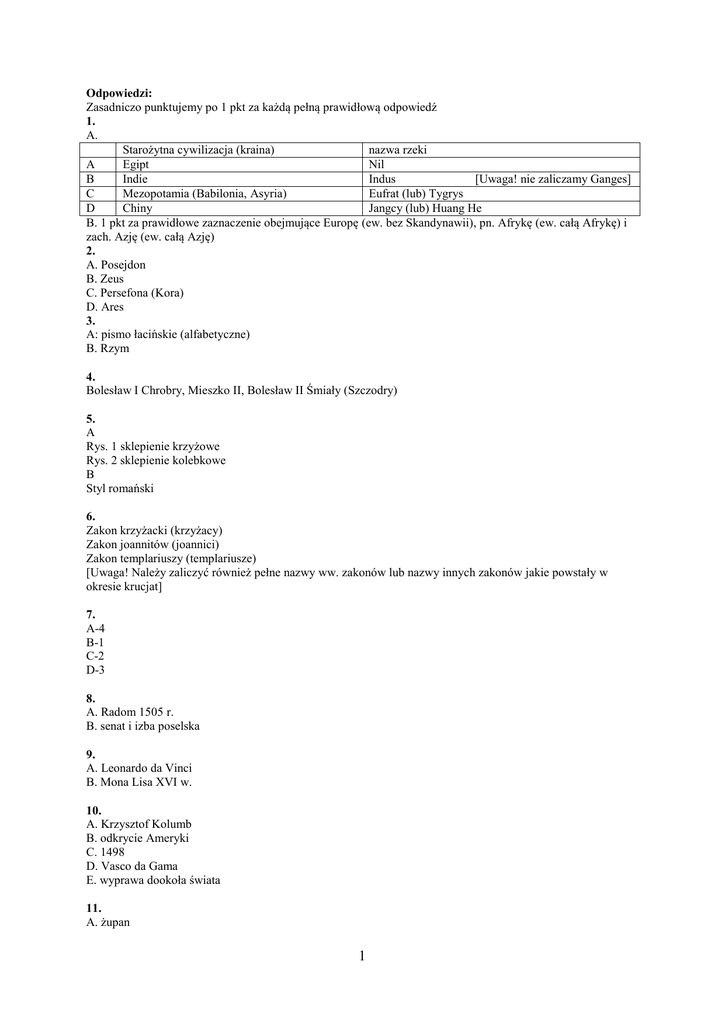 Odpowiedzi: Zasadniczo punktujemy po 1 pkt za każdą pełną prawidłową odpowiedź 1. A. Starożytna cywilizacja (kraina) nazwa rzeki A Egipt Nil B Indie Indus [Uwaga! nie zaliczamy Ganges] C Mezopotamia (Babilonia, Asyria) Eufrat (lub) Tygrys D Chiny Jangcy (lub) Huang He B. 1 pkt za prawidłowe zaznaczenie obejmujące Europę (ew. bez Skandynawii), pn. Afrykę (ew. całą Afrykę) i zach. Azję (ew. całą Azję) 2. A. Posejdon B. Zeus C. Persefona (Kora) D. Ares 3. A: pismo łacińskie (alfabetyczne) B. Rzym 4. Bolesław I Chrobry, Mieszko II, Bolesław II Śmiały (Szczodry) 5. A Rys. 1 sklepienie krzyżowe Rys. 2 sklepienie kolebkowe B Styl romański 6. Zakon krzyżacki (krzyżacy) Zakon joannitów (joannici) Zakon templariuszy (templariusze) [Uwaga! Należy zaliczyć również pełne nazwy ww. zakonów lub nazwy innych zakonów jakie powstały w okresie krucjat] 7. A-4 B-1 C-2 D-3 8. A. Radom 1505 r. B. senat i izba poselska 9. A. Leonardo da Vinci B. Mona Lisa XVI w. 10. A. Krzysztof Kolumb B. odkrycie Ameryki C. 1498 D. Vasco da Gama E. wyprawa dookoła świata 11. A. żupan 1 B. kontusz C. karabela D. baczmagi 12. XVII, podatków (ceł, opłat), bostońskie picie herbaty, Jerzy (George) Waszyngton 13. A. Stanisław August Poniatowski B. wojna polsko-rosyjska (w obronie Konstytucji 3 maja) z 1792 r. [ew. po bitwie pod Zieleńcami] 14. Francja – Napoleon I Bonaparte Rosja – Aleksander I Romanow Austria – Franciszek I Habsburg [Uwaga! Zaliczamy nie tylko imię, wymagane jest podanie numeracji władcy lub nazwiska rodowego] 2