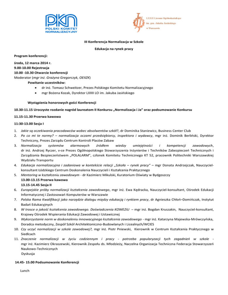 III Konferencja Normalizacja w Szkole Edukacja na rynek pracy Program konferencji: środa, 12 marca 2014 r. 9.00-10.00 Rejestracja 10.00 -10.30 Otwarcie konferencji Moderator (mgr inż. Grażyna Gregorczyk, OEIIZK) Powitanie uczestników: dr inż. Tomasz Schweitzer, Prezes Polskiego Komitetu Normalizacyjnego mgr Bożena Kozak, Dyrektor LXXII LO im. Jakuba Jasińskiego Wystąpienia honorowych gości Konferencji 10.30-11.15 Uroczyste rozdanie nagród laureatom II Konkursu „Normalizacja i Ja” oraz podsumowanie Konkursu 11.15-11.30 Przerwa kawowa 11:30-13.00 Sesja I 1. 2. Jakie są oczekiwania pracodawców wobec absolwentów szkół?, dr Dominika Staniewicz, Business Center Club Po co mi te normy? – normalizacja oczami przedsiębiorcy, inspektora i wydawcy, mgr inż. Dominik Berliński, Dyrektor Techniczny, Prezes Zarządu Centrum Kontroli Placów Zabaw 3. Normalizacja systemów alarmowych źródłem wiedzy umiejętności i kompetencji zawodowych, dr inż. Andrzej Ryczer, v-ce Prezes Ogólnopolskiego Stowarzyszenia Inżynierów i Techników Zabezpieczeń Technicznych i Zarządzania Bezpieczeństwem „POLALARM”, członek Komitetu Technicznego KT 52, pracownik Politechniki Warszawskiej Wydziału Transportu 4. Edukacja normalizacyjna i zadaniowa w kontekście relacji „Szkoła – rynek pracy” – mgr Donata Andrzejczak, Nauczycielkonsultant Łódzkiego Centrum Doskonalenia Nauczycieli i Kształcenia Praktycznego 5. Mentoring w kształceniu zawodowym - dr Kazimierz Mikulski, Kuratorium Oświaty w Bydgoszczy 13.00-13.15 Przerwa kawowa 13.15-14.45 Sesja II 6. Europejskie próby normalizacji kształcenia zawodowego, mgr inż. Ewa Kędracka, Nauczyciel-konsultant, Ośrodek Edukacji Informatycznej i Zastosowań Komputerów w Warszawie 7. Polska Rama Kwalifikacji jako narzędzie dialogu między edukacją i rynkiem pracy, dr Agnieszka Chłoń–Domińczak, Instytut Badań Edukacyjnych 8. W trosce o jakość kształcenia zawodowego. Doświadczenia KOWEZiU – mgr inż. Bogdan Kruszakin, Nauczyciel-konsultant, Krajowy Ośrodek Wspierania Edukacji Zawodowej i Ustawicznej 9. Wykorzystanie norm w doskonaleniu innowacyjnego kształcenia zawodowego - mgr inż. Katarzyna Majewska-Mrówczyńska, Doradca metodyczny, Zespół Szkół Architektoniczno-Budowlanych i Licealnych/WCIES 10. Czy uczyć normalizacji w szkole zawodowej?, mgr inż. Piotr Pniewski, Kierownik w Centrum Kształcenia Praktycznego w Siedlcach 11. Znaczenie normalizacji w życiu codziennym i pracy - potrzeba popularyzacji tych zagadnień w szkole mgr inż. Kazimierz Okraszewski, Kierownik Zespołu ds. Młodzieży, Naczelna Organizacja Techniczna Federacja Stowarzyszeń Naukowo-Technicznych Dyskusja 14.45- 15.00 Podsumowanie Konferencji Lunch