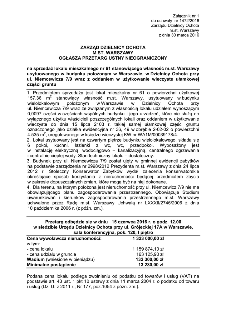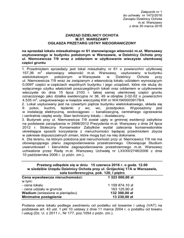 Załącznik nr 1 do uchwały nr 1472/2016 Zarządu Dzielnicy Ochota m.st. Warszawy z dnia 30 marca 2016 ZARZĄD DZIELNICY OCHOTA M.ST. WARSZAWY OGŁASZA PRZETARG USTNY NIEOGRANICZONY na sprzedaż lokalu mieszkalnego nr 61 stanowiącego własność m.st. Warszawy usytuowanego w budynku położonym w Warszawie, w Dzielnicy Ochota przy ul. Niemcewicza 7/9 wraz z oddaniem w użytkowanie wieczyste ułamkowej części gruntu 1. Przedmiotem sprzedaży jest lokal mieszkalny nr 61 o powierzchni użytkowej 157,36 m2 stanowiący własność m.st. Warszawy, usytuowany w budynku wielolokalowym położonym w Warszawie w Dzielnicy Ochota przy ul. Niemcewicza 7/9 wraz ze związanym z własnością lokalu udziałem wynoszącym 0,0097 części w częściach wspólnych budynku i jego urządzeń, które nie służą do wyłącznego użytku właścicieli poszczególnych lokali oraz oddaniem w użytkowanie wieczyste do dnia 15 lipca 2103 r. takiej samej ułamkowej części gruntu oznaczonego jako działka ewidencyjna nr 36, 49 w obrębie 2-02-02 o powierzchni 4.535 m2, uregulowanego w księdze wieczystej KW nr WA1M/00039178/4. 2. Lokal usytuowany jest na czwartym piętrze budynku wielolokalowego, składa się 6 pokoi, kuchni, łazienki z wc, wc, przedpokoi. Wyposażony jest w instalację elektryczną, wodociągowo – kanalizacyjną, centralnego ogrzewania i centralnie ciepłej wody. Stan techniczny lokalu – dostateczny. 3. Budynek przy ul. Niemcewicza 7/9 został ujęty w gminnej ewidencji zabytków na podstawie zarządzenia nr 2998/2012 Prezydenta m.st. Warszawy z dnia 24 lipca 2012 r. Stołeczny Konserwator Zabytków wydał zalecenia konserwatorskie określające sposób korzystania z nieruchomości będącej przedmiotem zbycia w zakresie dopuszczalnych zmian, które mogą być na niej dokonane. 4. Dla terenu, na którym położona jest nieruchomość przy ul. Niemcewicz 7/9 nie ma obowiązującego planu zagospodarowania przestrzennego. Obowiązuje Studium uwarunkowań i kierunków zagospodarowania przestrzennego m.st. Warszawy uchwalone przez Radę m.st. Warszawy Uchwałą nr LXXXII/2746/2006 z dnia 10 października 2006 r. (z późn. zm.). Przetarg odbędzie się w dniu 15 czerwca 2016 r. o godz. 12.00 w siedzibie Urzędu Dzielnicy Ochota przy ul. Grójeckiej 17A w Warszawie, sala konferencyjna, pok. 120, I piętro Cena wywoławcza nieruchomości: 1 323 000,00 zł w tym: - cena lokalu 1 159 874,10 zł - cena udziału w gruncie 163 125,90 zł Wadium (wniesione w pieniądzu) 132 300,00 zł Minimalne postąpienie 13 230,00 zł Podana cena lokalu podlega zwolnieniu od podatku od towarów i usług (VAT) na podstawie art. 43 ust. 1 pkt 10 ustawy z dnia 11 marca 2004 r. o podatku od towaru i usług (Dz. U. z 2011 r., Nr 177, poz.1054 z późn. zm.). Cena nieruchomości osiągnięta w przetargu obejmuje cenę lokalu oraz cenę udziału w gruncie przynależnego do lokalu, która stanowi podstawę do ustalenia opłat z tytułu użytkowania wieczystego. Dla odrębnego ustalenia tych cen przyjmuje się proporcje zachodzące między nimi w cenie wywoławczej. Opłaty z tytułu użytkowania wieczystego ułamkowej części gruntu wynoszą: - pierwsza opłata – 25% ceny ułamkowej części gruntu osiągniętej w przetargu powiększona o obowiązującą stawkę podatku VAT (aktualnie stawka podatku VAT wynosi 23%) - opłaty roczne – 1% ceny ułamkowej części gruntu osiągniętej w przetargu powiększonej o obowiązującą stawkę podatku VAT (aktualnie stawka podatku VAT wynosi 23%) Opłaty roczne należy wnosić przez cały okres użytkowania wieczystego w terminie do dnia 31 marca każdego roku. Opłaty te mogą być aktualizowane, nie częściej niż raz na trzy lata, jeżeli wartość gruntu ulegnie zmianie. Opłaty z tytułu użytkowania wieczystego gruntu ustalane są zgodnie z przepisami ustawy z dnia 21 sierpnia 1997 r. o gospodarce nieruchomościami (Dz. U. z 2015 r., poz. 1774 z późn. zm.). W zakresie obowiązku zapłaty opłat rocznych z tytułu użytkowania wieczystego ułamkowej części gruntu w terminie do dnia 31 marca każdego roku, nabywca nieruchomości zobowiązany będzie poddać się wprost z aktu notarialnego egzekucji w trybie art. 777 § 1 pkt 5 kodeksu postępowania cywilnego. Termin do złożenia wniosku przez osoby, którym przysługiwało pierwszeństwo w nabyciu nieruchomości na podstawie art. 34 ust. 1 pkt. 1 i 2 ustawy z dnia 21 sierpnia 1997 roku o gospodarce nieruchomościami upłynął w dniu 21 stycznia 2016 r. W przetargu mogą brać udział osoby fizyczne i prawne, które zapoznają się z treścią informatora przetargowego, wniosą wadium i złożą zgłoszenie udziału w przetargu. Informator przetargowy można nabyć w Urzędzie Dzielnicy Ochota m.st. Warszawy przy ul. Grójeckiej 17A, w pokoju nr 518, V piętro (od poniedziałku do piątku w godz. 800-1600). Wadium winno być wniesione na rachunek Urzędu Dzielnicy Ochota m.st. Warszawy nr 17 1030 1508 0000 0005 5002 4101, do dnia 10 czerwca 2016 r. Za datę wniesienia wadium uważa się wpływ wymaganej kwoty na ww. rachunek. Zgłoszenie udziału w przetargu winno być złożone do dnia 10 czerwca 2016 r. do godz. 1500, bezpośrednio w Wydziale Zasobów Lokalowych dla Dzielnicy Ochota przy ul. Grójeckiej 17A, w pokoju nr 518, V piętro. Druk zgłoszenia udziału w przetargu stanowi załącznik do informatora przetargowego. Osoba ustalona jako nabywca nieruchomości zobowiązana jest wpłacić nie później niż na 3 dni przed wyznaczonym terminem podpisania umowy ustanowienia odrębnej własności lokalu, jego sprzedaży i oddania w użytkowanie wieczyste ułamkowej części gruntu, kwotę równą 100% ceny lokalu osiągniętej w przetargu (pomniejszoną o wpłacone wadium) oraz pierwszą opłatę z tytułu użytkowania wieczystego ułamkowej części gruntu, stanowiącą 25% ceny ułamkowej części gruntu osiągniętej w przetargu, powiększoną o należny podatek od towarów i usług (VAT). Za datę wpłaty uważ