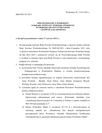 Wodzisław Śl., 12.07.2012 r. BRZ.0021.07.2012 SPRAWOZDANIE Z POSIEDZEŃ ZARZĄDU POWIATU WODZISŁAWSKIEGO W OKRESIE OD OSTATNIEJ SESJI - GŁÓWNE ZAGADNIENIA I. Zarząd na posiedzeniu w dniu 27 czerwca 2012 r.: 1. Przyjął projekt uchwały Rady Powiatu Wodzisławskiego w sprawie zmiany uchwały Rady Powiatu Wodzisławskiego Nr XIII/143/2011 z dnia 22 grudnia 2011 roku w sprawie uchwalenia Wieloletniej Prognozy Finansowej Powiatu Wodzisławskiego na lata 2012–2022 i postanowił zwrócić się do Przewodniczącego Rady Powiatu o zwołanie w miesiącu lipcu sesji Rady Powiatu w celu rozpatrzenia i ewentualnego podjęcia ww. uchwały. 2. Podjął uchwały w następujących sprawach: 1) powierzenia Pani Teresie Jakubiak stanowiska dyrektora Poradni Psychologiczno – Pedagogicznej w Wodzisławiu Śląskim, w wyniku przeprowadzonego postępowania konkursowego, 2) powołania komisji egzaminacyjnej na stopień nauczyciela mianowanego dla: Anny Przybyła – Skatuła, Alicji Foltyn, Anny Mucha, Grzegorza Mięsok, Wioletty Worach, Anny Politowicz, Ireny Pluta, Edyty Matera, 3) wyrażenia zgody na zawarcie umowy o udzielenie Powiatowi Wodzisławskiemu pomocy finansowej przez: a) Gminę Mszana w wysokości 9 545 zł z przeznaczeniem na realizację zadania: Opracowanie dokumentacji pod nazwą „Wykonanie chodnika wraz z kanalizacją deszczową przy ul. Centralnej w Połomi w rejonie wiaduktu nr WD 530 nad autostradą A-1”, b) Miasto Wodzisław Śląski w wysokości 85 714 zł z przeznaczeniem na realizację zadania pn. „Aktualizacja baz danych kartograficznych prowadzonych przez Powiatowy Ośrodek Dokumentacji Geodezyjnej i Kartograficznej w granicach administracyjnych miasta Wodzisław Śląski”, 4) uzgodnienia projektu miejscowego planu zagospodarowania przestrzennego dla sołectwa Mszana i sołectwa Gogołowa, 5) zmian w budżecie Powiatu Wodzisławskiego na 2012 rok. II. Zarząd na posiedzeniu w dniu 4 lipca 2012 r.: 1. Zaakceptował wysokość pomocy zdrowotnej dla nauczycieli w kwocie 17 880 zł. zaproponowaną przez Komisję do spraw rozpatrywania podań o pomoc zdrowotną dla nauczycieli zatrudnionych w szkołach i placówkach oświatowych prowadzonych przez Powiat Wodzisławski. 2. Przyjął zmiany w planach naborowych do klas I szkół ponadgimnazjalnych na rok szkolny 2012/2013. 3. Przyjął projekt uchwały Rady Powiatu Wodzisławskiego w sprawie zmiany uchwały Rady Powiatu Wodzisławskiego Nr XIII/142/2011 z dnia 22.12.2011 roku w sprawie budżetu Powiatu Wodzisławskiego na 2012 r. wraz z załącznikami, który jest przedmiotem obrad dzisiejszej sesji. 4. Podjął uchwały w następujących sprawach: 1) wyrażenia zgody na przeprowadzenie postępowań dotyczących udzielenia zamówień publicznych, a także realizację zadania: „Termomodernizacja budynku Powiatowego Urzędu Pracy w Wodzisławiu Śląskim przy ul. Michalskiego 12” przez Powiatowy Urząd Pracy w Wodzisławiu Śląskim, 2) ustalenia wysokości dodatków motywacyjnych dla dyrektorów szkół i placówek oświatowych, dla których organem prowadzącym jest Powiat Wodzisławski w okresie od 1 sierpnia 2012 roku do 31 stycznia 2013 roku. 3) powołania komisji egzaminacyjnej na stopień nauczyciela mianowanego dla: Zuzanny Kozub, Adrianny Garbulowskiej – Gulec, Darii Rajman – Morawiec, Izabeli Kowalskiej – Cichos, Jerzego Dychała, Kamila Waliczek, Agnieszki Machnik, Karoliny Migas, Agnieszki Mroziakiewicz, Alicji Różak, Małgorzaty Janeckiej, Judyty Lamża, Agnieszki Wojcieszenko, Janusza Sokół, Michała Smudy, Joanny Kabut, Moniki Horyśniak, Eweliny Limanowskiej – Golda, Hanny Topol, 4) zmian w budżecie Powiatu Wodzisławskiego na 2012 rok. III. Zarząd na posiedzeniu w dniu 11 lipca 2012 r.: 1. Wyraził zgodę na zawarcie aneksu do Umowy nr 7 – dotacje sport - o wsparcie realizacji zadania publicznego pod nazwą; „Pożegnanie lata z siatkówka” w związku ze zmianą numeru rachunku bankowego MKS „ZORZA” Wodzisław Śląski. 2. Rozpatrzył pismo Regionalnego Stowarzyszenia Kulturalnego – Młodzieżowego Ośrodka „Flota Młodych – Port Wodzisław Śląski” z dnia 27 czerwca 2012 roku w sprawie wyrażenia zgody na sprostowanie błędnego zapisu w umowie na realizację zadania publicznego „Szczęśliwa kobieta – rodzinie na zdrowie – promocja zdrowego stylu życia mieszkanek Powiatu Wodzisławskiego”, przychylając się do prośby ww. Stowarzyszenia dotyczącego zmian w zapisie, co do ilości dotowanych uczestników. 3. Podjął uchwały w następujących sprawach: 1) wyrażenia zgody na przeprowadzenie postępowań dotyczących udzielenia zamówień publicznych, a także realizację zadania” „Przebudowa kanalizacji deszczowej w Zespole Szkół Ponadgimnazjalnych nr 1 w Rydułtowach przy ul. Skalnej 1” przez Zespół Szkół Ponadgimnazjalnych nr 1 w Rydułtowach”, 2) zmian w budżecie Powiatu Wodzisławskiego na 2012 rok.