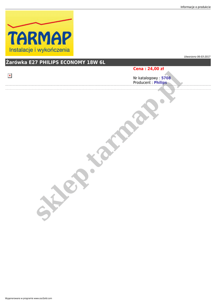 Informacje o produkcie Utworzono 06-03-2017 Żarówka E27 PHILIPS ECONOMY 18W 6L Cena : 24,00 zł sk le p .t a rm ap .p l Nr katalogowy : 5708 Producent : Philips Wygenerowano w programie www.oscGold.com