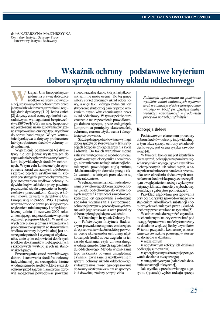 BEZPIECZEÑSTWO PRACY 3/2003 dr in¿. KATARZYNA MAJCHRZYCKA Centralny Instytut Ochrony Pracy – Pañstwowy Instytut Badawczy WskaŸnik ochrony – podstawowe kryterium doboru sprzêtu ochrony uk³adu oddechowego krajach Unii Europejskiej zagadnienia prawne dotycz¹ce œrodków ochrony indywidualnej, stosowanych w celu ochrony przed jednym lub wieloma zagro¿eniami, reguluj¹ dwie dyrektywy [1, 2]. Jedna z nich [2] dotyczy zasad oceny zgodnoœci z zasadniczymi wymaganiami bezpieczeñstwa (89/686/EWG), ma wiêc bezpoœrednie prze³o¿enie na uregulowania zwi¹zane z wprowadzaniem tego typu wyrobów do obrotu handlowego. W tym kontekœcie dyrektywa ta dotyczy producentów lub dystrybutorów œrodków ochrony indywidualnej. Wype³nienie postanowieñ tej dyrektywy nie jest jednak wystarczaj¹ce do zapewnienia bezpieczeñstwa u¿ytkownikom indywidualnych œrodków ochronnych. W tym celu konieczne by³o opracowanie zasad zwi¹zanych z doborem i szeroko pojêtym u¿ytkowaniem, których przestrzeganie przez osoby zarz¹dzaj¹ce stosowaniem œrodków ochrony indywidualnej w zak³adzie pracy, powinno przyczyniaæ siê do zapewnienia bezpieczeñstwa pracownikom. Zasady, o których mowa, zawarte w dyrektywie Unii Europejskiej nr 89/656/EWG [1] zosta³y wprowadzone do prawa polskiego rozporz¹dzeniem ministra pracy i polityki spo³ecznej z dnia 11 czerwca 2002 roku, zmieniaj¹cego rozporz¹dzenie w sprawie ogólnych przepisów bhp [3]. W myœl nowych przepisów jednym z wa¿niejszych problemów zwi¹zanych ze stosowaniem œrodków ochrony indywidualnej jest dostrzeganie potrzeb i wymagañ u¿ytkownika, a nie tylko odpowiedni dobór tych œrodków do czynników niebezpiecznych i szkodliwych wystêpuj¹cych na stanowiskach pracy. Przestrzeganie zasad prawid³owego doboru i stosowania œrodków ochrony indywidualnej jest szczególnie istotne w odniesieniu do œrodków, które s³u¿¹ do ochrony przed zagro¿eniami ¿ycia i zdrowia mog¹cymi powodowaæ powa¿ne i nieodwracalne skutki, których u¿ytkownik sam nie mo¿e oceniæ. Do tej grupy nale¿y sprzêt chroni¹cy uk³ad oddechowy, a wiêc taki, którego zadaniem jest stworzenie skutecznej bariery przed wnikaniem czynników chemicznych przez uk³ad oddechowy. W tym aspekcie du¿e znaczenie ma zapewnienie prawid³owego doboru sprzêtu, przez osi¹gniêcie kompromisu pomiêdzy skutecznoœci¹ ochronn¹, czasem u¿ytkowania i akceptacj¹ u¿ytkownika. Szczególnego potraktowania wymaga dobór sprzêtu do stosowania w tzw. sytuacjach bezpoœredniego zagro¿enia ¿ycia i zdrowia. Do takich warunków mo¿na zaliczyæ wystêpowanie niedoboru tlenu, gwa³towny wyciek czynnika chemicznego, niezamierzone reakcje substancji chemicznych, powoduj¹ce nag³¹ zmianê sk³adu atmosfery œrodowiska pracy, a tak¿e warunki, w których prowadzone s¹ akcje ratownicze. W celu zapewnienia mo¿liwoœci dokonania prawid³owego doboru sprzêtu ochrony uk³adu oddechowego do wymienionych zagro¿eñ i czynnoœci zawodowych, konieczne jest opracowanie i wdro¿enie sposobu wyznaczania skutecznoœci ochronnej sprzêtu w przewidywanych warunkach jego stosowania oraz procedury doboru opieraj¹cej siê na wskaŸniku. W Centralnym Instytucie Ochrony Pracy – Pañstwowym Instytucie Badawczym prowadzone s¹ prace zmierzaj¹ce do opracowania wskaŸnika, który pozwoli na ocenê skutecznoœci ochronnej u¿ytkowanych œrodków, bez wzglêdu na ich zasadê dzia³ania, czyli uniwersalnego w odniesieniu do ró¿nych zagro¿eñ uk³adu oddechowego. Metoda wyznaczania tego wskaŸnika powinna uwzglêdniaæ czynniki zwi¹zane z u¿ytkowaniem sprzêtu ochrony uk³adu oddechowego, zw³aszcza mo¿liwoœæ jego dopasowania do twarzy u¿ytkownika w czasie spoczynku i dowolnej zmiany pozycji cia³a. Publikacja opracowana na podstawie wyników zadañ badawczych wykonanych w ramach projektu celowego zamawianego nr 16-21 pn. „System analizy wydarzeñ wypadkowych w œrodowisku pracy dla potrzeb profilaktyki” Koncepcja doboru Podstawowym elementem procedury doboru œrodków ochrony indywidualnej, w tym tak¿e sprzêtu ochrony uk³adu oddechowego, jest ocena ryzyka zawodowego [4]. W tym celu konieczna jest identyfikacja zagro¿eñ, polegaj¹ca na pomiarze stê¿eñ wszystkich wystêpuj¹cych czynników niebezpiecznych lub szkodliwych, a nastêpnie ustaleniu czasu nara¿enia pracownika oraz okreœleniu dodatkowych uwarunkowañ œrodowiska pracy, ze szczególnym uwzglêdnieniem rodzaju wykonywanej pracy, klimatu, atmosfery wybuchowej, wentylacji i gabarytów pomieszczeñ. Przyk³ad algorytmu postêpowania przy ocenie ryzyka spowodowanego wyst¹pieniem szkodliwych substancji chemicznych wch³anianych przez uk³ad oddechowy przedstawiono na rysunku [5]. W odniesieniu do zagro¿eñ czynnikami chemicznymi nale¿y zawsze braæ pod uwagê, ¿e pracownik mo¿e byæ nara¿ony na dzia³anie wiêkszej liczby czynników. W takim przypadku konieczne jest ustalenie czy zwi¹zki te pozostaj¹ w stosunku do siebie w dzia³aniu: • niezale¿nym • addytywnym (efekty ich dzia³ania podlegaj¹ sumowaniu) • synergistycznym (nastêpuje potêgowanie dzia³ania toksycznego) • antagonistycznym (os³abienie dzia³ania substancji toksycznej). Jak wynika z przedstawionego algorytmu (rysunek) wybór rodzaju sprzêtu 25 BEZPIECZEÑSTWO PRACY 3/2003 Rys. Algorytm postêpowania przy szacowaniu ryzyka, w przypadku nara¿enia na czynniki niebezpieczne i szkodliwe dla uk³adu oddechowego [6] ochrony uk³adu oddechowego zale¿y od relacji w jakiej pozostaje stê¿enie szkodliwych substancji chemicznych w œrodowisku pracy do wartoœci najwy¿szych dopuszczalnych stê¿eñ (NDS) tych czynników. Im wiêksze jest przekroczenie dopuszczalnych wartoœci stê¿eñ, tym ochrona powinna charakteryzowaæ siê wy¿sz¹ skutecznoœci¹, a zatem wskaŸnik ochrony powinien mieæ wiêksz¹ wartoœæ. Mówi¹c najogólniej, wskaŸnik ochrony wyra¿a krotnoœæ obni¿enia stê¿enia zanieczyszczeñ wystêpuj¹cych w œrodowisku pracy wskutek za