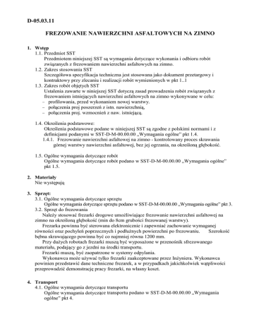 D-05.03.11 FREZOWANIE NAWIERZCHNI ASFALTOWYCH NA ZIMNO 1. Wstęp 1.1. Przedmiot SST Przedmiotem niniejszej SST są wymagania dotyczące wykonania i odbioru robót związanych z frezowaniem nawierzchni asfaltowych na zimno. 1.2. Zakres stosowania SST Szczegółowa specyfikacja techniczna jest stosowana jako dokument przetargowy i kontraktowy przy zlecaniu i realizacji robót wymienionych w pkt 1..1 1.3. Zakres robót objętych SST Ustalenia zawarte w niniejszej SST dotyczą zasad prowadzenia robót związanych z frezowaniem istniejących nawierzchni asfaltowych na zimno wykonywane w celu: − profilowania, przed wykonaniem nowej warstwy. − połączenia proj poszerzeń z istn. nawierzchnią, − połączenia proj. wzmocnień z naw. istniejącą. 1.4. Określenia podstawowe: Określenia podstawowe podane w niniejszej SST są zgodne z polskimi normami i z definicjami podanymi w SST-D-M-00.00.00 „Wymagania ogólne” pkt 1.4. 1.4.1. Frezowanie nawierzchni asfaltowej na zimno - kontrolowany proces skrawania górnej warstwy nawierzchni asfaltowej, bez jej ogrzania, na określoną głębokość. 1.5. Ogólne wymagania dotyczące robót Ogólne wymagania dotyczące robót podano w SST-D-M-00.00.00 „Wymagania ogólne” pkt 1.5. 2. Materiały Nie występują 3. Sprzęt: 3.1. Ogólne wymagania dotyczące sprzętu Ogólne wymagania dotyczące sprzętu podano w SST-D-M-00.00.00 „Wymagania ogólne” pkt 3. 3.2. Sprzęt do frezowania NaleŜy stosować frezarki drogowe umoŜliwiające frezowanie nawierzchni asfaltowej na zimno na określoną głębokość (min do 8cm grubości frezowanej warstwy). Frezarka powinna być sterowana elektronicznie i zapewniać zachowanie wymaganej równości oraz pochyleń poprzecznych i podłuŜnych powierzchni po frezowaniu. Szerokość bębna skrawającego powinna być co najmniej równa 1200 mm. Przy duŜych robotach frezarki muszą być wyposaŜone w przenośnik sfrezowanego materiału, podający go z jezdni na środki transportu. Frezarki muszą, być zaopatrzone w systemy odpylania. Wykonawca moŜe uŜywać tylko frezarki zaakceptowane przez InŜyniera. Wykonawca powinien przedstawić dane techniczne frezarek, a w przypadkach jakichkolwiek wątpliwości przeprowadzić demonstrację pracy frezarki, na własny koszt. 4. Transport 4.1. Ogólne wymagania dotyczące transportu Ogólne wymagania dotyczące transportu podano w SST-D-M-00.00.00 „Wymagania ogólne” pkt 4. 4.2. Transport sfrezowanego materiału powinien być tak zorganizowany, aby zapewnić pracę frezarki bez postojów. Materiał moŜe być wywoŜony dowolnymi środkami transportowymi. 5. Wykonanie robót 5.1. Ogólne zasady wykonania robót Ogólne zasady wykonania robót podano w SST-D-M-00.00.00 „Wymagania ogólne” pkt 5. 5.2. Wykonanie frezowania Nawierzchnia powinna być frezowana do głębokości, szerokości i pochyleń zgodnych z dokumentacją projektową i SST. Frezowanie obejmuje wykonanie „zacięcia” dla połączenia nakładanej warstw wzmocnienia z istniejącą nawierzchnią, frezowanie lokalnych deformacji na części jezdni, dla uzyskania profilu poprzecznego i podłuŜnego pod warstwę wiąŜącą, określonego zgodnie projektem oraz dla połączenia nawierzchni istniejacej z projektowanymi poszerzeniami. JeŜeli ruch drogowy ma być dopuszczony po sfrezowanej części jezdni, to wówczas, ze względów bezpieczeństwa naleŜy spełnić następujące warunki: a) naleŜy usunąć ścięty materiał i oczyścić nawierzchnię, b) przy frezowaniu poszczególnych pasów ruchu, wysokość podłuŜnych pionowych krawędzi nie moŜe przekraczać 40 mm, c) przy lokalnych naprawach polegających na sfrezowaniu nawierzchni przy linii krawęŜnika (ścieku) dopuszcza się większy uskok niŜ określono w pkt b), ale przy głębokości większej od 75 mm wymaga on specjalnego oznakowania, d) krawędzie poprzeczne na zakończenie dnia roboczego powinny być klinowo ścięte. 6. Kontrola jakości robót 6.1. Ogólne zasady kontroli jakości robót Ogólne zasady kontroli jakości robót podano w SST-D-M-00.00.00 „Wymagania ogólne” pkt 6. 6.2. Częstotliwość oraz zakres pomiarów kontrolnych 6.2.1. Minimalna częstotliwość pomiarów Częstotliwość oraz zakres pomiarów dla nawierzchni frezowanej na zimno podano w tablicy 1. Tablica 1. Częstotliwość oraz zakres pomiarów kontrolnych nawierzchni frezowanej na zimno Lp. Właściwość nawierzchni Minimalna częstotliwość pomiarów 1 Równość podłuŜna łatą 4-metrową co 20 metrów 2 Równość poprzeczna łatą 4-metrową co 20 metrów 3 Spadki poprzeczne co 50 m 4 Szerokość frezowania co 50 m 5 Głębokość frezowania na bieŜąco, według SST 6.2.2. Równość nawierzchni Nierówności powierzchni po frezowaniu mierzone łatą 4-metrową zgodnie z BN-68/893104 [1] nie powinny przekraczać 6 mm. 6.2.3. Spadki poprzeczne Spadki poprzeczne nawierzchni po frezowaniu powinny być zgodne z dokumentacją projektową, z tolerancją ± 0,5%. 6.2.4. Szerokość frezowania Szerokość frezowania powinna odpowiadać szerokości określonej w dokumentacji projektowej z dokładnością ± 5 cm. 6.2.5. Głębokość frezowania Głębokość frezowania powinna odpowiadać głębokości, umoŜliwiającej ułoŜenie warstw nawierzchni określonych w dokumentacji projektowej z dokładnością ± 5 mm. 7. Obmiar robót 7.1. Ogólne zasady obmiaru robót Ogólne zasady obmiaru robót podano w SST-D-M-00.00.00 „Wymagania ogólne” pkt 7. 7.2. Jednostka obmiarowa Jednostką obmiarową jest m2 (metr kwadratowy) 8. Odbiór robót 8.1. Ogólne zasady odbioru robót Ogólne zasady odbioru robót podano w SST-D-M-00.00.00 „Wymagania ogólne” pkt 8. Roboty uznaje się za wykonane zgodnie z dokumentacją projektową, SST i wymaganiami InŜyniera, jeŜeli wszystkie pomiary i badania z zachowaniem tolerancji wg pkt 6 dały wyniki pozytywne. 9. Podstawy płatności 9.1. Ogólne ustalenia dotyczące podstawy płatności Ogólne ustalenia doty
