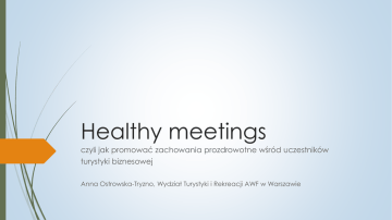 Healthy meetings czyli jak promować zachowania prozdrowotne wśród uczestników turystyki biznesowej Anna Ostrowska-Tryzno, Wydział Turystyki i Rekreacji AWF w Warszawie ALE PO KOLEI… „Organizm człowieka to nie maszyna” – Główne zagrożenia cywilizacyjne. Negatywne dla zdrowia uczestników skutki podróży i spotkań biznesowych „Uczestnik = człowiek” - Nowe spojrzenie na pracownika Obszary realizacji założeń „healthy meetings” Inni już to robią… - Przykłady „dobrych praktyk” Zadania na przyszłość www.webmd.com Organizm człowieka to nie maszyna – główne zagrożenia cywilizacyjne Rosnąca zachorowalność na choroby układu krążenia. Wzrost liczby osób z nadwagą lub otyłością, szczególnie wśród mężczyzn (ponad 60%). Niewłaściwe wzorce żywieniowe – niski poziom spożycia owoców i warzyw w Polsce. Postępująca hipokinezja - jedynie 26% Polaków regularnie podejmuje aktywność fizyczną. Przeciętna długość życia wzrasta, ale ważna jest także jakość życia! To już zależy od stylu życia… (Narodowy Instytut Zdrowia Publicznego 2012, Eurostat, OECD, WHO). Organizm człowieka to nie maszyna Negatywne dla zdrowia uczestników skutki podróży i spotkań biznesowych Stres związany z pracą zawodową deklarowany przez ponad 50% Europejczyków (Eurobarometer 2013); Wysoka częstotliwość wyjazdów służbowych w ciągu roku, mająca wpływ na relacje zawodowe, rodzinne, społeczne; www.health.gov.sk.ca Zagrożenia dla zdrowia pracowników w trakcie i po powrocie z wyjazdów służbowych (Rogers, Reilly 2002; Dimberg, Striker 2002): „jet lag”, problemy żołądkowe, bezsenność, przemęczenie, problemy skórne, problemy oddechowe, rozdrażnienie, uczucie niepokoju „Uczestnik = człowiek” - Nowe spojrzenie na pracownika Raport UNWTO – CSR w zakresie podnoszenia świadomości zdrowotnej (Health Awarness Campaigns) Karta Toroncka zachęcająca do aktywności fizycznej - The Toronto Charter for Physical Activity „A global call for action” Europejska Sieć Promocji Zdrowia w miejscu pracy - The European Network for Workplace Health Promotion – „Healthy Work in an Ageing Europe” Promoting mental health and well being in workplaces, EU-Conference, Berlin 2011 Obszary realizacji „healthy meetings” Planowanie harmonogramu spotkania Wybór miejsca, obiektu Dobór wyposażenia sali, obiektu Ustalanie menu Oferta usług towarzyszących kosmic-kitchen.com Aktywność fizyczna – korzyści dla zdrowia uczestników Wzrost koncentracji Poprawa efektywności, kreatywności Pozytywne podejście (wzrost poziomu endorfin) Równowaga psychofizyczna www.pcal.nsw.gov.au Aktywność fizyczna Budowanie relacji w zespole, Efektywniejsza współpraca Zwiększona odporność organizmu – mniejsza absencja, szybsza adaptacja do nowych warunków appletoncreative.com kingcounty.gov Inni już to robią… - Przykłady „dobrych praktyk” „Obiegnij Narodowy” – wspólne bieganie podczas Meetings Week Ekoprzekąski, zielony bufet Strefy wypoczynku, Cospopolitan Lounge w halach targowych Messe Frankfurt Zajęcia relaksacyjne, zajęcia fitness, ćwiczenia podczas wyjazdów służbowych Mikrobreaks podczas obrad konferencyjnych, rozmów biznesowych (MPI World Education Congress) health.state.tn.us Inni już to robią… - Przykłady „dobrych praktyk” Akcja StairWell „Take the stairs” m. in. Koger Center Rhodes Building, Atlanta Model oceny ergonomicznej wyposażenia w firmie Volvo w Göteborgu Programy wellness, zajęcia fitness dla pracowników (WTiR AWF Warszawa, University of California, Irvine) Zielone spotkania – Green meetings, to też z myślą o człowieku… http://www.cdc.gov/nccdphp/dnpao Zadania na przyszłość Konsekwentne podnoszenie świadomości zdrowotnej wśród organizatorów imprez biznesowych, zarządców obiektów, uczestników, przyszłych kadr Współpraca nauki i biznesu – wspólne badania Certyfikowanie obiektów i organizatorów „Healthy meetings and events”… Zmiana nawyków - najlepiej zacząć od siebie Dziękuję za uwagę … i zapraszam do współpracy [email protected] Zakład Metodyki Turystyki Wydział Turystyki i Rekreacji AWF w Warszawie kosmic-kitchen.com