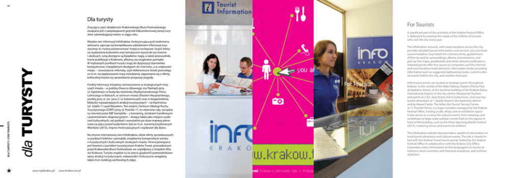 68 Dla turysty For Tourists Miejska sieć informacji InfoKraków, funkcjonująca pod siedmioma adresami, zajmuje się kompleksowo udzielaniem informacji turystycznej: tu można zarezerwować miejsca noclegowe i kupić bilety na wydarzenia kulturalne oraz tematyczne wycieczki po mieście i okolicach, tutaj dostępne są bezpłatne mapy, a także przewodniki, liczne publikacje o Krakowie, albumy czy oryginalne pamiątki. W wybranych punktach turyści mają do dyspozycji stanowiska komputerowe z bezpłatnym dostępem do Internetu, a w większości miejsc – nowoczesne infomaty, czyli elektroniczne kioski pozwalające m.in. na zaplanowanie trasy zwiedzania, zapoznanie się z ofertą kulturalną miasta czy sprawdzenie prognozy pogody. dla TURYSTY DLA TURYSTY / FOR TOURISTS Znacząca część działalności Krakowskiego Biura Festiwalowego związana jest z zaspokajaniem potrzeb kilkumilionowej rzeszy turystów odwiedzającej miasto w ciągu roku. www.infokrakow.pl Punkty informacji miejskiej rozmieszczono w strategicznych miejscach miasta – w pobliżu Dworca Głównego (na Plantach przy ul. Szpitalnej) i w budynku terminalu Międzynarodowego Portu Lotniczego w Balicach, w centrum miasta (Pawilon Wyspiańskiego, punkty przy ul. św. Jana 2 i w Sukiennicach) oraz w bezpośredniej bliskości najważniejszych atrakcji turystycznych – na Kazimierzu (ul. Józefa 7) i pod Wawelem. Ten ostatni, Centrum Obsługi Ruchu Turystycznego (CORT) przy ul. Powiśle 11, to właściwie cały, zarządzany również przez KBF kompleks – z kawiarnią, stoiskami handlowymi i przestrzeniami ekspozycyjnymi – służący także jako miejsce wydarzeń kulturalnych, od spotkań i warsztatów po duże imprezy plenerowe na placu przed budynkiem: był on m.in. scenerią trzydniowych Wianków (2013), imprez motoryzacyjnych i wydarzeń dla dzieci. Na stronie internetowej sieci InfoKraków, obok oferty sprzedawanych w punktach biletów i pamiątek, znajdziemy kompendium wiedzy o turystycznych i kulturalnych atrakcjach miasta. Strona powiązana jest bowiem z portalem turystycznym Kraków Travel, prowadzonym przez Krakowskie Biuro Festiwalowe we współpracy z Urzędem Miasta Krakowa. Turysta znajdzie tu (w pięciu językach!) przewodnikowe opisy atrakcji turystycznych, ciekawostki i historyczne anegdoty, także m.in. kolekcję archiwalnych zdjęć. www.krakow.travel A significant part of the activities of the Krakow Festival Office is dedicated to meeting the needs of the millions of tourists who visit the city every year. The InfoKraków network, with seven locations across the city, provides detailed tourist information and services: you can book accommodation, buy tickets for cultural events, guided tours of the city and its surroundings, albums and souvenirs, and pick up free maps, guidebooks and other relevant publications. Selected points offer free access to computers and the Internet, and most locations hold electronic information kiosks providing information such as suggested sightseeing routes, current cultural events held in the city, and weather forecasts. 69 For Tourists Information points are located at strategic points throughout Kraków: in the vicinity of the Main Railway Station (Planty Park at Szpitalna Street), at the terminal building of the Kraków Balice International Airport, in the city centre (Wyspiański Pavilion and points at 2 Św. Jana Street and in Sukiennice), and near key tourist attractions at 7 Józefa Street in the Kazimierz district and by Wawel Castle. The latter, the Tourist Service Centre at 11 Powiśle Street, is a major complex managed by the Krakow Festival Office, hosting a café, shops and an exhibition space; it also serves as a venue for cultural events, from meetings and workshops to large-scale outdoor events held on the square in front of the building, such as the three-day-long Wianki Festival (2013), motoring shows and events for children. The InfoKraków website also provides a wealth of information on local tourist attractions and cultural events. The site is closely linked with the Kraków Travel tourist portal, hosted by the Krakow Festival Office in collaboration with the Krakow City Office. It provides visitor information (in five languages!) on tourist attractions, local curiosities and historical anecdotes, and archives of photos.