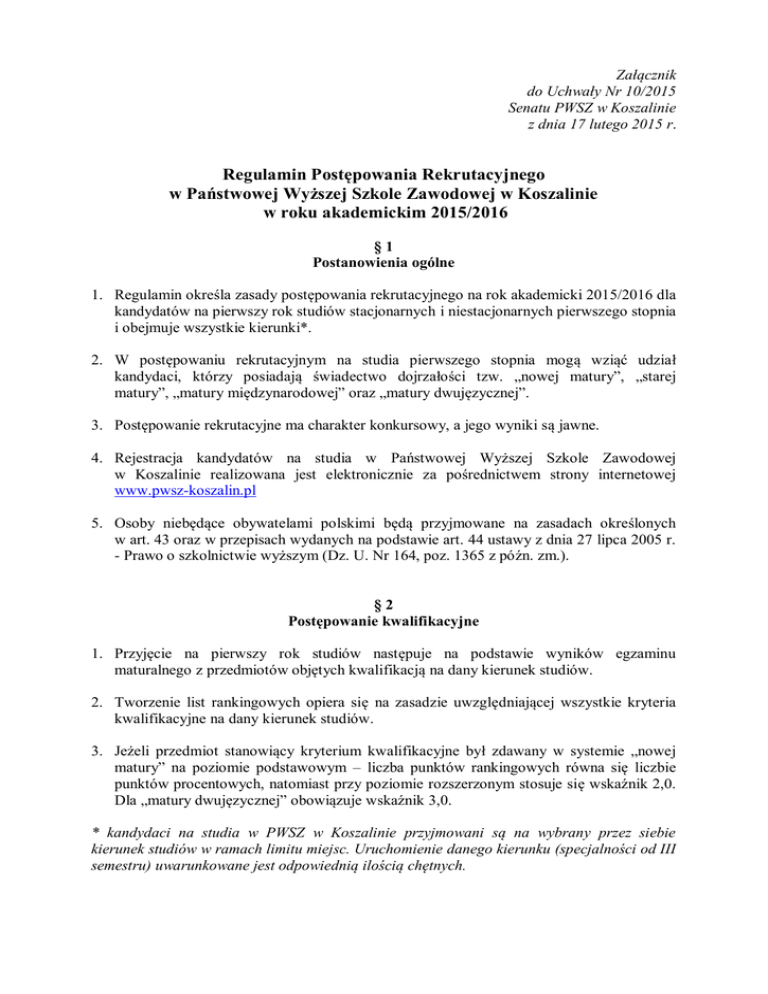Załącznik do Uchwały Nr 10/2015 Senatu PWSZ w Koszalinie z dnia 17 lutego 2015 r. Regulamin Postępowania Rekrutacyjnego w Państwowej Wyższej Szkole Zawodowej w Koszalinie w roku akademickim 2015/2016 §1 Postanowienia ogólne 1. Regulamin określa zasady postępowania rekrutacyjnego na rok akademicki 2015/2016 dla kandydatów na pierwszy rok studiów stacjonarnych i niestacjonarnych pierwszego stopnia i obejmuje wszystkie kierunki*. 2. W postępowaniu rekrutacyjnym na studia pierwszego stopnia mogą wziąć udział kandydaci, którzy posiadają świadectwo dojrzałości tzw. „nowej matury”, „starej matury”, „matury międzynarodowej” oraz „matury dwujęzycznej”. 3. Postępowanie rekrutacyjne ma charakter konkursowy, a jego wyniki są jawne. 4. Rejestracja kandydatów na studia w Państwowej Wyższej Szkole Zawodowej w Koszalinie realizowana jest elektronicznie za pośrednictwem strony internetowej www.pwsz-koszalin.pl 5. Osoby niebędące obywatelami polskimi będą przyjmowane na zasadach określonych w art. 43 oraz w przepisach wydanych na podstawie art. 44 ustawy z dnia 27 lipca 2005 r. - Prawo o szkolnictwie wyższym (Dz. U. Nr 164, poz. 1365 z późn. zm.). §2 Postępowanie kwalifikacyjne 1. Przyjęcie na pierwszy rok studiów następuje na podstawie wyników egzaminu maturalnego z przedmiotów objętych kwalifikacją na dany kierunek studiów. 2. Tworzenie list rankingowych opiera się na zasadzie uwzględniającej wszystkie kryteria kwalifikacyjne na dany kierunek studiów. 3. Jeżeli przedmiot stanowiący kryterium kwalifikacyjne był zdawany w systemie „nowej matury” na poziomie podstawowym – liczba punktów rankingowych równa się liczbie punktów procentowych, natomiast przy poziomie rozszerzonym stosuje się wskaźnik 2,0. Dla „matury dwujęzycznej” obowiązuje wskaźnik 3,0. * kandydaci na studia w PWSZ w Koszalinie przyjmowani są na wybrany przez siebie kierunek studiów w ramach limitu miejsc. Uruchomienie danego kierunku (specjalności od III semestru) uwarunkowane jest odpowiednią ilością chętnych. 4. Kandydaci, którzy zdawali egzamin dojrzałości w systemie „starej matury” otrzymują liczbę punktów odpowiednio: Ocena 6,0 5,0 4,0 3,0 2,0 Skala 5-stopniowa, liczba punktów 100 80 60 40 20 Skala 3-stopniowa, liczba punktów --100 80 60 --- 5. Kandydaci posiadający „maturę międzynarodową” otrzymują odpowiednio: excellent very good good satisfactory medicore 100 pkt. 85 pkt. 70 pkt. 50 pkt. 30 pkt. 6. Kandydaci legitymujący się świadectwami maturalnymi uzyskanymi za granicą, przedkładają zaświadczenie właściwego kuratora oświaty, uznające takie świadectwo za równorzędne polskiemu świadectwu dojrzałości, zgodnie z Rozporządzeniem Ministra Edukacji i Nauki z dnia 6 kwietnia 2006 r. w sprawie nostryfikacji świadectw szkolnych i świadectw maturalnych uzyskanych za granicą (Dz. U. Nr 63, poz. 443). Nostryfikacji świadectw uzyskanych za granicą dokonuje kurator oświaty właściwy ze względu na miejsce zamieszkania osoby ubiegającej się o nostryfikację, a w przypadku braku takiego miejsca – kurator oświaty właściwy ze względu na siedzibę instytucji, w której osoba zamierza złożyć świadectwo uzyskane za granicą (§ 2 Rozporządzenia). Uzyskane oceny przeliczane są na skalę punktową, jak w ust. 4. 7. Kandydaci – laureaci i finaliści olimpiad przedmiotowych szczebla centralnego są przyjmowani na dany kierunek studiów z pominięciem procedur rekrutacyjnych, pod warunkiem przedłożenia odpowiedniego dokumentu w oryginale, który jest ważny przez okres trzech lat od daty jego wydania lub potwierdzonego notarialnie odpisu, wraz ze złożeniem kompletu wymaganych dokumentów. §3 Postępowanie rekrutacyjne 1. Do postępowania rekrutacyjnego na rok akademicki 2015/2016 są dopuszczeni kandydaci, którzy do 3 lipca 2015 r. zarejestrują się w Systemie Elektronicznej Rekrutacji Kandydatów (SERK). 2. W razie konieczności, Uczelnia umożliwi dostęp do komputerów, z których kandydaci będą mogli dokonać rejestracji na studia w SERK. Warunkiem dopuszczenia kandydata do postępowania rekrutacyjnego jest dokonanie do dnia 3 lipca 2015 r. opłaty rekrutacyjnej na konto Uczelni (numer konta dostępny na stronie internetowej PWSZ w Koszalinie), w kwocie ustalonej Zarządzeniem Rektora. 3. Opłata nie podlega zwrotowi. 4. Rejestrację internetową kandydata uznaje się za wiążącą po łącznym spełnieniu poniższych warunków: a) wprowadzeniu wszystkich niezbędnych danych w SERK – uzyskanie statusu „rekrutację zakończono”. Kandydat ponosi pełną odpowiedzialność za poprawność wprowadzanych danych; b) przesłanie wyników egzaminu maturalnego na poniższy adres: [email protected] 5. Państwowa Wyższa Szkoła Zawodowa w Koszalinie nie ponosi odpowiedzialności za niemożność rejestracji spowodowaną awariami sieci internetowej, przeciążeniem serwerów, itp. W przypadku wystąpienia sytuacji, o których mowa powyżej, kandydat zgłasza się osobiście, w wyznaczonym terminie rejestracji, do Sekretariatu ds. Nauczania. W przypadku niemożności zgłoszenia się przed upływem terminu rejestracji, kandydat niezwłocznie informuje telefonicznie Referat ds. Nauczania o zaistniałej sytuacji. §4 Warunki kwalifikacji kandydatów na poszczególne kierunki Kierunek* PEDAGOGIKA specjalność: pedagogika wczesnoszkolna i przedszkolna - specjalizacja nauczycielska - studia stacjonarne / niestacjonarne Przedmioty objęte kwalifikacją „nowa matura” – część pisemna jeden dowolny przedmiot wybrany przez kandydata na poziomie podstawowym lub rozszerzonym „stara matura”, „matura międzynarodowa” „matura dwujęzyczna” jeden dowolny przedmiot wybrany przez kandydata * kandydaci na studia w PWSZ w Koszalinie przyjmowani są na wybrany przez siebie kierunek studiów w ramach limitu miejsc. Uruchomienie danego kierunku (specjalności od III semestru) uwarunkowane jest o