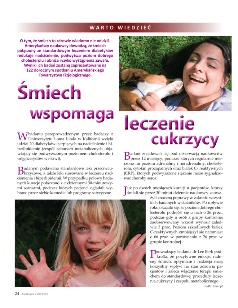 WARTO WIEDZIEĆ O tym, że śmiech to zdrowie wiadomo nie od dziś. Amerykańscy naukowcy dowodzą, że śmiech połączony ze standardowym leczeniem diabetyków redukuje nadciśnienie, podwyższa poziom dobrego cholesterolu i obniża ryzyko wystąpienia zawału. Wyniki ich badań zostaną zaprezentowane na 122 dorocznym spotkaniu Amerykańskiego Towarzystwa Fizjologicznego. Śmiech wspomaga W badaniu przeprowadzonym przez badaczy z Uniwersytetu Loma Linda w Kalifornii wzięło udział 20 diabetyków cierpiących na nadciśnienie i hiperlipidemię (zespół zaburzeń metabolicznych objawiający się podwyższonym poziomem cholesterolu i trójglicerydów we krwi). B adanym podawano standardowe leki przeciwcukrzycowe, a także leki stosowane w leczeniu nadciśnienia i hiperlipidemii. W przypadku połowy badanych kurację połączono z codziennymi 30-minutowymi seansami, podczas których pacjenci oglądali wybrane przez siebie komedie lub programy satyryczne. leczenie B cukrzycy adani znajdowali się pod obserwacją naukowców przez 12 miesięcy, podczas których regularnie mierzono im poziom adrenaliny i noradrenaliny, cholesterolu, cytokin prozapalnych oraz białek C- reaktywnych (CRP), których podwyższone stężenie może sygnalizować choroby serca. J uż po dwóch miesiącach kuracji u pacjentów, którzy śmiali się przez 30 minut dziennie naukowcy zauważyli znaczną poprawę w zakresie wszystkich badanych wskaźników. Po upływie roku okazało się, że poziom dobrego cholesterolu podniósł się u nich o 26 proc., podczas gdy u osób z grupy kontrolnej zaobserwowany wzrost wynosił zaledwie 3 proc. Poziom szkodliwych białek C-reaktywnych zmniejszył się natomiast o 66 proc. w porównaniu z 26 proc. w grupie kontrolnej. P rowadzący badania dr Lee Berk podkreśla, że pozytywne emocje, radosny śmiech, optymizm i nadzieja mają korzystny wpływ na stan zdrowia pacjentów i zaleca włączenie terapii śmiechem do standardowej procedury leczenia cukrzycy i zespołu metabolicznego. źródło: Onet.pl 24 Cukrzyca a Zdrowie