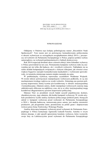 ROCZNIKI NAUK SPOŁECZNYCH Tom 7(43), numer 3 – 2015 DOI: http://dx.doi.org/10.18290/rns.2015.7(43).3-1 WPROWADZENIE Oddajemy w Państwa ręce kolejny politologiczny numer „Roczników Nauk Społecznych”. Tym razem jest on poświęcony komunikowaniu politycznemu w okresie wyborczym ze szczególnym uwzględnieniem elekcji 2014 r., począwszy od wyborów do Parlamentu Europejskiego w Polsce, poprzez polskie wybory samorządowe, na wyborach parlamentarnych w Indiach skończywszy. Rok 2014 rozpoczął dwuletni okres czterech elekcji, które kalendarz wyborczy w Polsce przewidział na ten czas. Permanentna kampania wyborcza stała się zauważalna już nie tylko dla badaczy, ale i zwykłych wyborców. Nakładanie się na siebie działań kampanijnych związanych z różnymi elekcjami, jak również coraz większe bogactwo narzędzi komunikowania kandydatów z wyborcami spowodowały, że tematyka niniejszego numeru niejako nasunęła się sama. W problematykę wyborczą wprowadza czytelników Waldemar Wojtasik. W swoim tekście poświęconym manipulacjom wyborczym podkreśla, że są one mechanizmem trwałego wpływu na wynik wyborów. Zmieniają one poziom politycznej niepewności, której wymiar jest kształtowany w sferach: instytucjonalnej i komunikacyjnej. Zdaniem autora, skutki manipulacji wyborczych częściej mają oddziaływanie obliczone na najbliższy czas, ale te ze sfery instytucjonalnej mogą kształtować długoterminowy poziom niepewności politycznej. Mateusz Nieć za przedmiot swych badań uczynił populistyczny dyskurs, charakterystyczny, jego zdaniem, dla każdej kampanii wyborczej. W swoim artykule przedstawia wyniki analizy dyskursu politycznego polskich partii, biorących udział w kampanii wyborczej przed wyborami do Parlamentu Europejskiego w 2014 r. Metodą badawczą, zastosowaną przez autora, jest analiza zawartości przekazów, jak przypomina autor, przeniesiona na polski grunt i dopracowana twórczo przez Irenę Tetelowską i Walerego Pisarka. Analizę dotyczącą kampanii wyborczej przed wyborami do Parlamentu Europejskiego w Polsce kontynuuje Agnieszka Łukasik-Turecka. Autorka w swym tekście ukazuje, w jaki sposób uprawnione komitety wyborcze, które wystawiły swoje listy na Lubelszczyźnie przed wyborami do Parlamentu Europejskiego 8 WPROWADZENIE w 2014 r., wykorzystały przyznany im czas antenowy w Radiu Lublin S.A. i jakie było kryterium podziału czasu między poszczególnych kandydatów. Szczególną uwagę autorka poświęciła zagadnieniu, czy w trakcie kampanii wyborczej uprawnione komitety wyborcze preferowały elity partyjne, przyznając im gros czasu antenowego, czy też przyznany czas dzielono proporcjonalnie między wszystkich kandydatów. Z kolei Szymon Ossowski swym tekstem przenosi nas do rozważań nad samorządową kampanią wyborczą 2014 r. W artykule analizuje przyczyny porażki Ryszarda Grobelnego w wyborach na stanowisko Prezydenta Poznania. W publikacji stara się odpowiedzieć na pytania: w jaki sposób w tak krótkim czasie Jackowi Jaśkowiakowi udało się zbudować tak wysokie poparcie, jakie błędy popełnił Ryszard Grobelny, że po 16 latach poznaniacy gremialnie opowiedzieli się przeciwko swojemu wieloletniemu prezydentowi, oraz czy pewne momenty kampanii można uznać za przesądzające o jej ostatecznym wyniku, a także jakie błędy popełnił w jej trakcie Ryszard Grobelny. Rozważania poświęcone elekcjom 2014 r. zamyka tekst autorstwa Izabeli Podobas poświęcony social mediom, w szczególności zaś ich wykorzystaniu na szeroką skalę w trakcie kampanii wyborczej narodowo-konserwatywnej Indyjskiej Partii Ludowej (Bharatiya Janata Party – BJP), przed wyborami parlamentarnymi w 2014 r. Jak zauważa autorka, celem BJP stał się interaktywny dialog z obywatelami i włączenie ich w działania wyborcze, a także szerzenie świadomości politycznej i zachęcenie młodych wyborców do tego, aby poszli zagłosować. Przybliżenie w niniejszym numerze „Roczników” kampanii wyborczych mających miejsce przed różnego rodzaju elekcjami, odbywającymi się nie tylko w obszarze polskiej sceny politycznej, pozwoliło – miejmy nadzieję – na przybliżenie czytelnikom różnych narzędzi komunikowania politycznego charakterystycznych właśnie dla okresu wyborczego. Ten wielopłaszczyznowy charakter komunikowania z jednej strony zróżnicował, z drugiej zaś upodobnił rywalizację wyborczą, bez względu na charakter elekcji i rodzaj sceny politycznej, na której się ona odbywała. Agnieszka Łukasik-Turecka INTRODUCTION We are presenting the next political-science issue of “Roczniki Nauk Społecznych. Annals of Social Sciences”. This time it is devoted to political communication during the election period, taking the elections of 2014 into consideration, from the election to the European Parliament in Poland, to Polish local government elections, to the parliamentary election in India. The year 2014 began the two-year period of four elections included in the election calendar in Poland for that period. The permanent election campaign was noticeable not only to researchers and scholars but also ordinary voters. The overlapping of campaign activities associated with different elections as well as the increasing abundance of tools for the candidates to communicate with voters made to the subject of the present issue come to mind of itself. The election problems are introduced by Waldemar Wojtasik. In his text devoted to election manipulations, he emphasizes that they are the mechanism for permanent impact on election results. They change the level of political uncertainty whose dimension is formed in the institutional and communication sphere. The author believes that the results of election manipulations are more often intended for a short-term effect but those in the institutional sphere may impact a long-term level of political uncertainty. The object of Mateusz Nieć’s research is the populist discourse