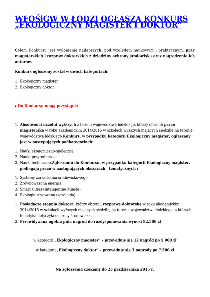 WFOŚiGW W ŁODZI OGŁASZA KONKURS „EKOLOGICZNY MAGISTER I DOKTOR” Celem Konkursu jest wyłonienie najlepszych, pod względem naukowym i praktycznym, prac magisterskich i rozpraw doktorskich z dziedziny ochrony środowiska oraz nagrodzenie ich autorów. Konkurs ogłoszony został w dwóch kategoriach: 1. Ekologiczny magister 2. Ekologiczny doktor ■ Do Konkursu mogą przystąpić: 1. Absolwenci uczelni wyższych z terenu województwa łódzkiego, którzy obronili pracę magisterską w roku akademickim 2014/2015 w szkołach wyższych mających siedzibę na terenie województwa łódzkiego Konkurs, w przypadku kategorii Ekologiczny magister, ogłaszany jest w następujących podkategoriach: 1. Nauki ekonomiczno-społeczne, 2. Nauki przyrodnicze, 3. Nauki techniczne.Zgłoszeniu do Konkursu, w przypadku kategorii Ekologiczny magister, podlegają prace w następujących obszarach tematycznych : 1. 2. 3. 4. Systemy zarządzania środowiskowego, Zrównoważona energia, Smart Cities (Inteligentne Miasta), Ekologia stosowana (sozologia). 1. Posiadacze stopnia doktora, którzy obronili rozprawę doktorską w roku akademickim 2014/2015 w szkołach wyższych mających siedzibę na terenie województwa łódzkiego, a których tematyka dotyczyła ochrony środowiska. 2. Przewidywana ogólna pula nagród do rozdysponowania wynosi 82.500 zł w kategorii „Ekologiczny magister” – przewiduje się 12 nagród po 5.000 zł w kategorii „Ekologiczny doktor” – przewiduje się 3 nagrody po 7.500 zł Na zgłoszenia czekamy do 23 października 2015 r. Więcej informacji znajduje się na stronie: www.zainwestujwekologie.pl